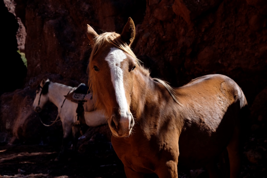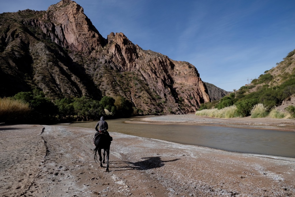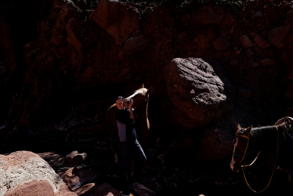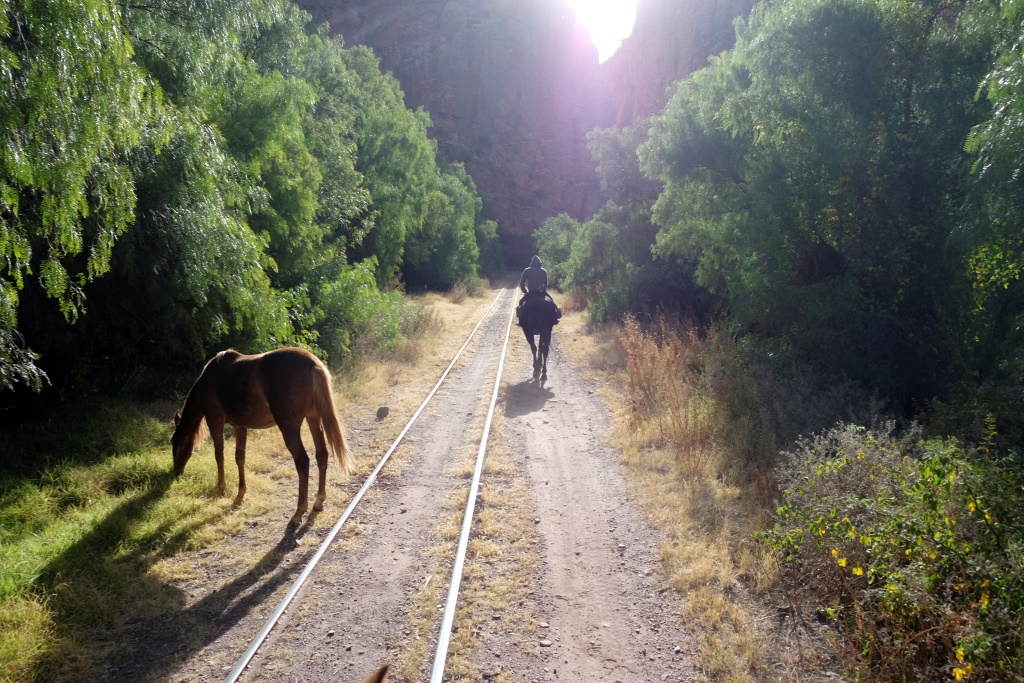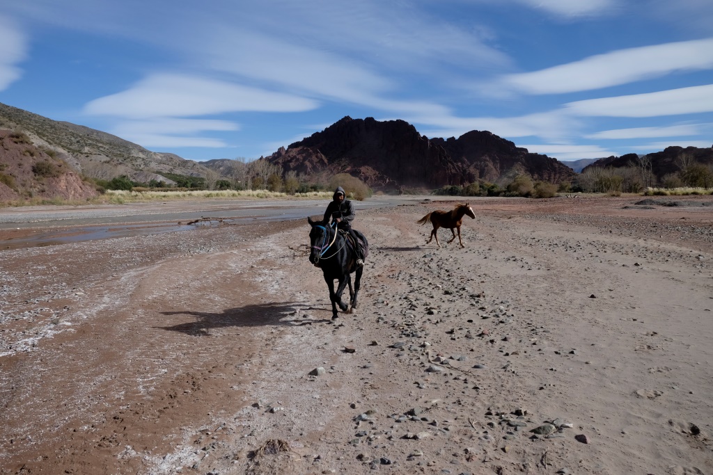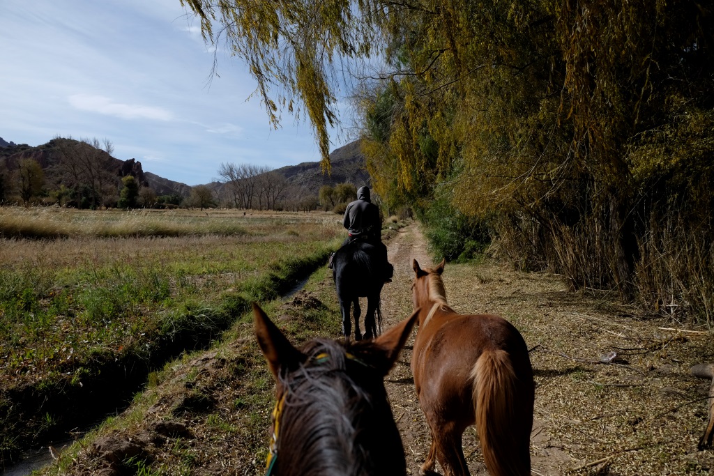 Man šodien ir tas gods sēdēt mugurā Staram, milzīgam brūnam kumeļam, gids jāj uz melnas Sēnes, bet mūs pavada divus gadus un trīs mēnešus vecā Medus. Kad tiekam prom no pilsētas nomales, sākas mežonīga ainava – kalni, vientuļi ceļi, brīžam jājam pa izžuvušu upes gultni. Pirmajā atpūtas pauzē mūs panāk vēl viena četru cilvēku grupa, kas ir devušies divu dienu pārgājienā. Izmantojot situāciju, palūdzu, lai jaunieši mani nobildē ar Medu. Kamēr es šo bužinu un pozēju, kumeļš izdomā man ostīt kakla rajonu, kas beidzas ar vieglu kodienu ausī. Šodien arī es fočēju uz nebēdu un man šķiet, ka izdevās kāds labs portrets un attiecīgi varu piešķirt dienu Anonīmajam pasūtītājam, par kura konstanto atbalstu visās jomās esmu ļoti pateicīga.