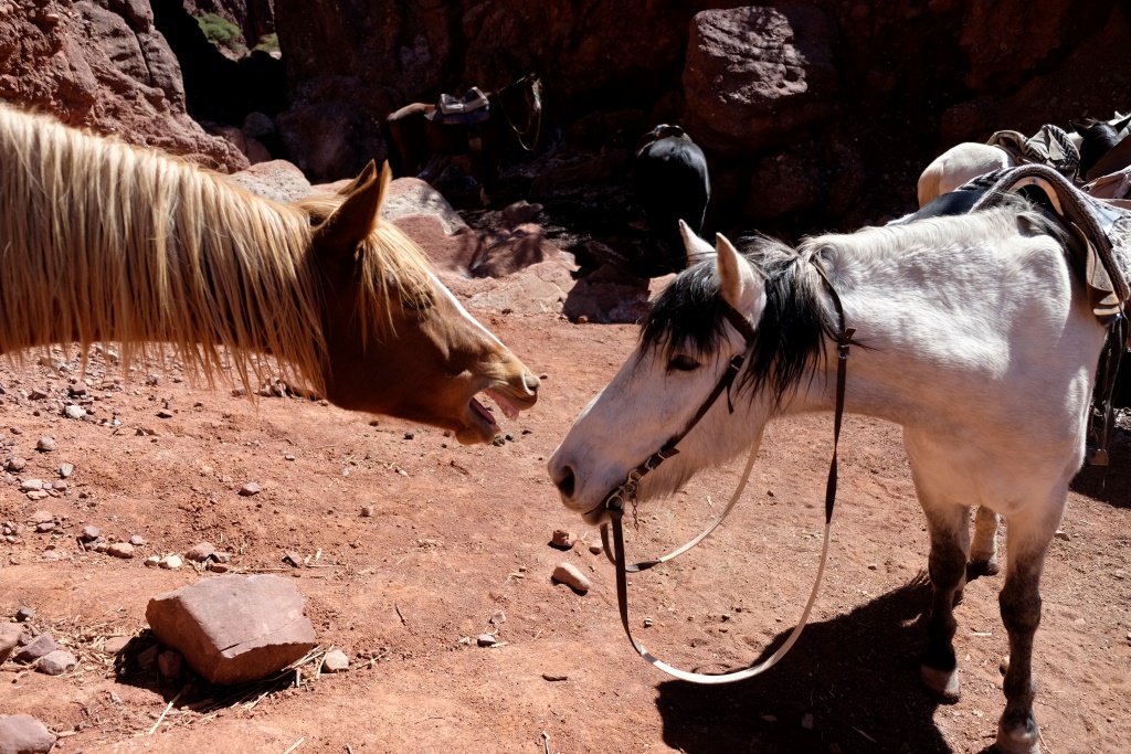 Pusdienu pauzē gids piesien zirgus pie koka un izvelk ēdamo mums pašiem. „Un zirgiem?”, es prasu. Viņš paskaidro, ka melnais zirgs ēdot visu, bet mans, brūnais, neēdot neko. Izmēģinu iebarot abiem maizi un kartupeli – melnais apēd visu, ka šņakst, brūnais apviļā kartupeli un izspļauj. Paēdis gids tomēr apžēlojas par četrkājainajiem un piesien šos netālā zālājā, lai pamielojas.