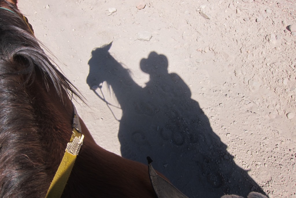 Viss jau būtu labi, ja vien līdz mājām nebūtu vēl pāris stundas, bet mani spēki – izbeigušies. Galvas sāpes sen jau aizvietojušas dibena sāpes, bet tagad tās pārmāc ceļu sāpes. Bet neko nevar darīt, esam nekurienes vidū un līdz pilsētai jātiek. Arī vējš, kā par spīti, nes pretim necaurredzamus putekļu mākoņus – es aizmiedzu acis un paļaujos uz zirgu. Lamāju sevi, kāpēc es tomēr neizvēlējos 5 stundu maršrutu, tas būtu bijis „kā reizi”. Īsāk sakot, ja jums nav dižas jāšanas pieredzes – nesāciet ar 7 stundām, tāds silts ieteikums.