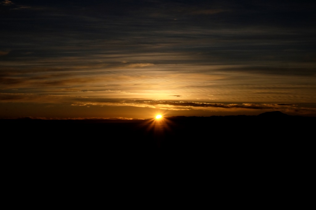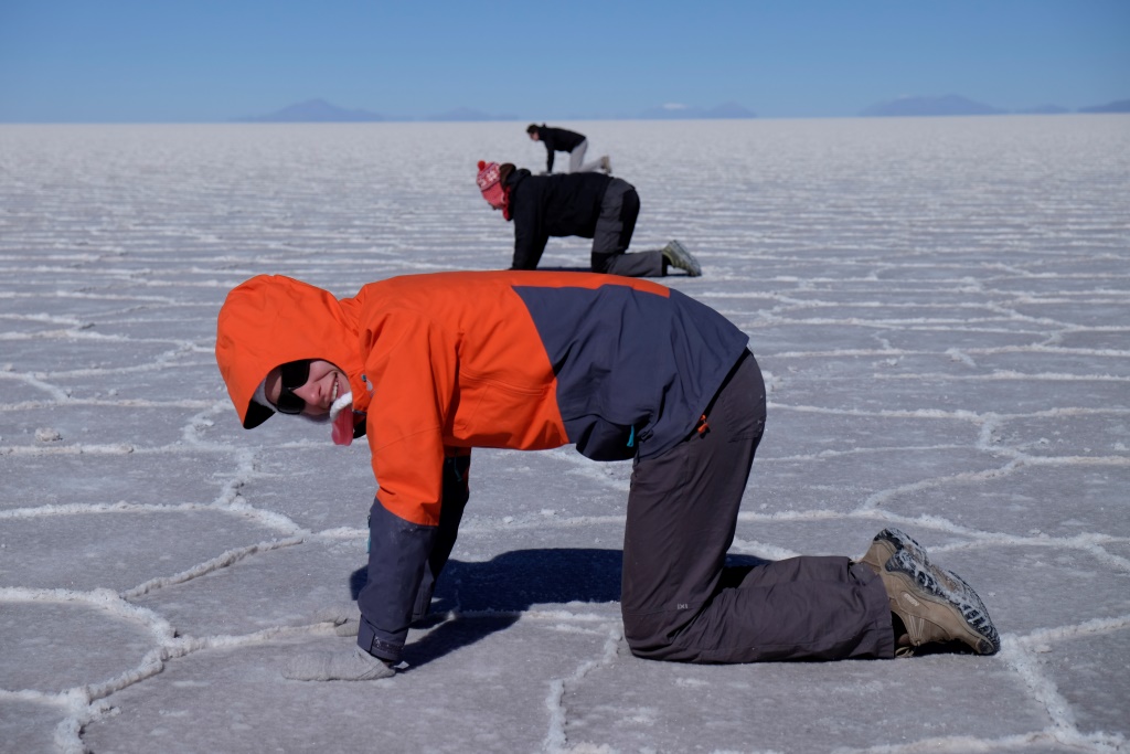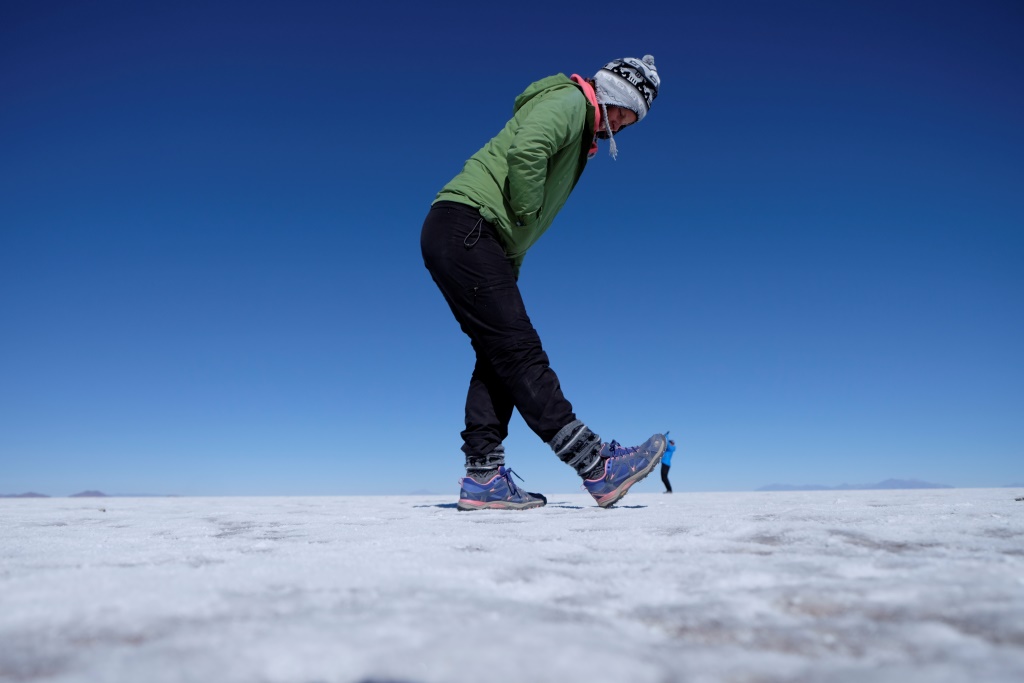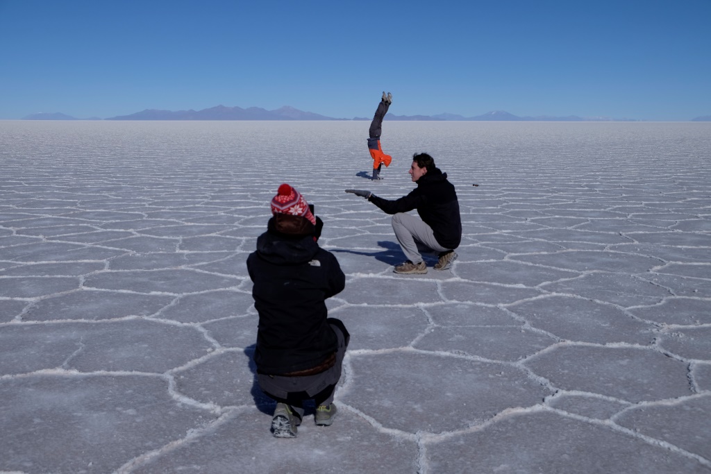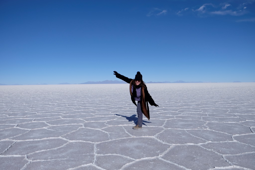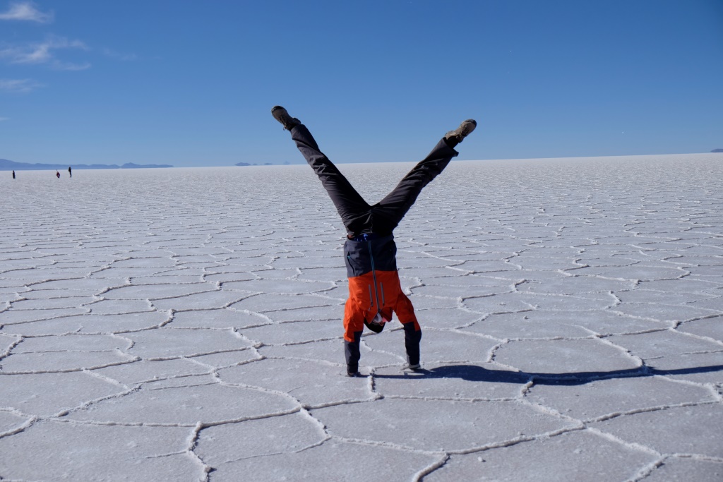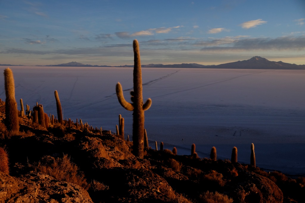 Jā, sāls sienās ir cita gulēšana, šī nakts arī bija mazliet siltāka nekā divas iepriekšējās. No rīta izbraucam pussešos, lai paspētu uz saullēktu virs Ujuni. Džips slīd pa līdzeno virsmu teju bez trokšņa, pagaidām mūs pavada apaļš mēness. Vēl tumsā piestājam pie neliela kalna sāls līdzenuma vidū. Līdz ar pirmajiem soļiem kalnā, sāk tapt gaišāks un brīdī, kad esam sasnieguši kori, zeme ir gatava saulei, kas parādās virs apvāršņa. Cilvēki, kaktusi, akmeņi un sāls lauks – viss top apzeltīts vienā mirklī. Safotografējušies ar kaktusiem, kāpjam lejā, kur mūs gaida karsta kafija un Lurdesas ceptais kēkss.
