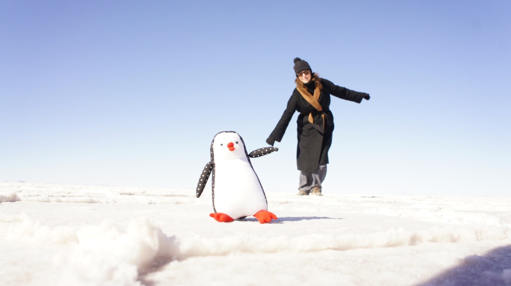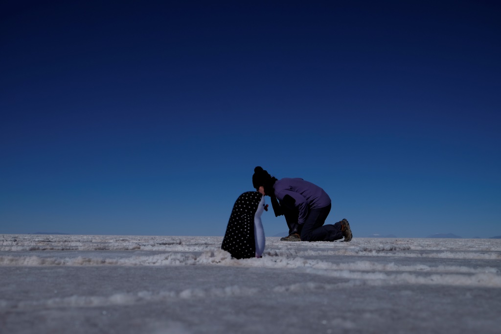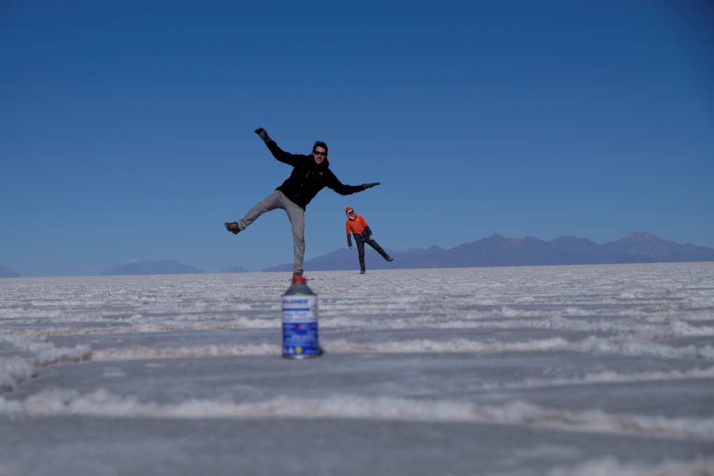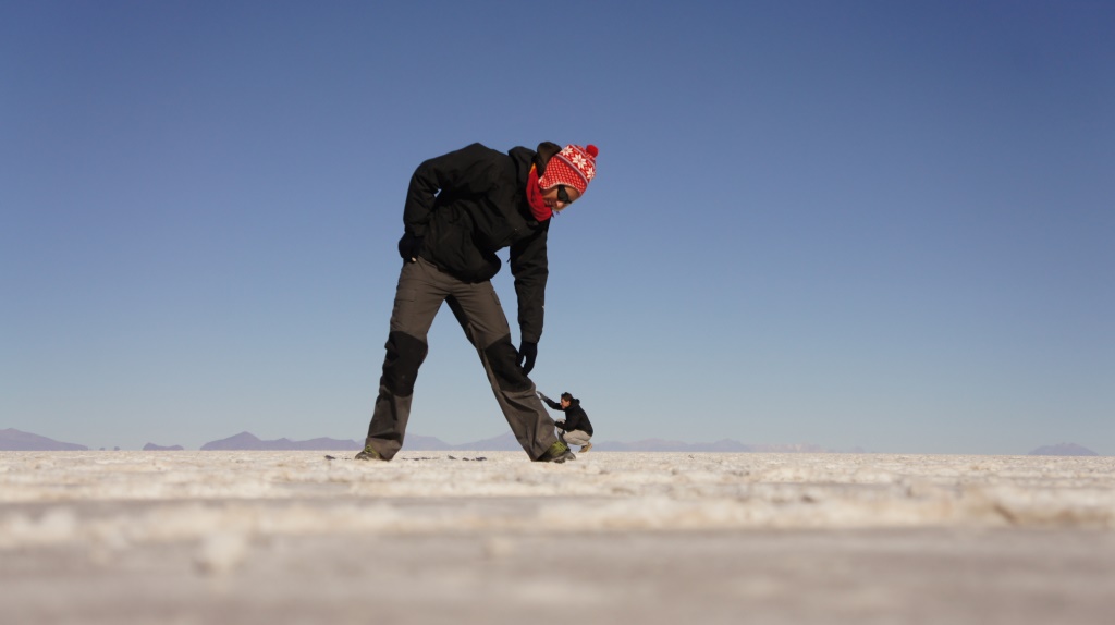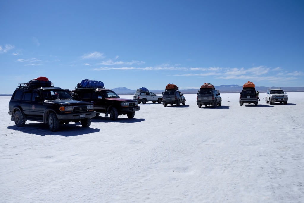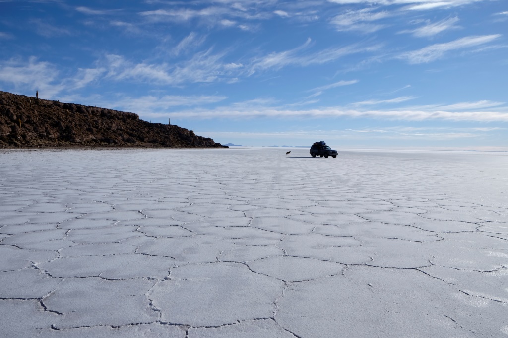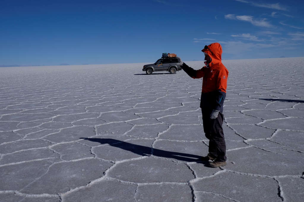 Pēc pastaigas mūs savāc džips un dodamies salončaka vidū, lai priecātos par balto apkaimi un veiktu foto sesiju – baltums un plašums ļauj rotaļāties. Mums gan nākas pieturēt mazliet agrāk – džipam uzvārījies motors. Lai arī mūsu tūrisma kompānija skaitās viena no stabilākajām, auto puiši remontēja katrā naktsmītnē un vēl pāris reizes pa dienu. Atvēsinājuši motoru, tiekam pie foto vietas un vienu stundu mums ir „fantāzijas upei vārti vaļā”. Ko tur daudz komentēt – skatiet bildes!