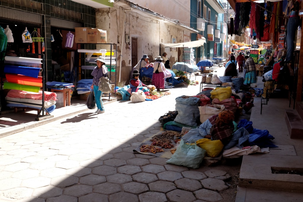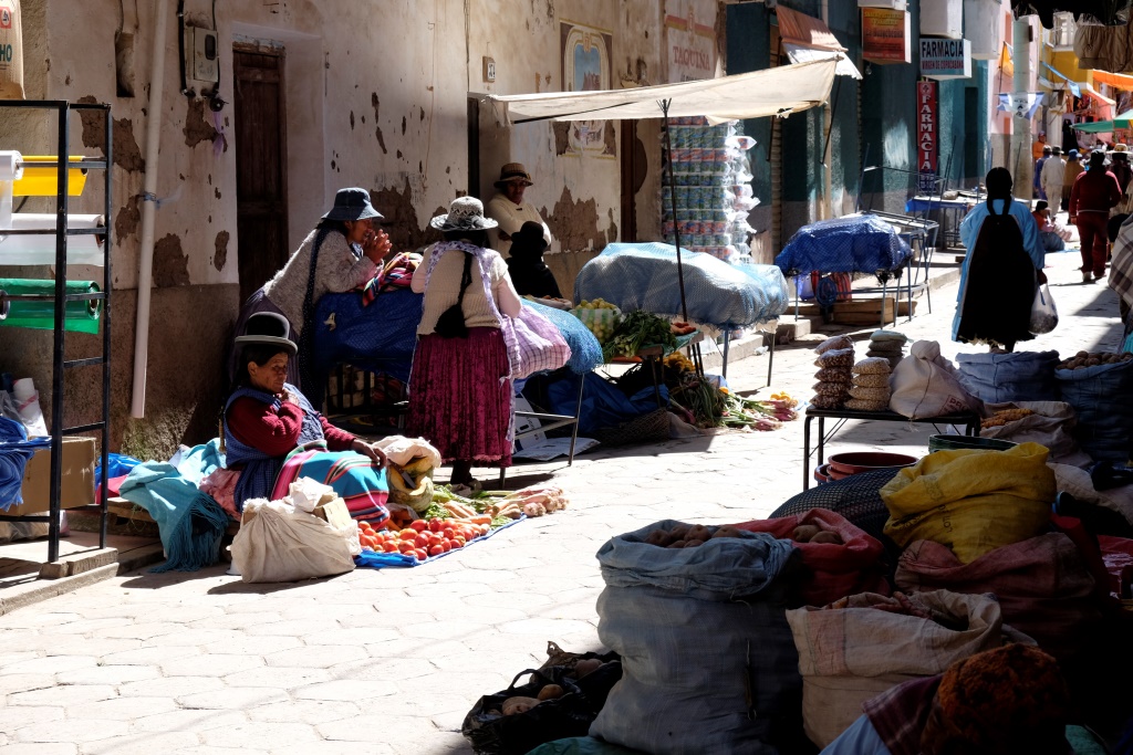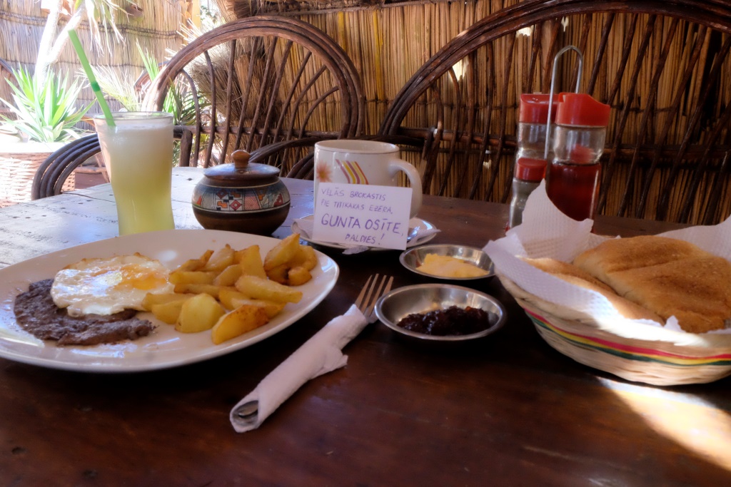 No rīta viss izskatās priecīgāk, arī Copacabana. Izstaigāju nelielo pilsētiņu, sabildēju tirgu un baznīcu, tad dodos ieturēt vēlas brokastis. Salīdzinoši dārgais hostelis tādas nepiedāvāja, attiecīgi esmu izbadējusies un nolēmusi izmantot Guntas Osītes novēlējumu – apēst vienas kārtīgas brokastis. Tādas arī pasūtu un kopā ar melnbaltu kaķi pieēdamies pēc pilnas programmas. Paldies, Gunta!