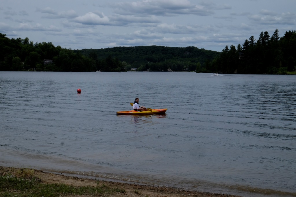 Pēc brokastīm esam gatavi pavingrot, DžīEs izvelk ko garāžas divus kajakus, uzstutē uz pašbūvētiem ratiem un mēs dodamies ezera virzienā. Iesākumā aizairējam līdz vietai, kur ezers pārtop upē – dēļ nelielām slūžām tālāk ar laivām tikt nevar. Tad airējam otrā virzienā – DžīEs aizbrauc nodot laivu Rafaēlam, es apvaicājusies, vai drīkstu izmest lociņu uz otru pusi un saņēmusi apstiprinājumu, turpinu ceļu. „Tikai turies tuvumā krastam, tās laivas te ir trakas”, DžīEs piekodina. Jā, katru reizi, kad garām patraucas kāds no kuteriem, kajaks jāsagriež perpendikulāri viļņiem un tie „jāpārdzīvo”. Gribu redzēt, kas ir aiz līkuma un ceru atrast kādu civilizācijas neskartu ainavu, bet nonākusi tur, konstatēju, ka arī pārējā ezera krasts izskatās tieši tāpat – cita pie citas satupušas vairāk un mazāk greznas mājas, teju pie katras gozējas kāds peldlīdzeklis, laiva, kuteris, ūdens motocikls. Griežu riņķī un, tā kā atpakaļ gribu doties gar otru krastu, novērtējusi, ka tuvumā nav nevienas laivas, airējos pāri ūdens klajam. Kad esmu vidū, tās sāk braukt no visām pusēm. Tad nu pieķeros airim no visa spēka un pēc pāris minūtēm esmu prom no ūdens nezvēru ceļa.