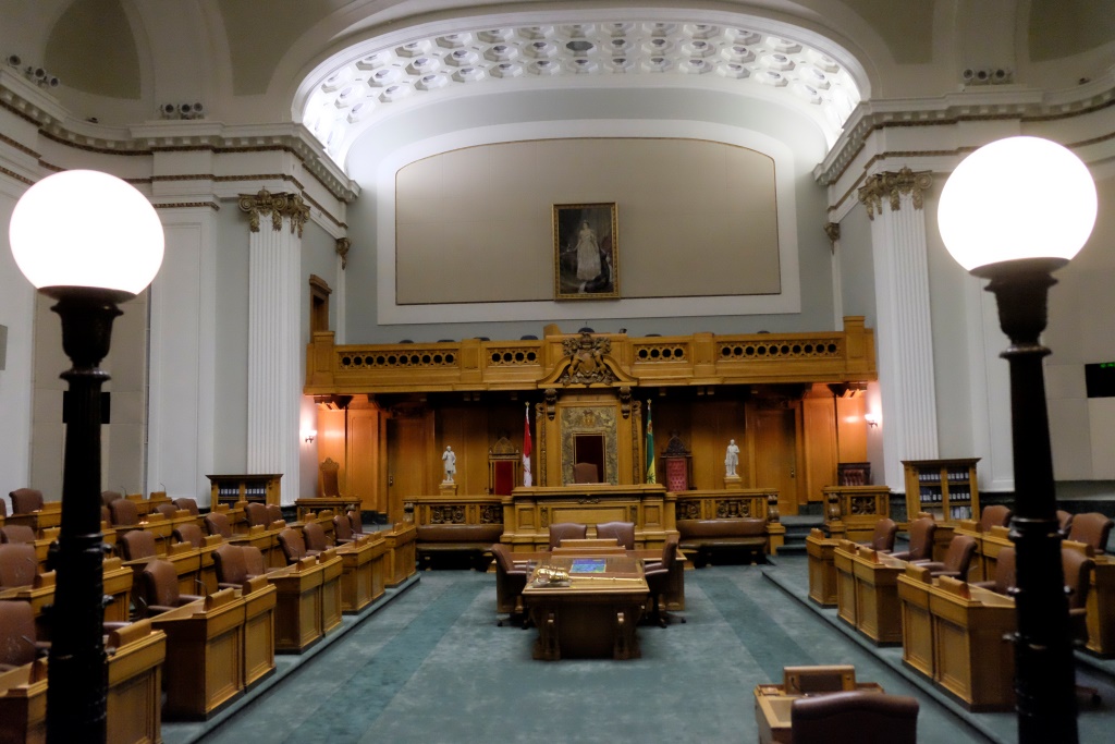 Esam ieradušies precīzi uz ekskursijas sākumu un varam apskatīt sēžu zāli, bibliotēku un citas provinces vadības darba telpas. Pie sienām var aplūkot visu spīkeru un premjeru portretu gleznas. Mūsu uzmanību vairāk saista indiāņu gleznas – viena galerija veltīta vietējo cilšu vadoņiem. Zem gleznām gozējas indiāņu vārdi, piemēram, „Sēdošais bullis”, „Negaisa lācis” un tamlīdzīgi. Gide stāsta, ka pirmais vārds bieži vien indiāņiem ticis piešķirts uzreiz pēc piedzimšanas – ko māte pirmo ieraudzījusi, izejot laukā no vigvama (jeb kā to šeit dēvē – tipi), tādu vārdu arī devusi. Man, protams, nāk prātā visādas amizantas situācijas – ko tik netīšām nevar pirmo ieraudzīt. Pēc tam nākamie vārdi tikuši piešķirti jau pamatojoties uz personas īpašībām un sasniegumiem dzīvē.
