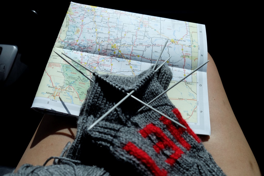 Paveikuši ierastos rīta rituālus, braucam uz šī kalna (un apkaimes) augstāko vietu. Vakar rāpāmies ar mašīnu augšup ļoti pakāpeniski, tāpēc, kad ieraugām, cik augstu esam uztikuši, esam diezgan pārsteigti. Mūsu kalns ir vienīgais šajā apkaimē, pārējā ainava, cik tālu acs sniedzas – vieni līdzenumi, kas mums tā apnikuši. Tomēr arī šodien lielākā dienas daļa paiet traucoties caur tiem. Tā kā stūrē Rafaēls, es varu izklaidēties ar rakstīšanu un adīšanu, kā nebūt īsinot laiku. Esam iebraukuši Albertas provincē, šeit ir diezgan smieklīgi apdzīvotu vietu nosaukumi – Medicine Hat, Manyberry (gandrīz kā Dižsēņi), Seven personas utt.