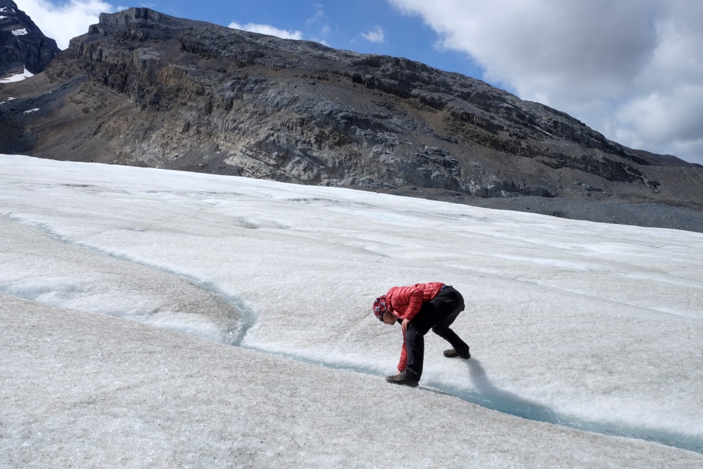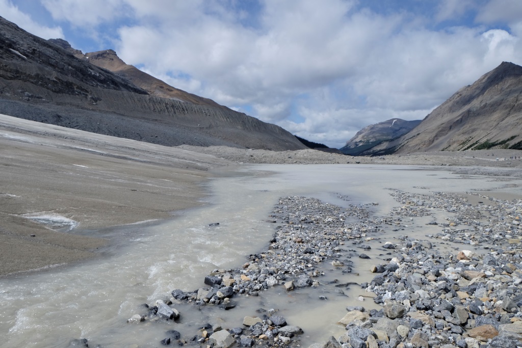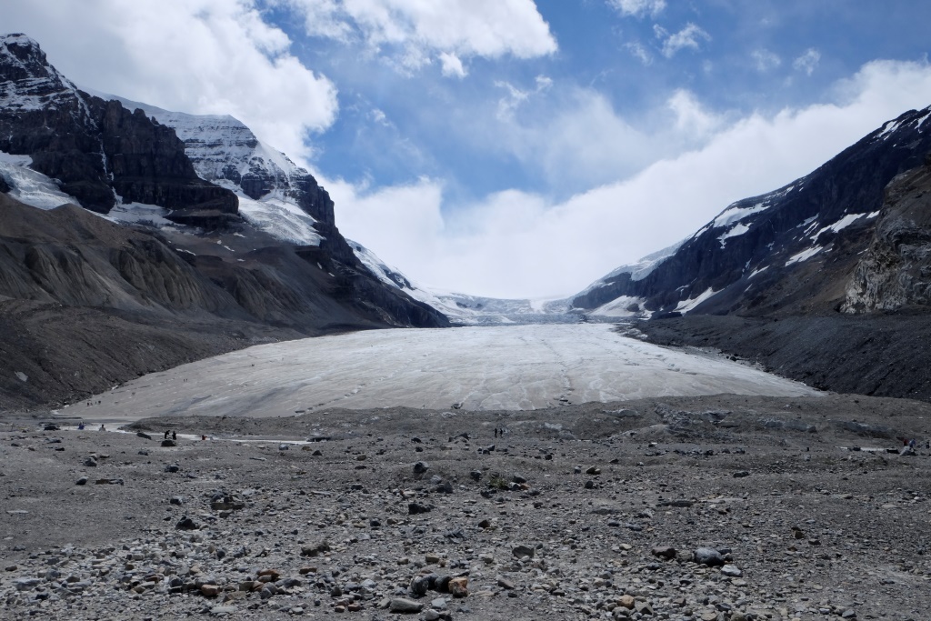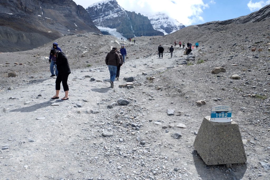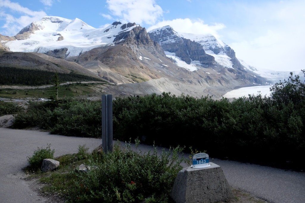 Galvenais apskates objekts šodien ir Athabasca ledājs, viens no milzīgā Kolumbijas ledus lauka atzariem. Kopš 1885. gada šis ledājs ir zaudējis 60% no sava apjoma – vairāk nekā 350 miljonus kubikmetru ledus. Nemaz nav jāskatās tik tālā pagātnē. Kalna nogāzē slejas plāksnīte, kur šis ledājs atradies 1982. gadā. Šķiet teju neticami, ka laikā, kas īsāks par manu mūžu, ledājs sarucis par vairākiem simtiem metru.