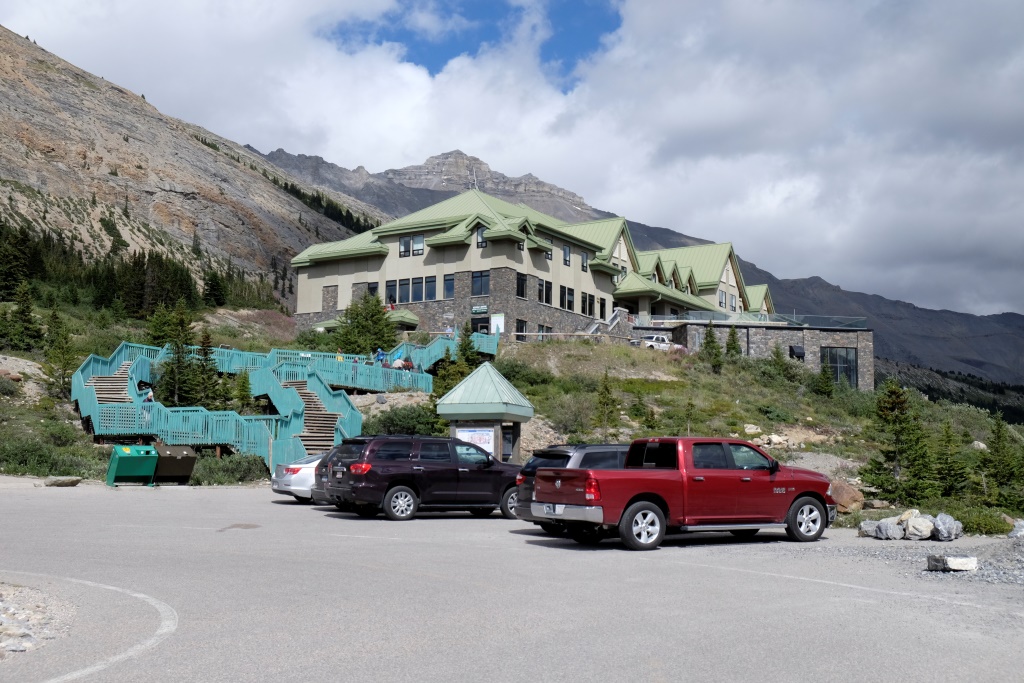 Apmeklējam arī netālu esošo „Ledus lauku centru”. Ekspozīcija, kuru bijām cerējuši apskatīt, ir slēgta, galvenais bizness šeit ir tirgot biļetes uz kādu no divām atrakcijām – ar speciālu autobusu var uzbraukt uz ledāja, kā arī iespējams apmeklēt „Sky walk” – stikla terasi, kas slejas augstu gaisā virs ledājiem. Abu atrakciju cenas ir nepiedienīgas, tomēr tas nav vienīgais arguments, lai tās izlaistu. Kad, paēduši pusdienas, atgriežamies foajē, kur var iegādāties biļetes, tur ir tādas cilvēku masas, ka gribas mukt prom nekavējoties.