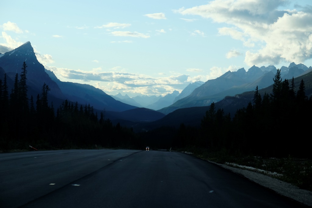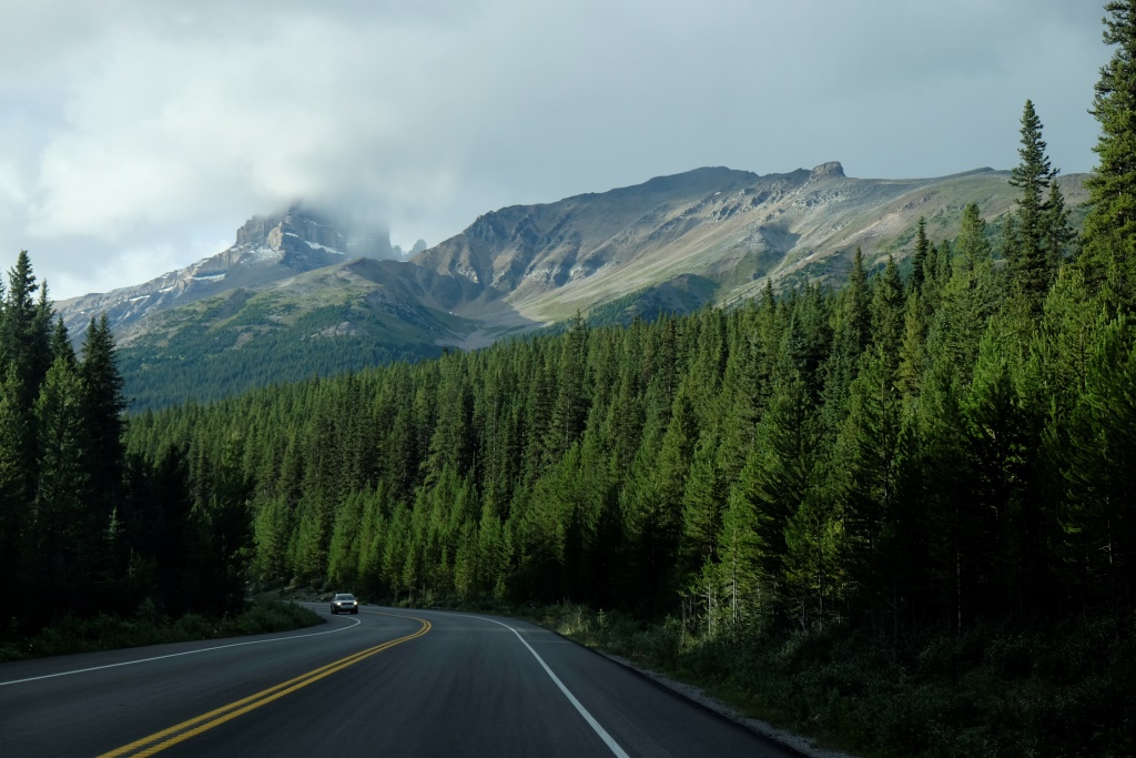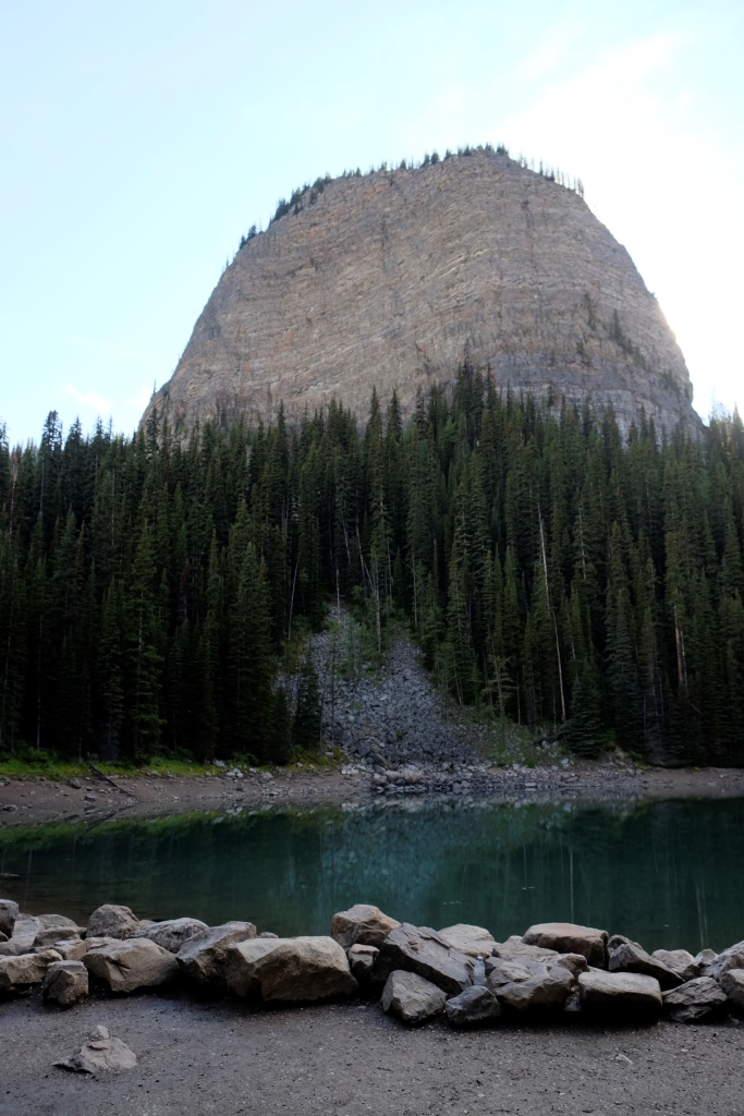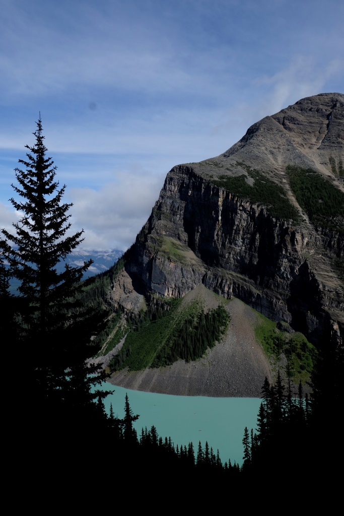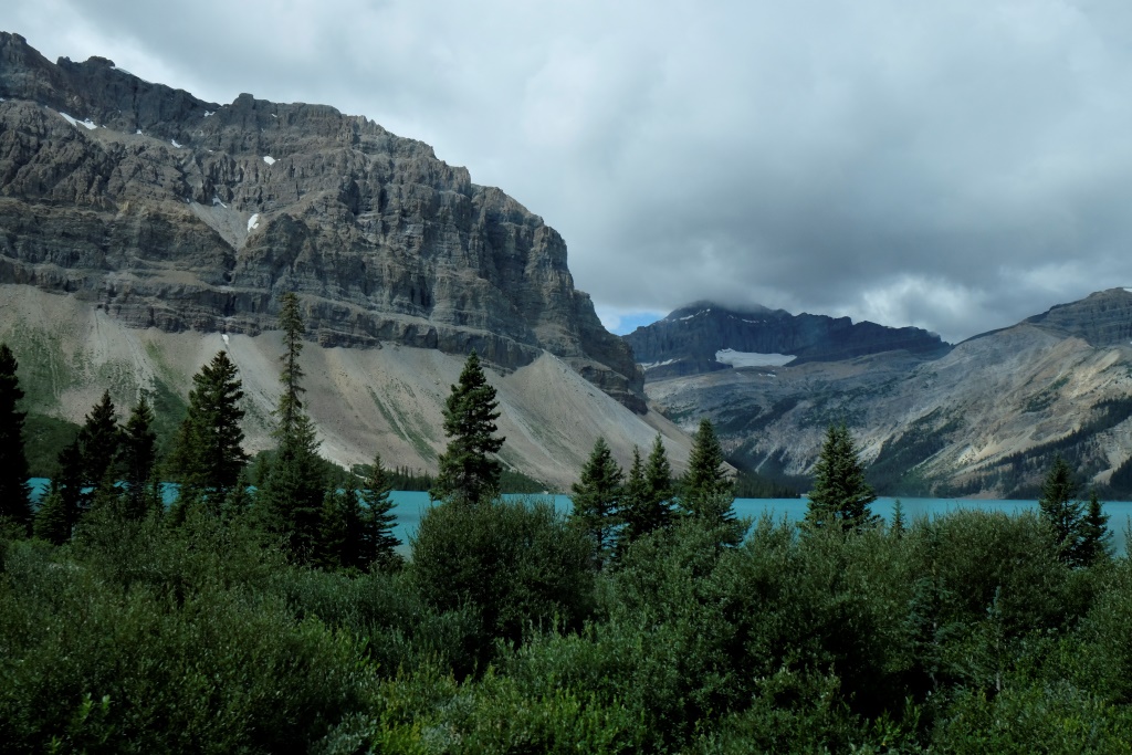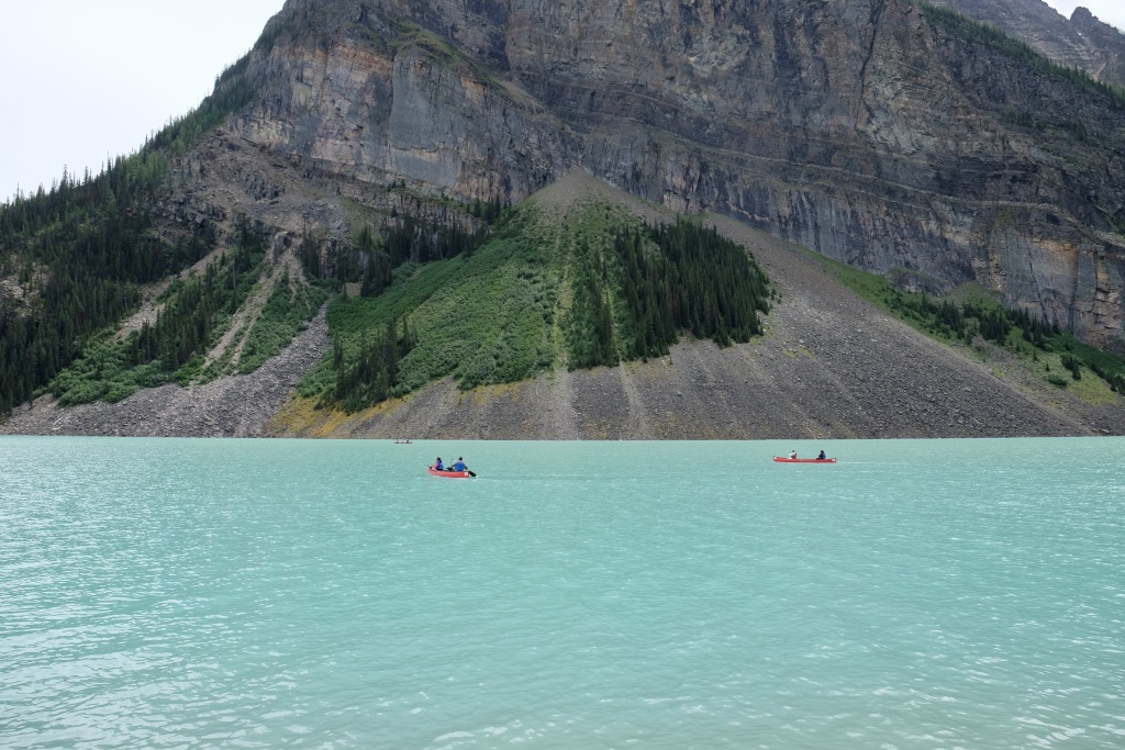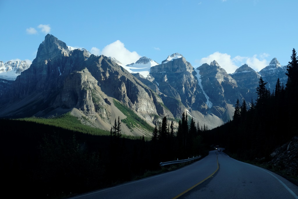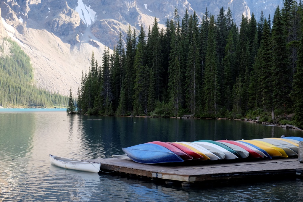 GPSa baterijas gan neizturēja šo kāpienu, bet mans pieņēmums ir, ka šodien esam pievarējuši kādu 17 – 18 km. Katrā ziņā kājas īd, ka vienai dienai būs gana staigāts. Vēl tikai ar auto aizšaujam līdz netālajam Morēnas ezeram, kura kalnu ainava savulaik gozējās uz 20 Kanādas dolāru naudaszīmes.