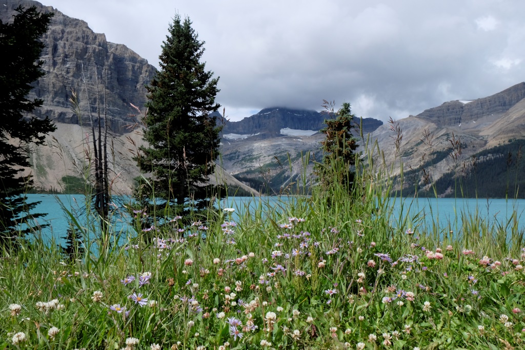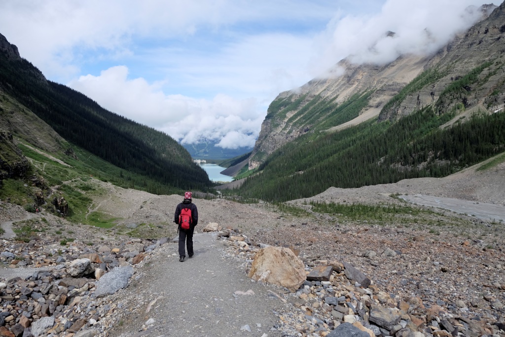 Izgājuši no namiņa, jūtamies kā nonākuši citā pasaulē. Ārā spīd spoža saule, ne vēsts no lietus un mākoņiem. Mūžīgi mainīgais kalnu klimats! Tagad var labi aplūkot apkaimes ledājus, arī Luīzes ezers spoguļojas pavisam tālu lejā. Gardās maltītes spēcināti, tupinām ceļu daudz jestrāk. Atpakaļ dodamies pa citu maršrutu, lai dzīve interesantāka. Ugunspuķu (tagad zinu, ka angliski tās sauc par Uguns nezālēm, Fireweed) liesmas virmo zaļo nogāžu vidū, taka brīžam ved pa pļavām, tad atkal pa mežu. Ik pa laikam šķērsojam lavīnu izgrauztus tuneļus – lielā sniega masa šajās vietās aizrāvusi līdzi visu, kas bijis tai ceļā. Taka ved gar Spoguļezeru, mirkli piesēžam un paspoguļojamies.