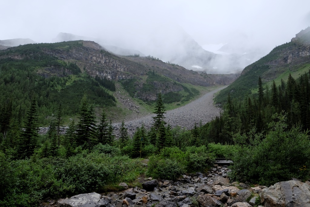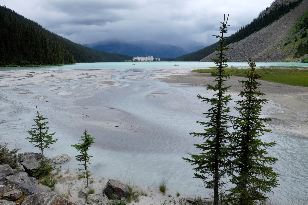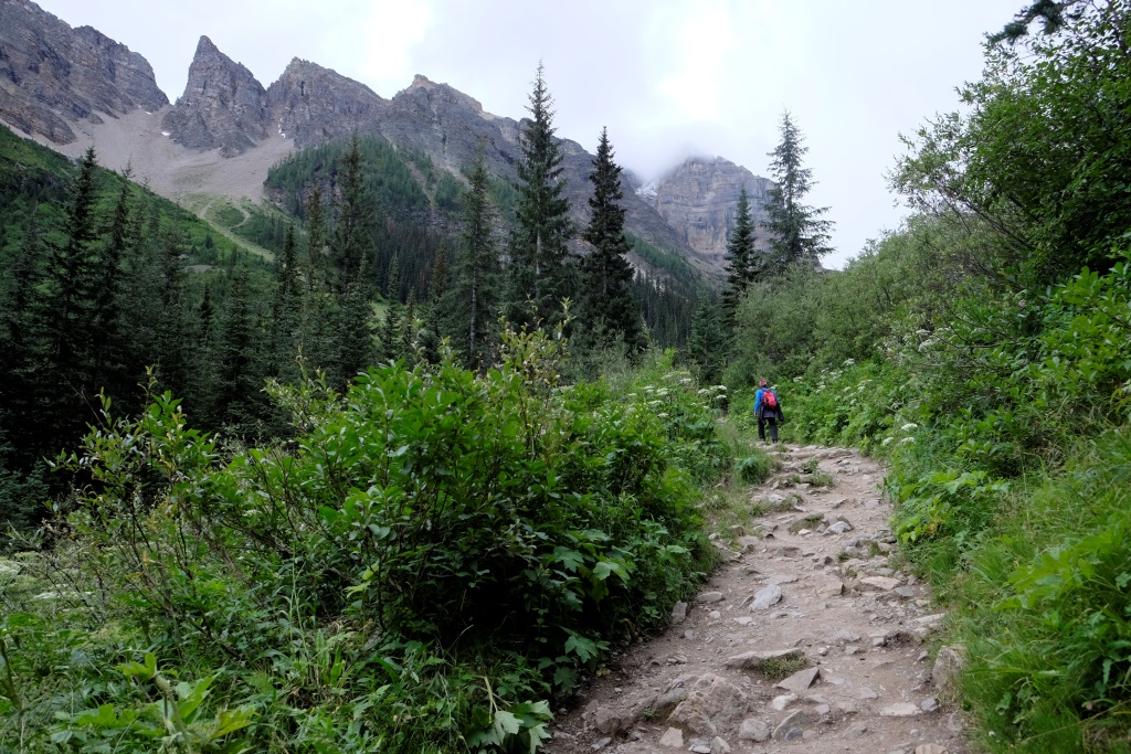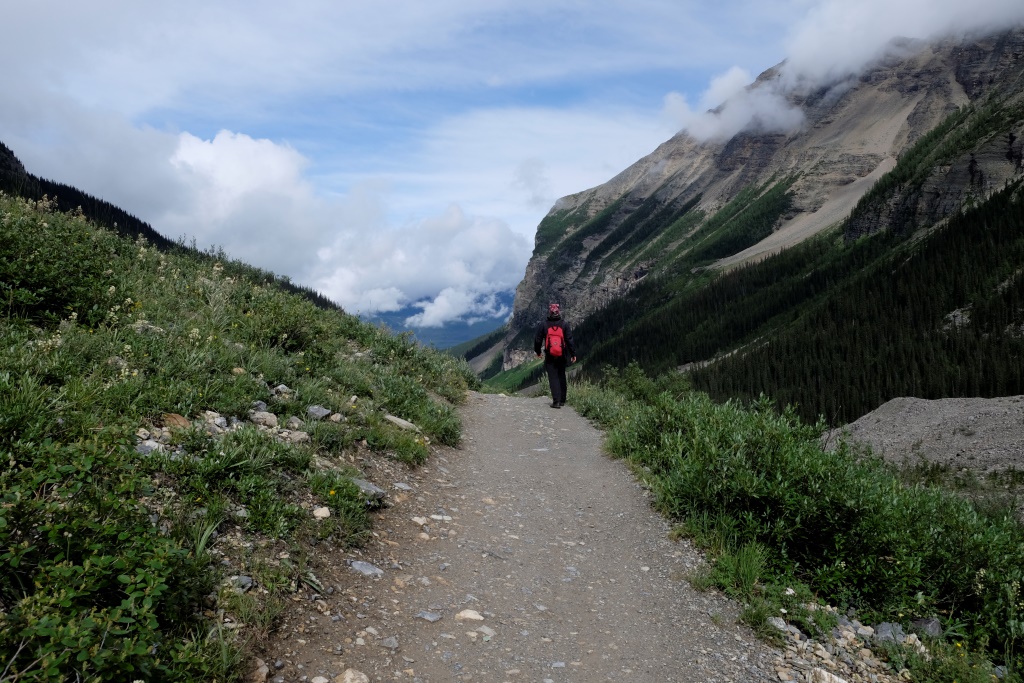 Par spīti aizdomīgajam laikam, nolemjam iziet vienu no Luīzes ezera apkaimē pieejamiem maršrutiem. Pats ezers arī ir skaists bez gala, bet, pateicoties tā pasaules slavai, ļoti apmeklēts. Arī milzīgā viesnīca ezera krastā izskatās nedaudz nepiedienīgi. Priecājamies pazust kalnos un mežos, kur ir drusku mierīgāk. Lietus velkas, velkas un savelkas, sīka līņāšana tiek papildināta ar maziem krusas graudiem, bet pēc brīža lietus jau bungā ar pamatīgu entuziasmu. Es arī neesmu vakarējā – man mugurā jaunā pretlietus jaka un pāri tai vecais pančo. Ir drusku karsti, bet lietus klāt netiek. Šoreiz Rafaēls ir aizsteidzies uz priekšu, tiksimies tējas namiņā. Apkārtējie kalni tīti lietus un miglas mākoņos, arī ezeru vairs neredz aiz pelēkas sienas. Atliek vien sakoncentrēt domas un spēkus, lai ātrāk nonāktu pie siltas tējas.