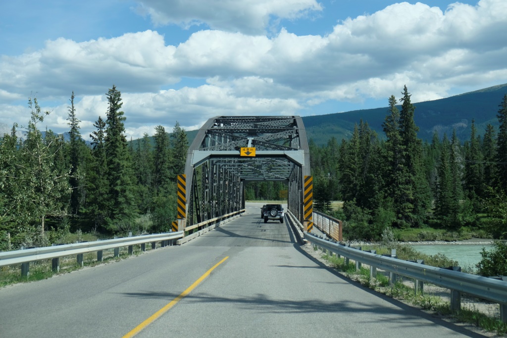 Sākumā aizejam līdz mūsu kempinga galam un tad gribam paieties mazu gabaliņu pa meža stigu, bet atpakaļ atgriezieties pa taku gar upi. Kad esam nogājuši pārdesmit metrus, ieraugām, ka mums pakaļ jož kāds jaunietis. Apstājamies un klausāmies, ko viņš grib vēstīt. Vien to, ka pirms neilga brīža 300 metrus no šejienes aizbaidīts lāča mazulis un, tā kā kļūst tumšs, viņš mūsu vietā mežā vis neietu. Ok, pateicamies paldies par brīdinājumu, paķeram no telts „bear spray”, kas mums nebija līdzi un ejam otrā virzienā – prom no meža, pavērosim upi no veca tilta perspektīvas. Upe čalo savus vakara stāstus un virs egļu galiem „izpeld mēness sarkaniem ragiem”. Šonakt ir pilnmēness.