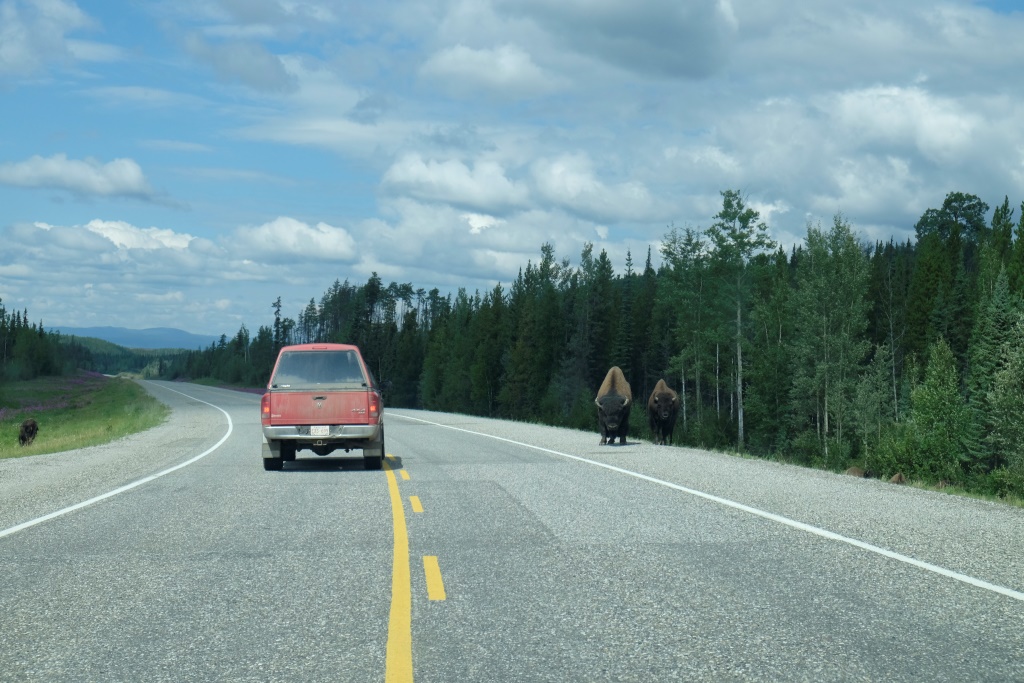 Šodien atkal „uzskrējām” bizonu baram. Lielākā daļā zvēru ganījās vienā ceļa malā, bet divi brangi eksemplāri, dusmīgi rūkdami, gaidīja, kad mēs pabrauksim garām, lai varētu šķērsot ceļu. Tie dzīvnieki tuvmā ir TIK milzīgi! Negribētos ar viņiem sastapties ārpus mašīnas.