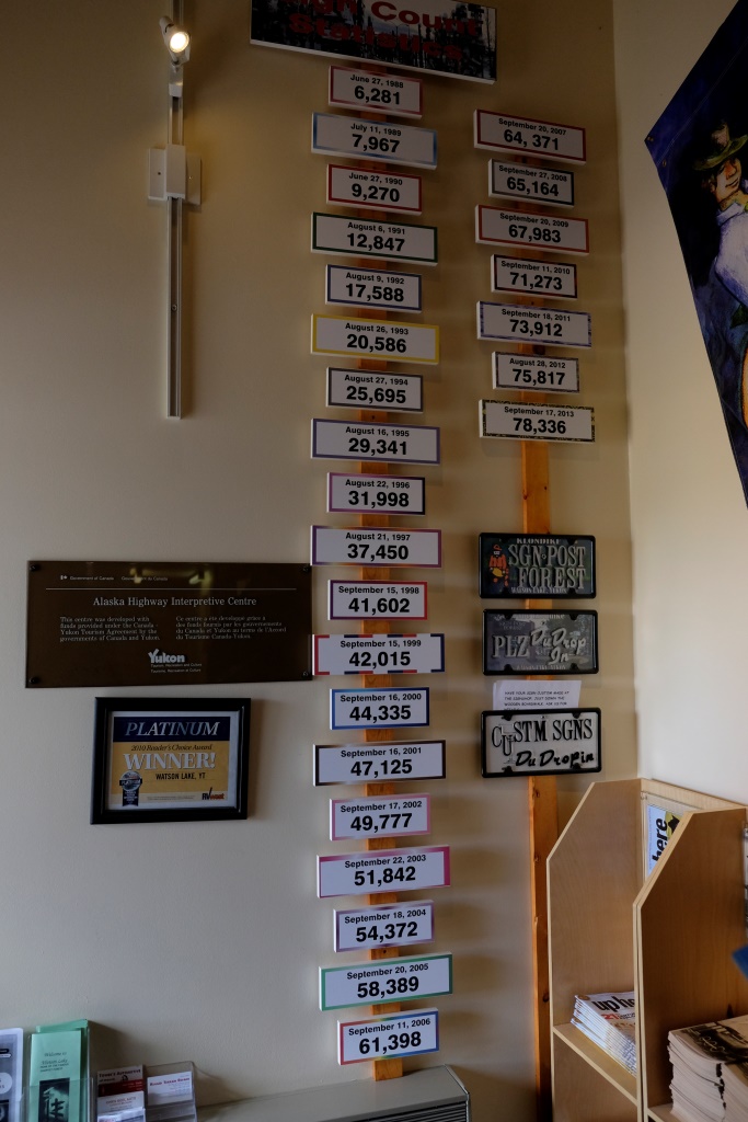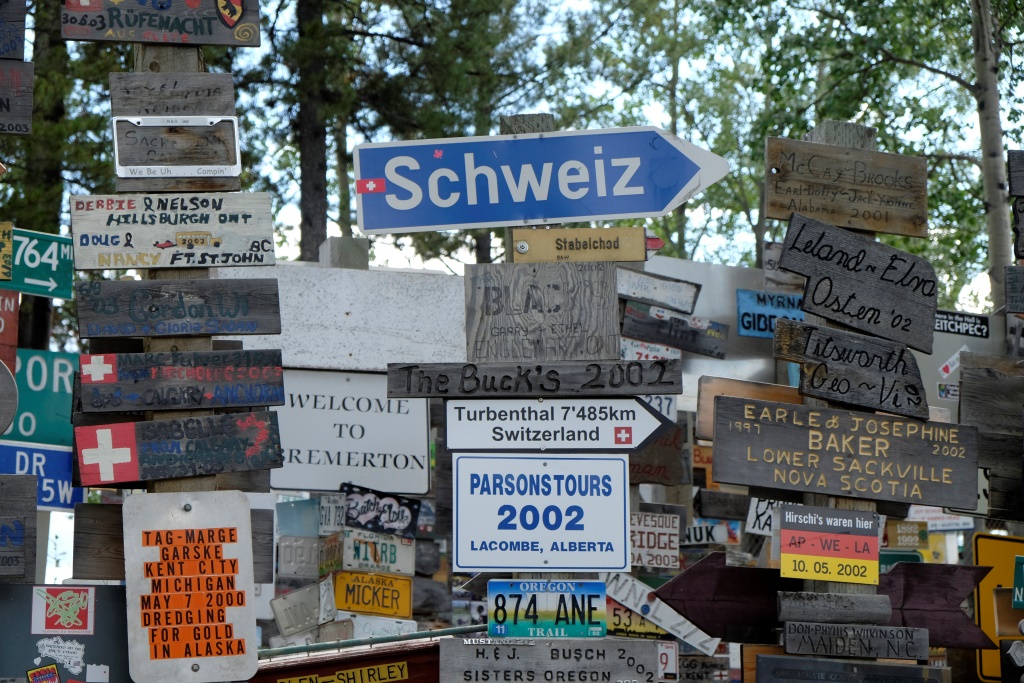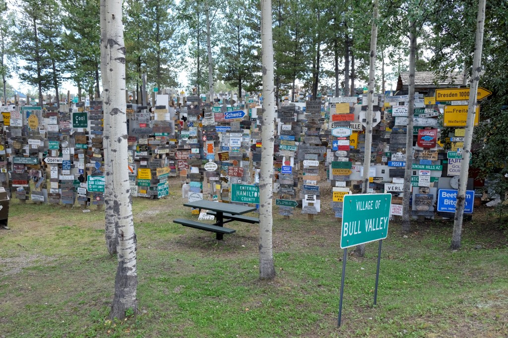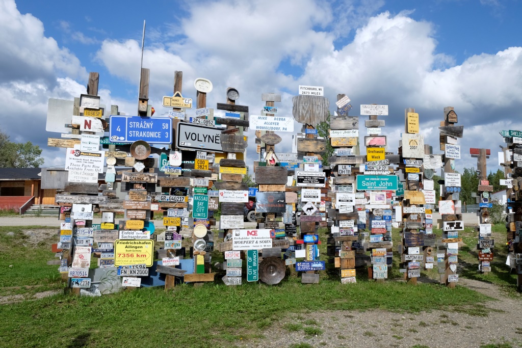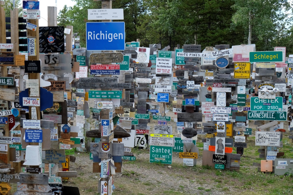 Interesantākā pieturas vieta, viennozīmīgi, ir Watson lake ceļa zīmju mežs (http://www.watsonlake.ca/our-community/sign-post-forest/) . 1942. gadā, kāds Aļaskas šoseju būvējošs amerikāņu zaldāts, kurš šajā vietā atveseļojies, sajutis ilgas pēc mājām un uzstādījis šeit savas dzimtās vietas ceļa norādi, aizsākdams ceļa zīmju izvietošanas tradīciju. Tagad šeit ir plāksnīšu un ceļa zīmju mežs – 2013. gadā saskaitītas 78 336 zīmes. Tās visas nevar apskatīt un izlasīt. Klīstam kādu stundu un bildējam, mūsuprāt, interesantākos eksemplārus. Ļoti daudzas zīmes ir no Vācijas. „Skatoties uz tām, man sāk šķist, ka Vācijā vairs nav ceļa zīmju”, Markuss joko, piebilstams, ka nesaprot, kā dažas, ļoti iespaidīga izmēra plāksnes tikušas nogādātas līdz šejienei. Es, protams, cenšos ieraudzīt kādu vēsti no Latvijas, bet nekā, tuvākās, ko atrodu, ir no Čehijas un Polijas. Apvaicājos arī vietējā informācijas centra darbiniecei, kura teju ik dienu pastaigājas pa ceļa zīmju alejām ar savu suni, vai viņa kādreiz manījusi kaut ko no Latvijas, bet viņa groza galvu – neesot vis. Būtu es iepriekš zinājusi par šādas vietas eksistenci, būtu kaut ko sadzejojusi, tagad negribu kavēt savus ceļabiedrus. Nobildējos vien ar paldies plāksnīti Mišelai – veltīju viņai laisko vakardienu, jo tā bija tieši tik meitenīga ka Mišela bija vēlējusi – ar dubļu procedūrām, mirkšanu ūdenī un tai sekojošu manikīru un pedikīru; kas par to, ka pašrocīgi veiktu.