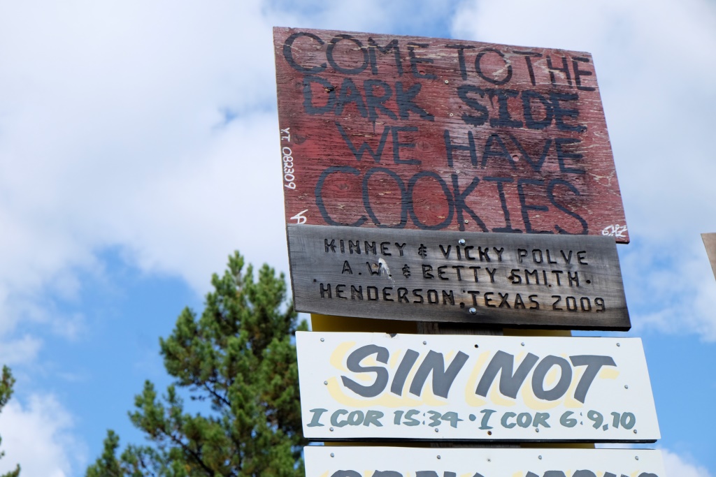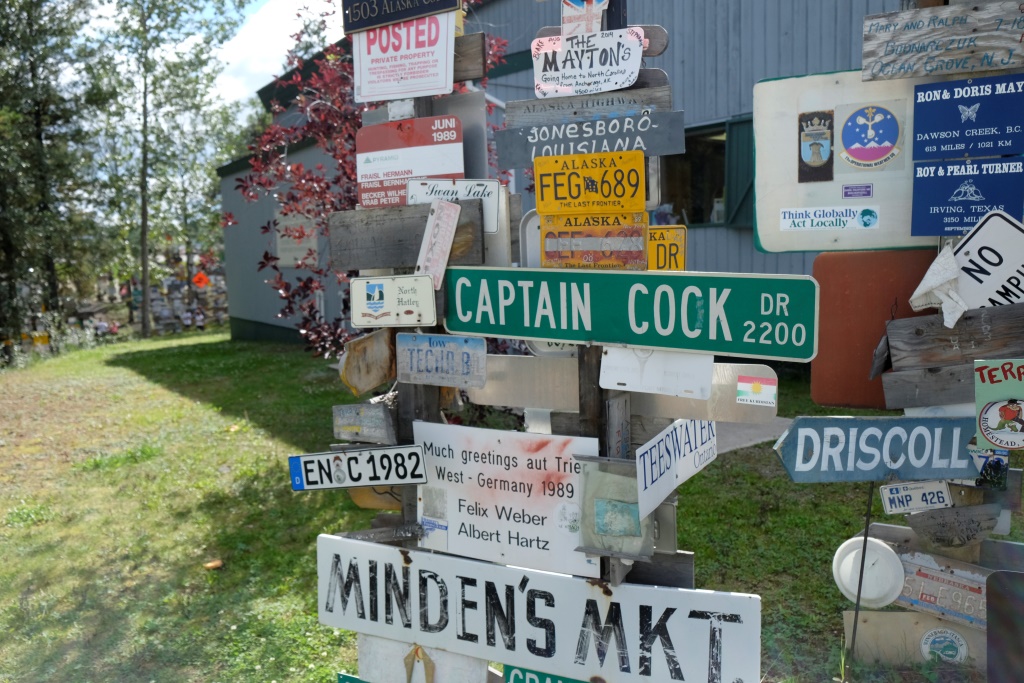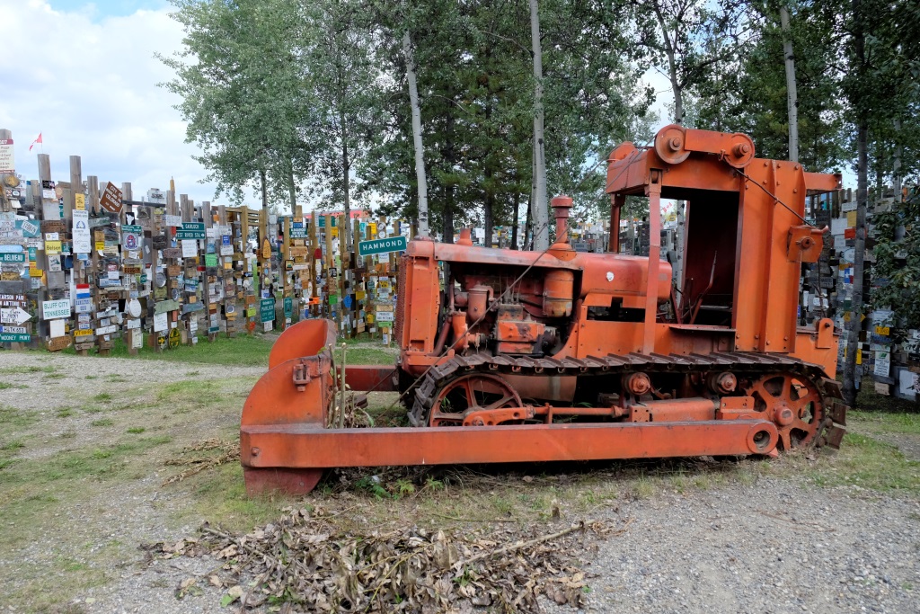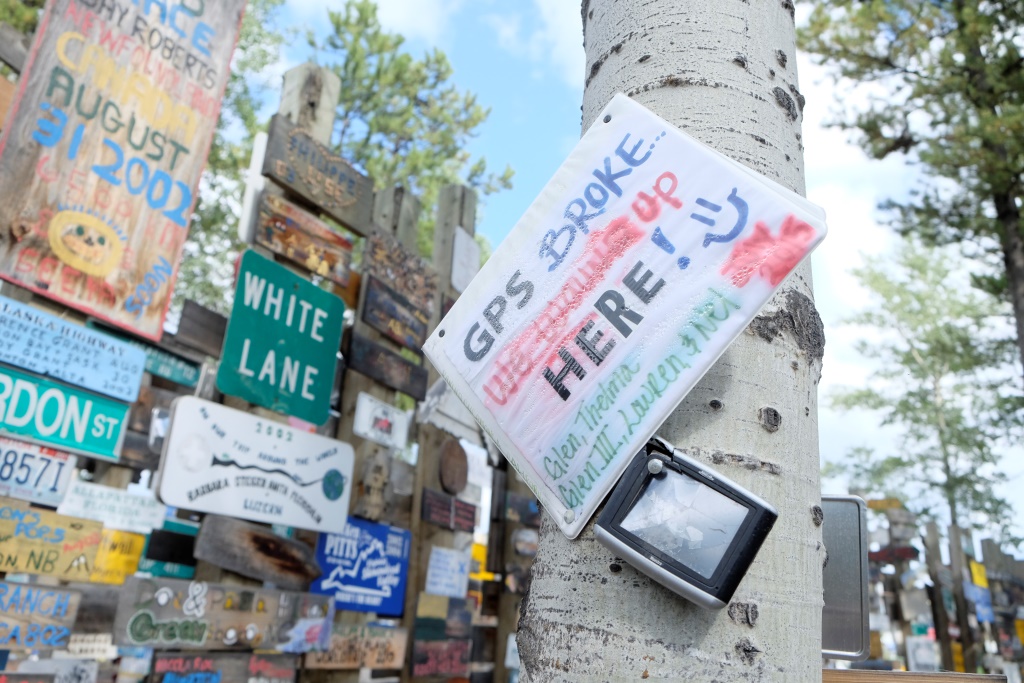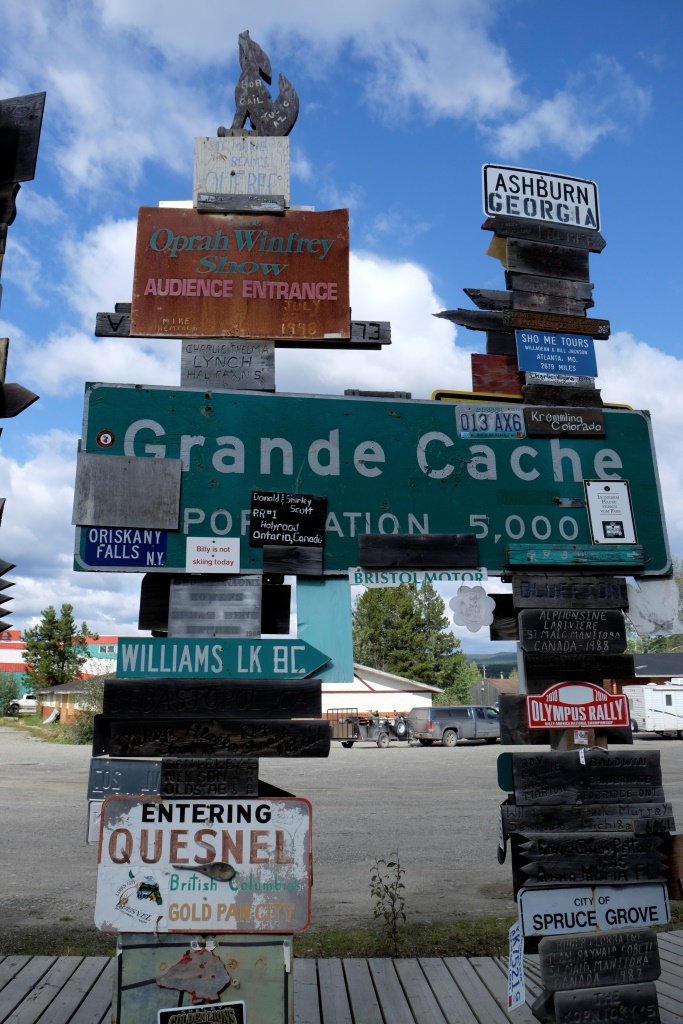 Interesantākā pieturas vieta, viennozīmīgi, ir Watson lake ceļa zīmju mežs (http://www.watsonlake.ca/our-community/sign-post-forest/) . 1942. gadā, kāds Aļaskas šoseju būvējošs amerikāņu zaldāts, kurš šajā vietā atveseļojies, sajutis ilgas pēc mājām un uzstādījis šeit savas dzimtās vietas ceļa norādi, aizsākdams ceļa zīmju izvietošanas tradīciju. Tagad šeit ir plāksnīšu un ceļa zīmju mežs – 2013. gadā saskaitītas 78 336 zīmes. Tās visas nevar apskatīt un izlasīt. Klīstam kādu stundu un bildējam, mūsuprāt, interesantākos eksemplārus. Ļoti daudzas zīmes ir no Vācijas. „Skatoties uz tām, man sāk šķist, ka Vācijā vairs nav ceļa zīmju”, Markuss joko, piebilstams, ka nesaprot, kā dažas, ļoti iespaidīga izmēra plāksnes tikušas nogādātas līdz šejienei. Es, protams, cenšos ieraudzīt kādu vēsti no Latvijas, bet nekā, tuvākās, ko atrodu, ir no Čehijas un Polijas. Apvaicājos arī vietējā informācijas centra darbiniecei, kura teju ik dienu pastaigājas pa ceļa zīmju alejām ar savu suni, vai viņa kādreiz manījusi kaut ko no Latvijas, bet viņa groza galvu – neesot vis. Būtu es iepriekš zinājusi par šādas vietas eksistenci, būtu kaut ko sadzejojusi, tagad negribu kavēt savus ceļabiedrus. Nobildējos vien ar paldies plāksnīti Mišelai – veltīju viņai laisko vakardienu, jo tā bija tieši tik meitenīga ka Mišela bija vēlējusi – ar dubļu procedūrām, mirkšanu ūdenī un tai sekojošu manikīru un pedikīru; kas par to, ka pašrocīgi veiktu.