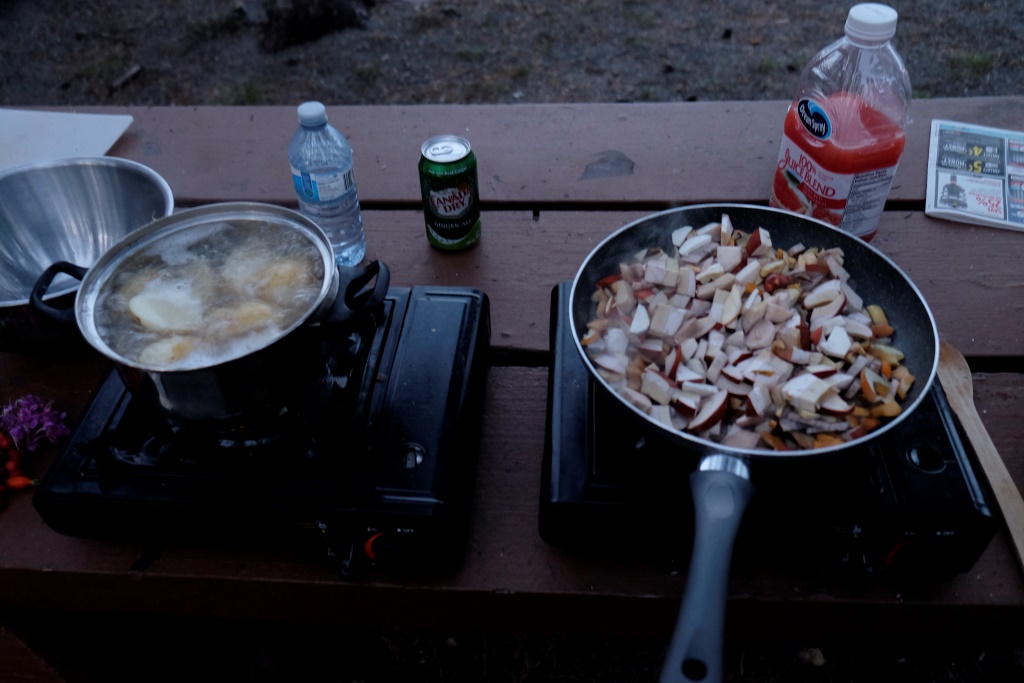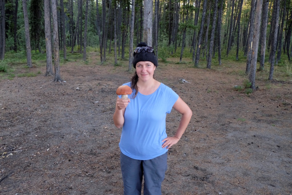 Iebraucot nometnes vietā, esam bez valodas. Šī ir skaistākā naktsmītne, ko esam redzējuši. Un bez maksas. Free is good. Uzceļam teltis, tad dodamies īsā pastaigā pa apkaimi. Beidzot. Te ir sēnes! Apšubekas un citas bekas! Pāris minūtēs salaužu vakariņu tiesu, pie rokas ir arī tēja – ugunspuķes, mežrozītes, pelašķi, baltais āboliņš un kāds vietējais augs, kas esot labs tējai. Kamēr es brūvēju vakariņas no dabas labumiem, puiši spēlējas ar uguni.