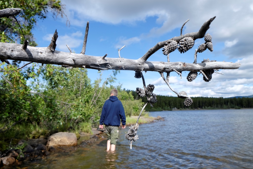 Es atgriežos no meža ar kārtējo beku kravu, paziņojot puišiem sen zināmo – sēņošana ir produktīvāka nekā makšķerēšana – šie noķēruši vien aļģes un žagarus. Rafaēla lielākais sasniegums šodien ir vizuļa ieāķēšana vecā riepā. Viņš tomēr nepadodas un turpina zivju vilināšanu, kamēr mēs ar Markusu aizbrienam līdz pussagruvušam guļbaļķu namiņam, kas, visticamāk, kalpojis mednieku vajadzībām. Markuss man rāda šīs būves celtniecībā pieļautās kļūdas, kas varētu būt iemesls tās sabrukšanai; viņš prot arī galdniecības darbus.
