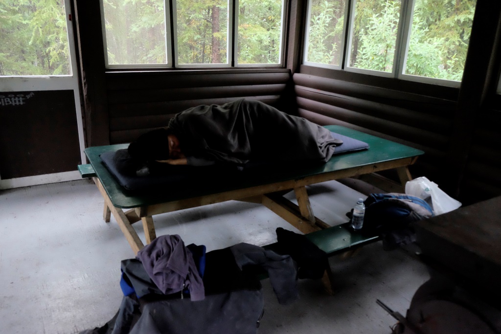 No rīta apspriežam nakts sajūtas. Rafaēls esot gulējis caurā miegā un trūcies augšā no katra mazākā troksnīša, savukārt, mani apciemoja lācis. Sapnī, protams. Ja šis būtu nācis īstenībā, nez vai mēs te tagad tā sēdētu. Lācim gan nebija nekādu iemeslu šeit rādīties – visa pārtika mašīnā, meži šobrīd ogu pilni un pieņemu, ka tās garšo labāk par diviem ne pārāk veselīgiem tūristiem. Jāatzīst, ka kopumā lāču, līdzīgi kā krokodilu un haizivju, bīstamais tēls ir krietns pārspīlējums. Lielākoties negadījumi notiek dēļ cilvēku muļķības, bet gadās arī citādi. Piemēram, Markuss stāstīja, ka lācis pagājošo ruden iegriezies mājās un notiesājis kādu viņam pazīstamu šveiciešu kundzīti netālu no Teslinas. Bet parasti viņi tā nedara.