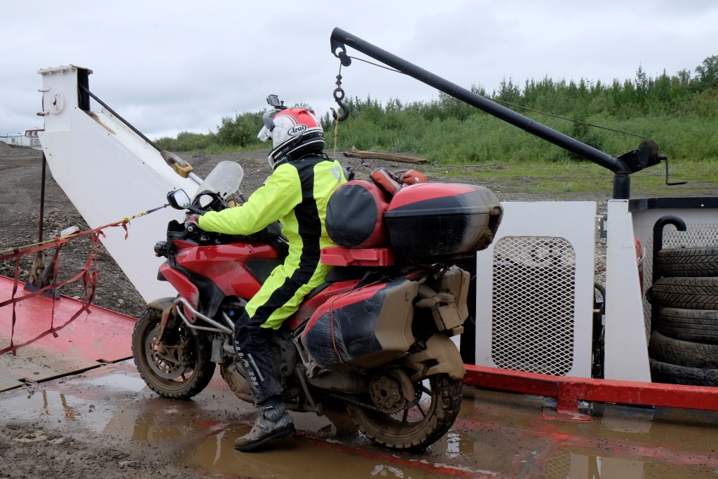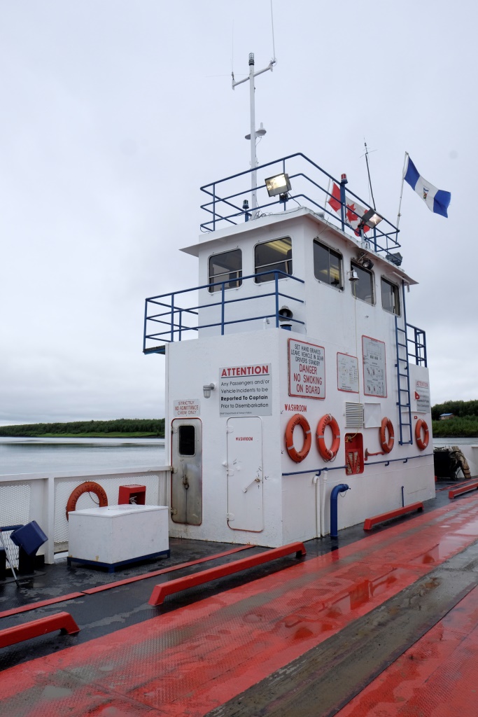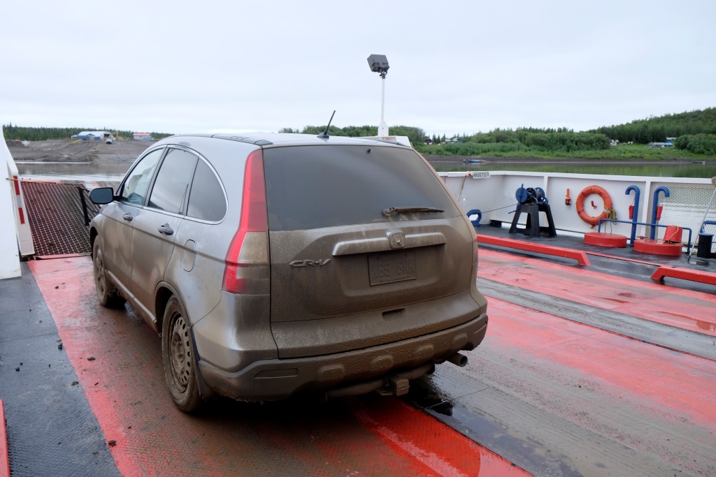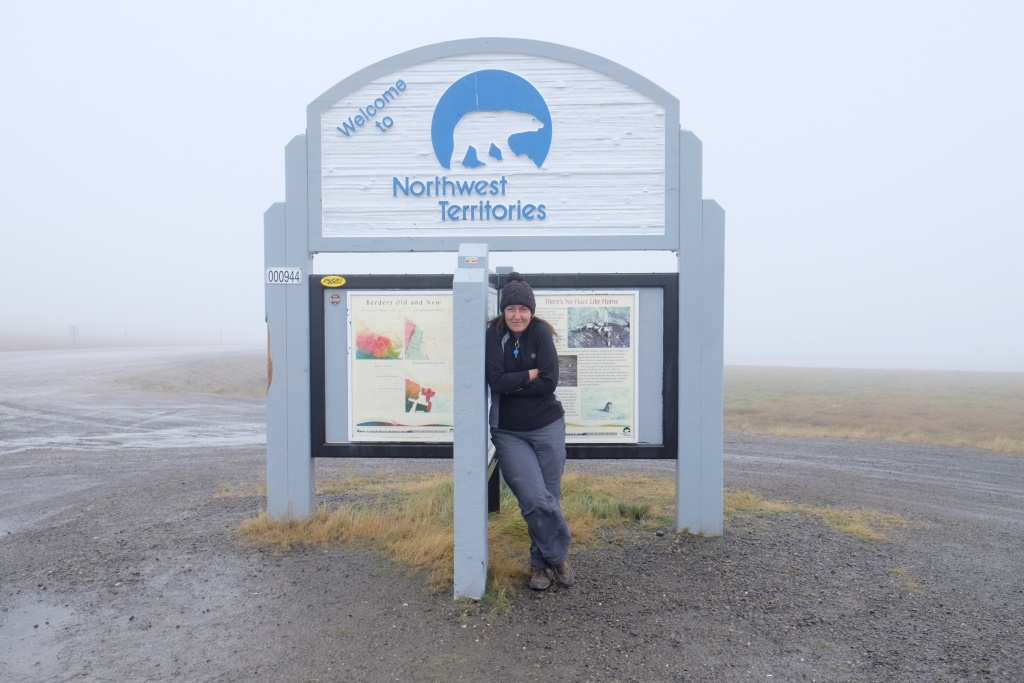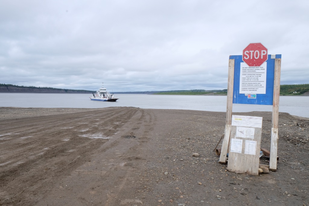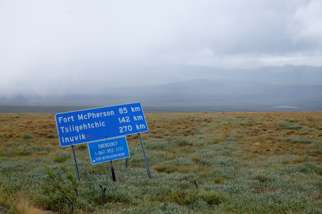 Ar vieglām trīsām sirdī pārbaudām spiedienu riepās, tas ir ok, pat saremontētajā, tāpēc dodamies ceļā bez bēdu. Lietus gan nav rimies joprojām, tāpēc Dempsters vietām ir traki dubļains. Kur apstāsies, tur arī paliksi. Arī migla ir tepat, tāpēc braucam pavisam lēnām, brīžiem ar 30, 40 km/h. Miglā un vējā aši nobildējamies pie plakāta, kas vēsta, ka iebraucam jaunā provincē – Ziemeļrietumu teritorijās. Lai tiktu līdz provinces galvaspilsētai Inuvik un Dempstera galam, jāizmanto divu prāmju pakalpojumi. Tie ir bez maksas un pa dienu kursē nepārtraukti.