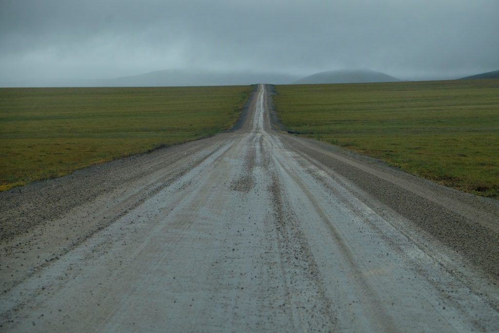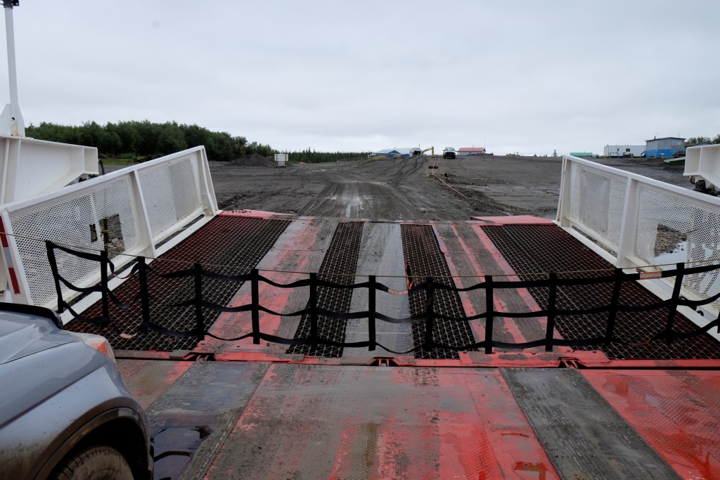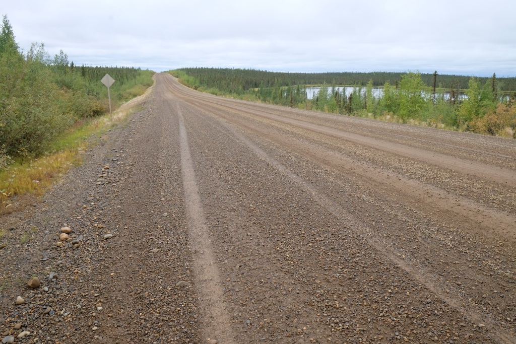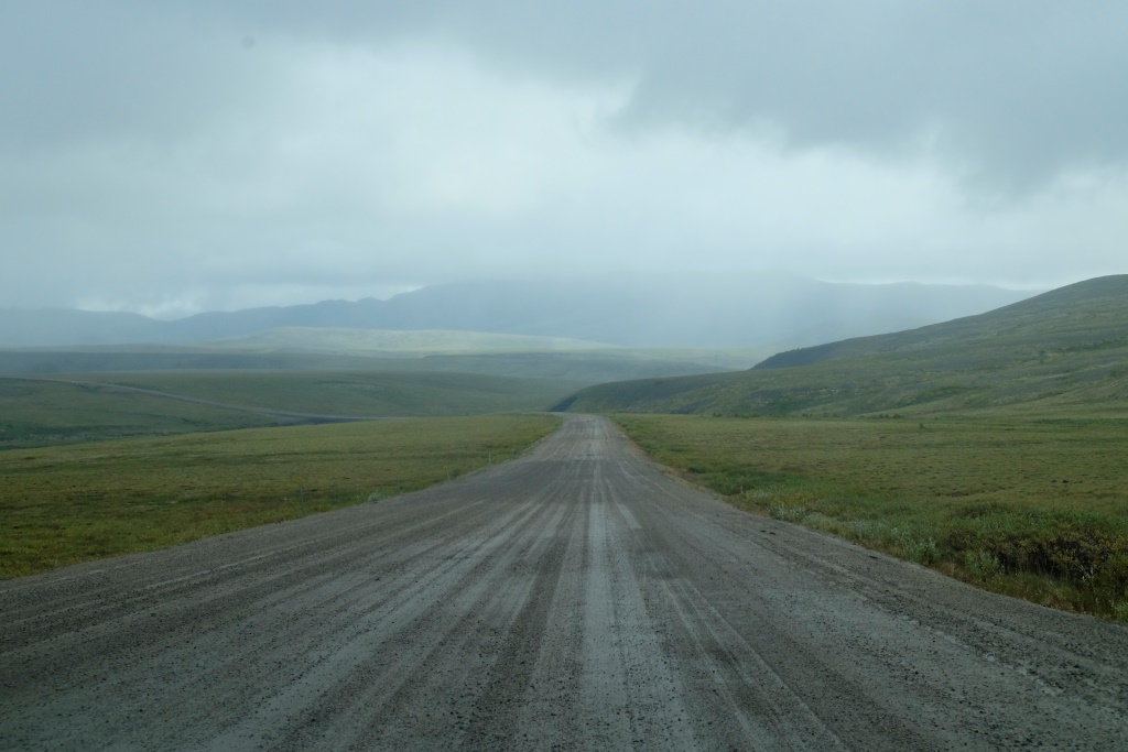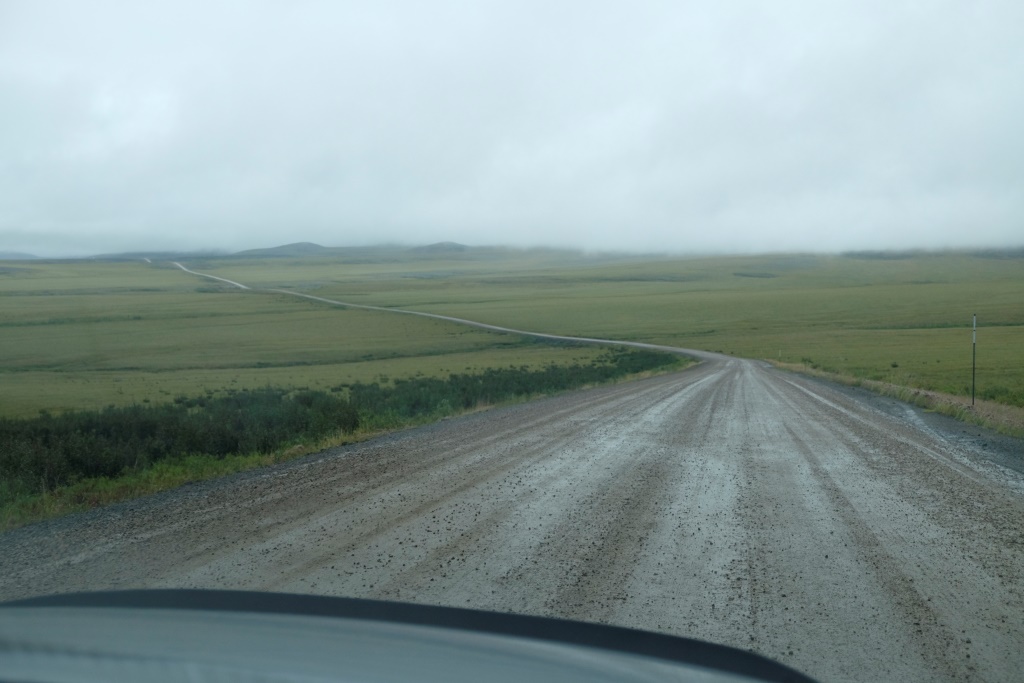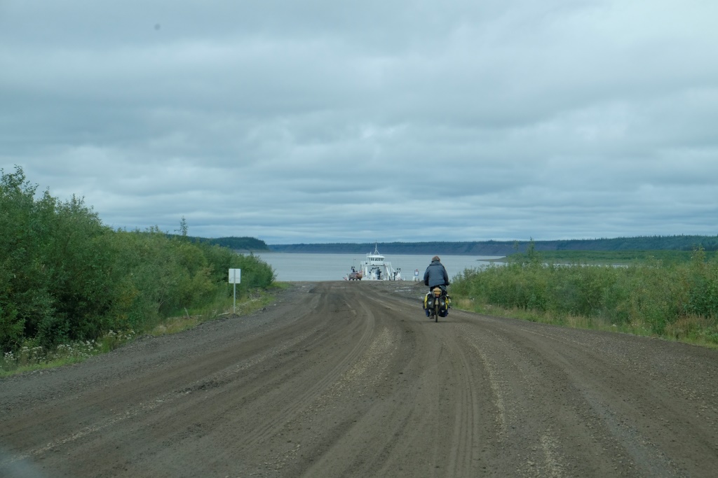 Ar vieglām trīsām sirdī pārbaudām spiedienu riepās, tas ir ok, pat saremontētajā, tāpēc dodamies ceļā bez bēdu. Lietus gan nav rimies joprojām, tāpēc Dempsters vietām ir traki dubļains. Kur apstāsies, tur arī paliksi. Arī migla ir tepat, tāpēc braucam pavisam lēnām, brīžiem ar 30, 40 km/h. Miglā un vējā aši nobildējamies pie plakāta, kas vēsta, ka iebraucam jaunā provincē – Ziemeļrietumu teritorijās. Lai tiktu līdz provinces galvaspilsētai Inuvik un Dempstera galam, jāizmanto divu prāmju pakalpojumi. Tie ir bez maksas un pa dienu kursē nepārtraukti.