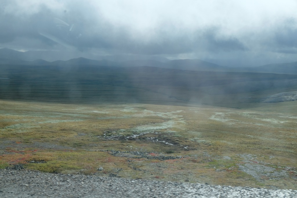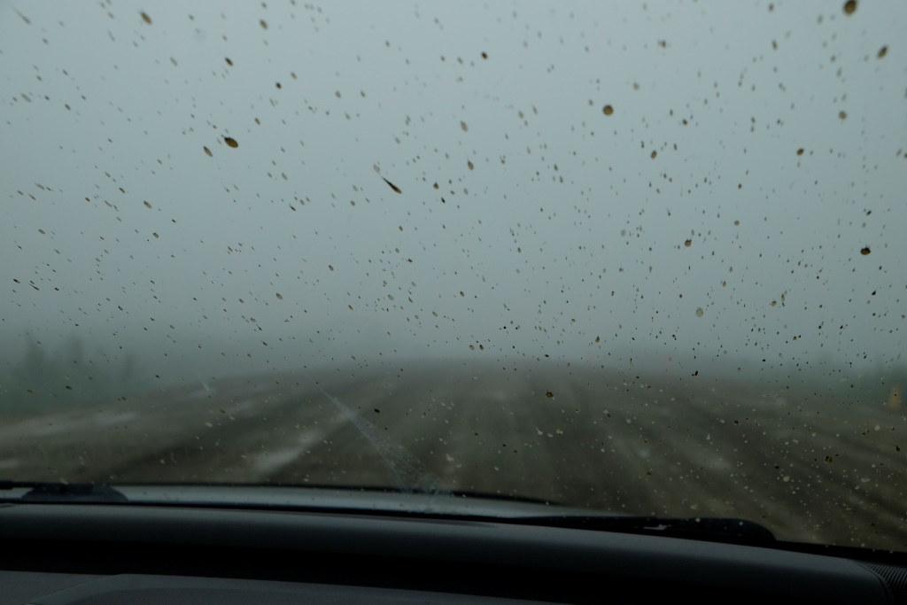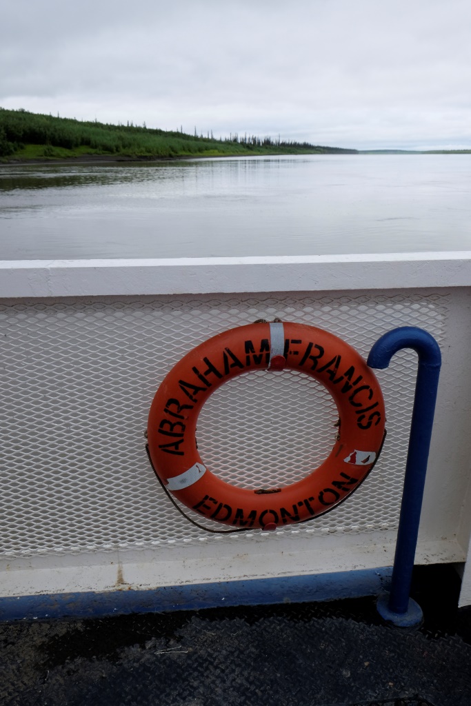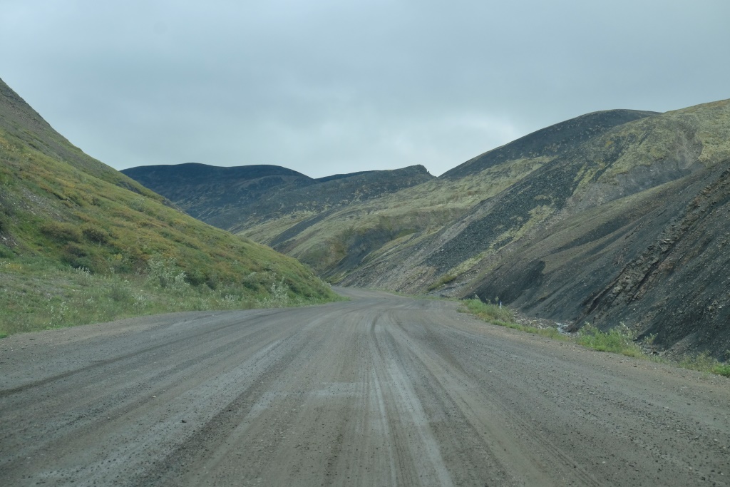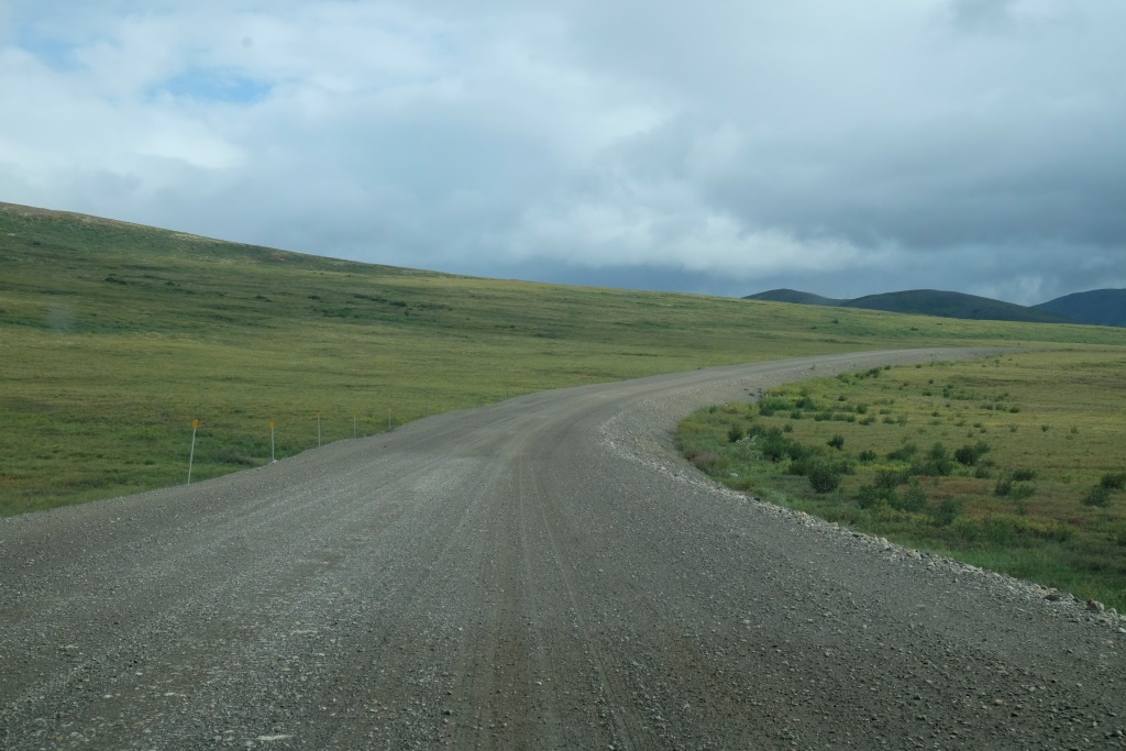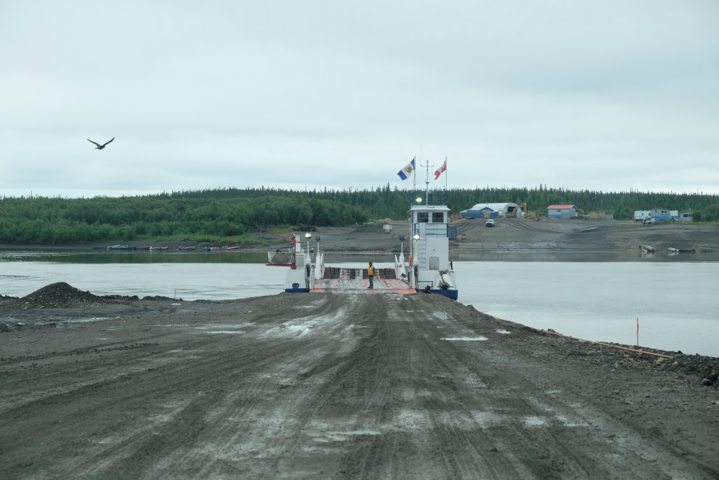 Ar vieglām trīsām sirdī pārbaudām spiedienu riepās, tas ir ok, pat saremontētajā, tāpēc dodamies ceļā bez bēdu. Lietus gan nav rimies joprojām, tāpēc Dempsters vietām ir traki dubļains. Kur apstāsies, tur arī paliksi. Arī migla ir tepat, tāpēc braucam pavisam lēnām, brīžiem ar 30, 40 km/h. Miglā un vējā aši nobildējamies pie plakāta, kas vēsta, ka iebraucam jaunā provincē – Ziemeļrietumu teritorijās. Lai tiktu līdz provinces galvaspilsētai Inuvik un Dempstera galam, jāizmanto divu prāmju pakalpojumi. Tie ir bez maksas un pa dienu kursē nepārtraukti.