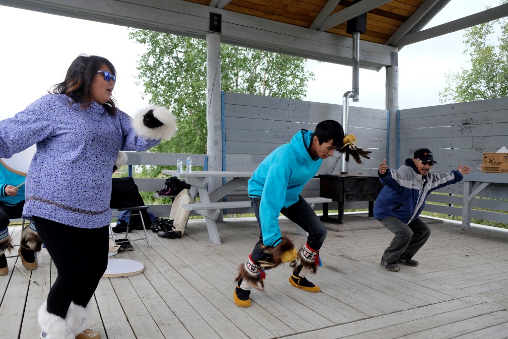 Nojaušu, ka šajā zemes malā tas nebūs lēts prieks, bet arī mans ķermenis brēc pēc zināmas komforta devas. Es tomēr ierosinu iesākumā uzmest aci kempingam, mazums, šiem arī kādi namiņi ir pieejami. Namiņi tur nav, toties nojumē uzstājas inuīti ar nelielu bungu – deju priekšnesumu. Mēs piesēžam to noskatīties un pēc īsa brīža esam gandrīz piesaluši pie beņķiem. Lai arī joprojām ārā ir plusi, ūdens tuvums tā samitrina gaisu, ka tas “kož kaulos”. Vējš arī nestāv malā. Dejotāji aicina pievienoties, bet visi kautrējas, līdz beidzot Rafaēls, nočukstēdams ierasto “f-it”, pievienojas Polārā lāča dejai. Neko, malacis, vismaz sasildījās.