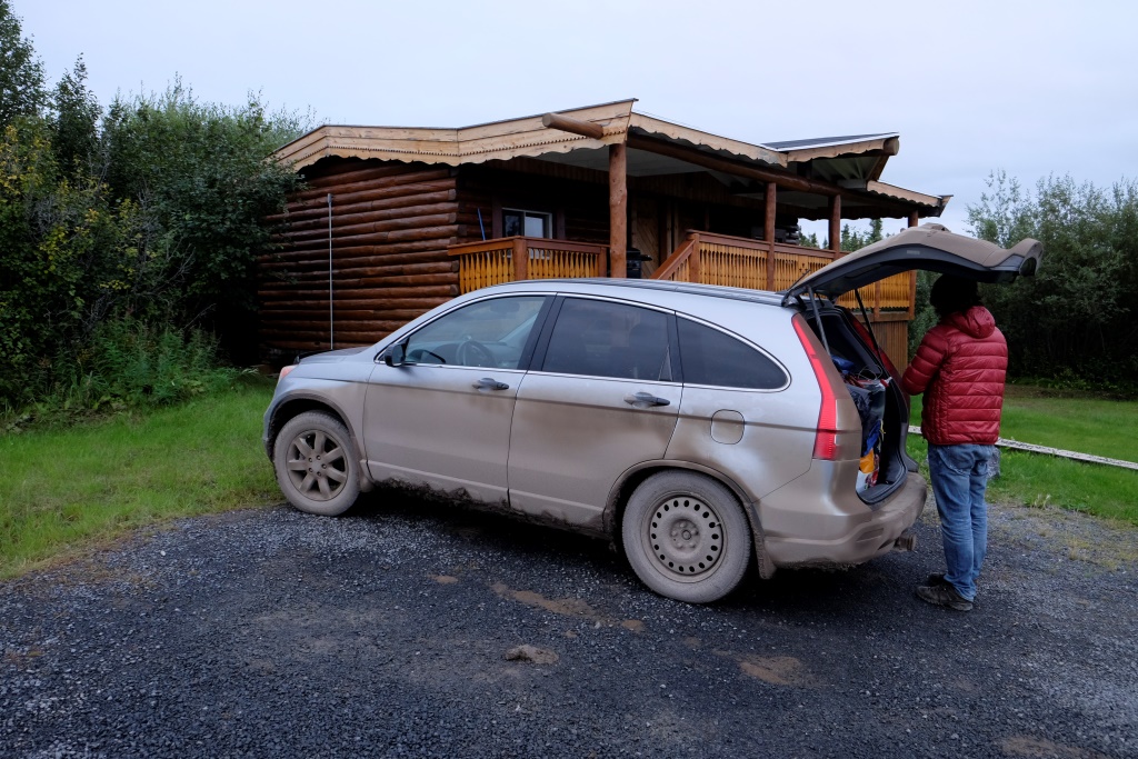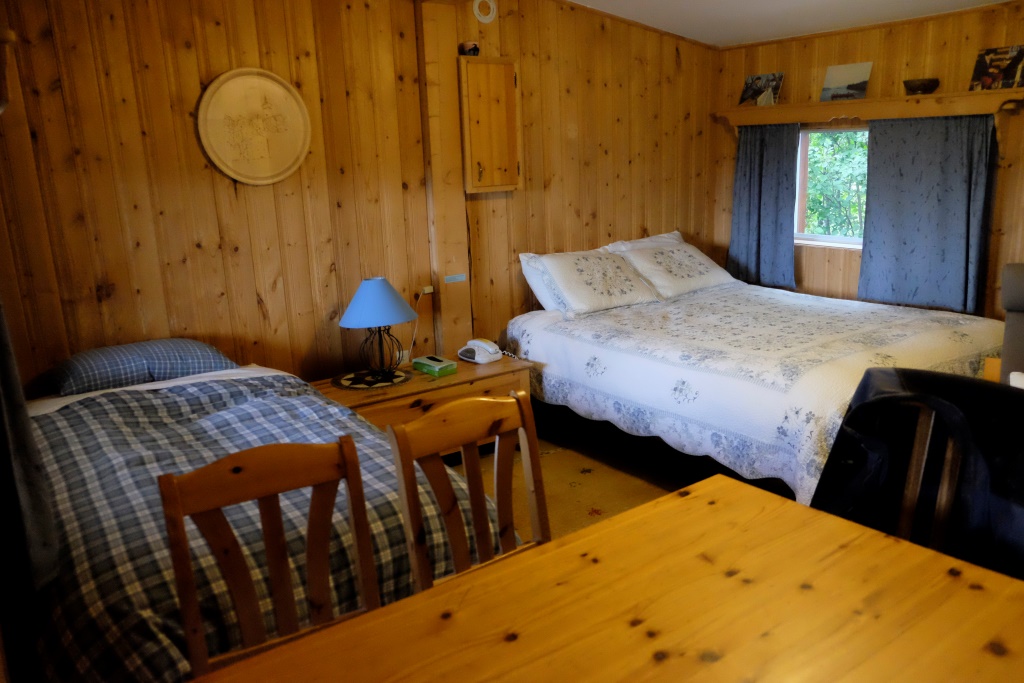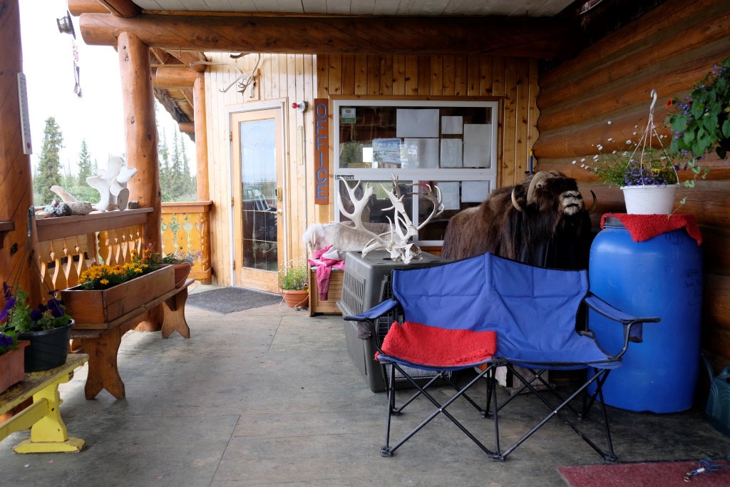 Arī šis kempings ir teju tukšs, vienīgie viesi ir kemperi, manām tikai vienu telti. Labi, nolemts, braucam meklēt palikšanas vietu zem jumta. Pēc vietējo aptaujāšanas un Lonely Planet izstudēšanas, nolemjam izmēģināt laimi ārpus pilsētas esošajā Arctic Chalet. Lētākā pieejamā iespēja ir 150 CAN (plus nodokļi) par nakti. Labi, 135 CAN, ja paliksim divas. Visticamāk jau, ka paliksim, kāda jēga triekties tādu gaisa gabalu, lai noguruši nākamajā rītā dotos prom. Ou, well, “norijam izmaksu krupi” un dodamies uz savu istabiņu. Tai ir gana zīmīgs nosaukums – Ugunspuķe.