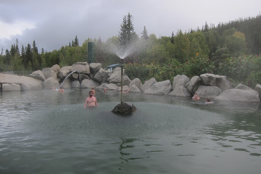 Visu gan nepagūstam izpētīt, jo mums sarunāta vizīte vietējā autoservisā, lai salabotu lēnām gaisu zaudējošo riepu – apnikusi mums tā mūžīgā pumpēšana. Džeki, gods kam gods, tiek ar riepu galā minūtēs 15. Fairbanks pilsēta mūsos pārāk dziļas simpātijas neraisa, tāpēc nolemjam aizšaut uz aptuveni 80 km attālajiem termālajiem avotiem.