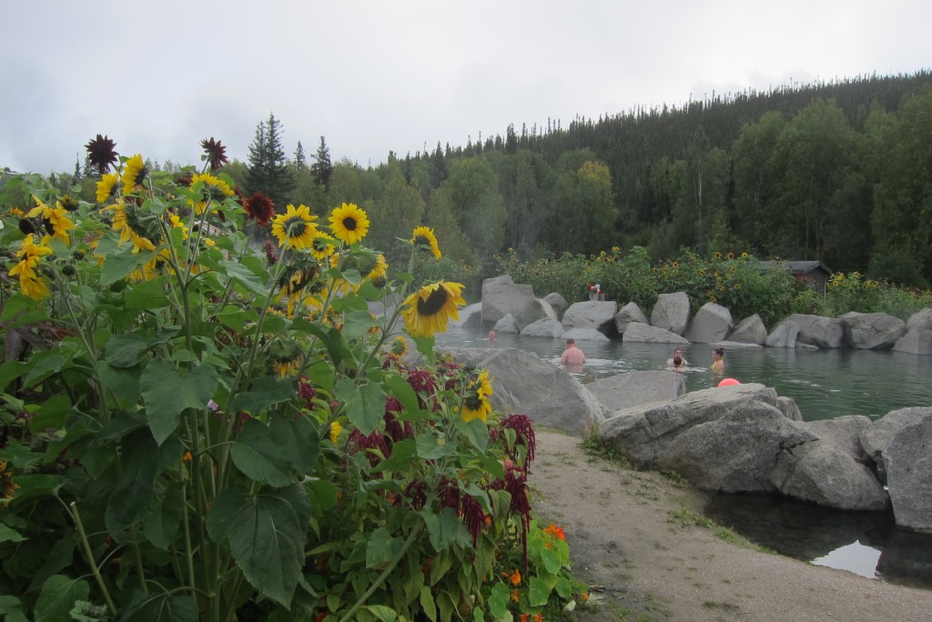 O, nekas nav labāk kā pēc ilgāka aukstuma un slapjuma perioda, iemērkt miesas karstajā ūdenī. Liard upes avotus šī vieta nepārsit, tomēr arī šeit ir ļoti jauki. Ūdens ir karsts, var izmasēt kaklu zem stipras ūdens šalts, baseina malas grezno lieli akmeņi, bet aiz tiem – saulespuķes. Baseina vidū ir neliela strūklaka, kas raida vēsas, lietum līdzīgas šaltis, stāvot zem tām var nonākt citā dimensijā. Eva Ikstena – Strapcāne man kopā ar atbalstu veltīja mīļu komplimentu, ka dažkārt mans blogs esot dienas prieks, tad nu veltu Evai šo dienas priecīgāko momentu ar visām saulespuķēm! Paldies, Eva!