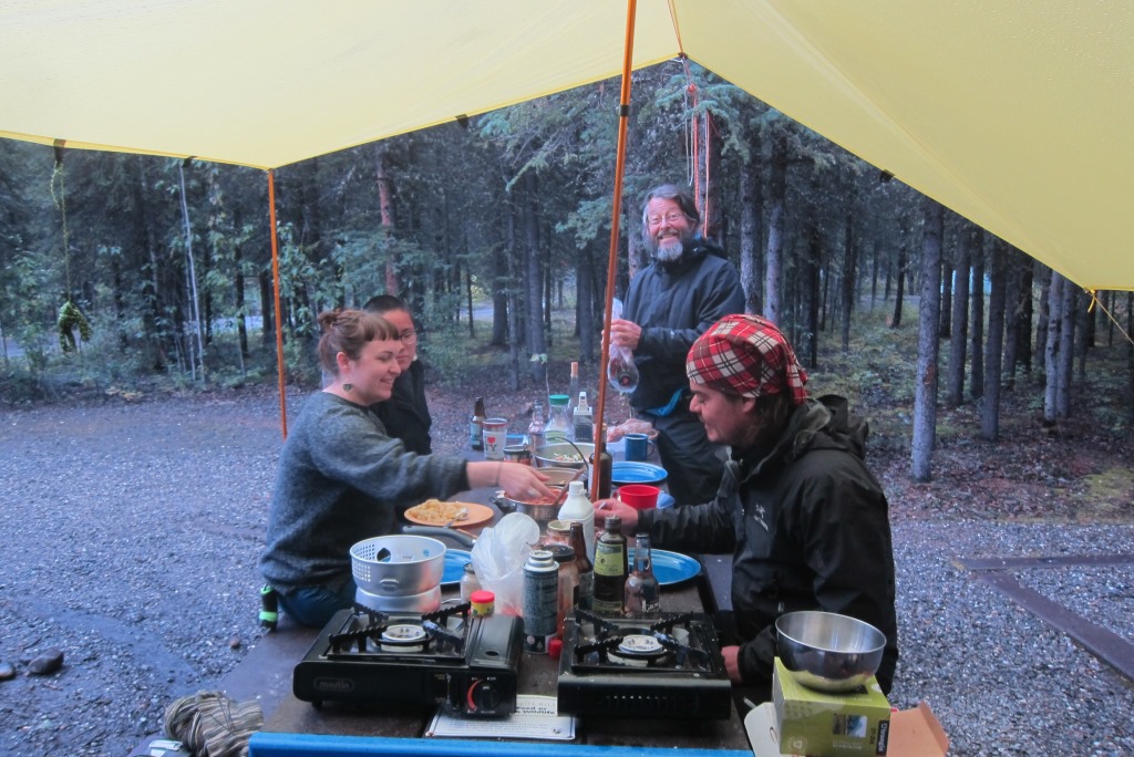 Tā kā nojume uzslieta mūsu vietā, norunājam vakariņas gatavot zem tās, kopā jautrāk. Apvienojam produktus un mums top varen glaunas vakariņas. Rafaēls atbild par makaroniem un vienu mērces veidu, es paralēli sintezēju apšu beku mērci ar parmazānu un zilo sieru, kā arī zaļos salātus. Kīts piepalīdz pēc nepieciešamības un izklaidē mūs ar stāstiem. Vienā brīdī mēs saprotam, ka pagatavotais ēdiena daudzums pilnīgi noteikti pārsniegs trīs vēderu kapacitāti. „Mums kāds jāuzaicina ciemos”, Kīts attopas pirmais. Palūkojušies apkārt, pirmās pamanām divas meitenes kaimiņos. Kīta uzrunātas, viņas ar prieku piekrīt. Meitenes stāsta, ka bija mēģinājušas pagatavot vakariņas uz ugunskura, bet šis process nav diez ko veicies, tāpēc nolēmušas šovakar vakariņās ēst čipsus un sieru. Mēs atzīstamies, ka mums vakar bija diezgan līdzīgas vakariņas.