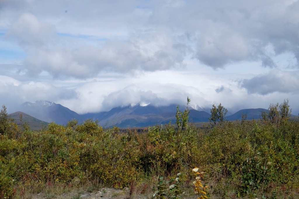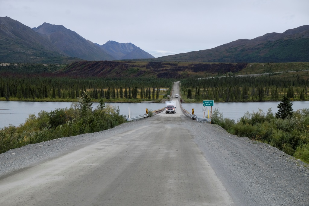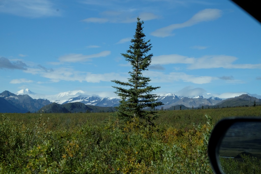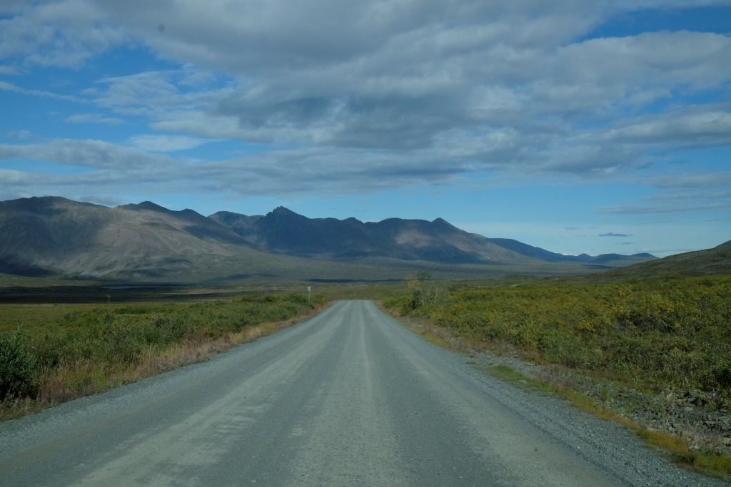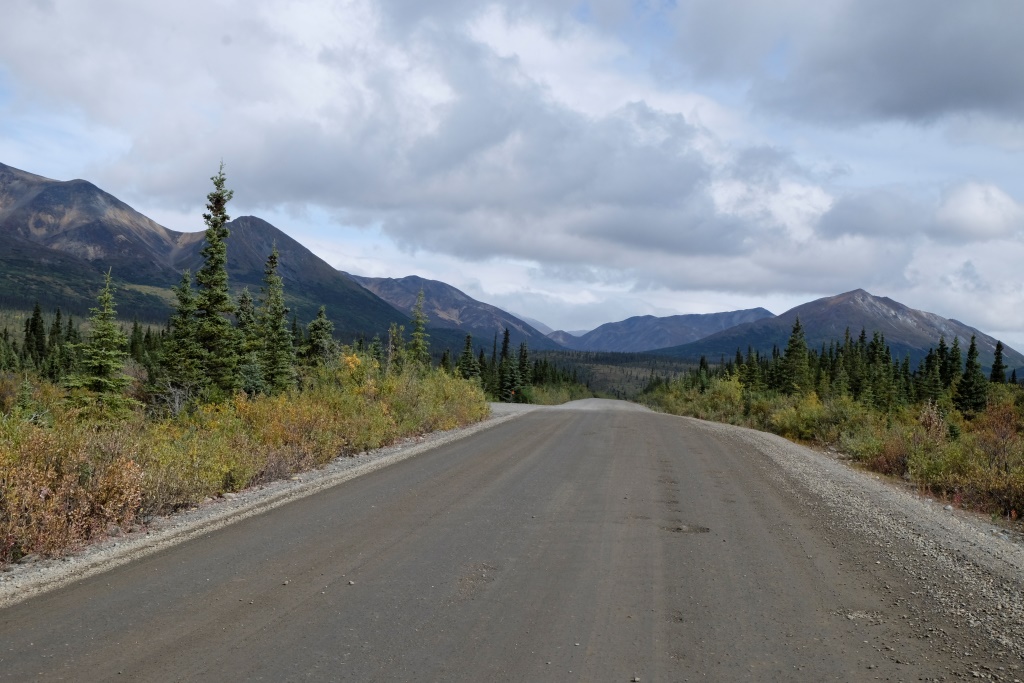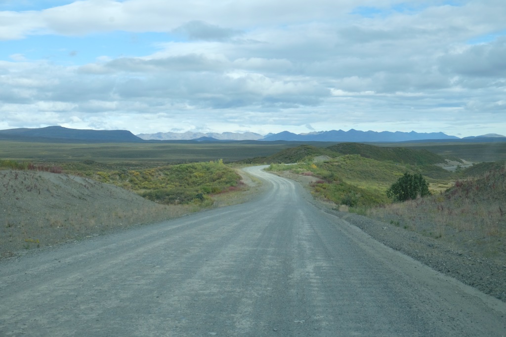 Robežsardze nav melojusi – jau pēc pirmajiem kilometriem mūsu skatam paveras kalni un ielejas, drīz pie apvāršņa iznirst sniega klātās smailes. „Šī ir Aļaska, kas dzīvoja manās iedomās”, Rafaēls paziņo un es viņam pilnībā piekrītu, arī manā galvā Aļaska izskatījās tieši šādi. Es gan pārāk daudz blisināties riņķī nevaru – ceļš ir bedrēm un grambām bagāts, kā novēršu skatu, tā ritenis iekrīt kādā no tām. No dzīvās radības šodien tiekam aplaimoti ar diviem karibu, kas šķērso ceļu netālu no mūsu auto, tad palēkdamies pazūd krūmos, vēl brīdi var vērot viņu baltos dibengalus iznirstam no pundurbērziņiem. Pa ceļam pieturam pāris vietās, lai apvaicātos par naktsmājām, cenas visur ir pasakainas, ir tūrisma sezonas vidus. Izskatās, ka atkal gulēsim teltī, gan jau nebūs tik traki, jo lietus beidzot ir rimies.