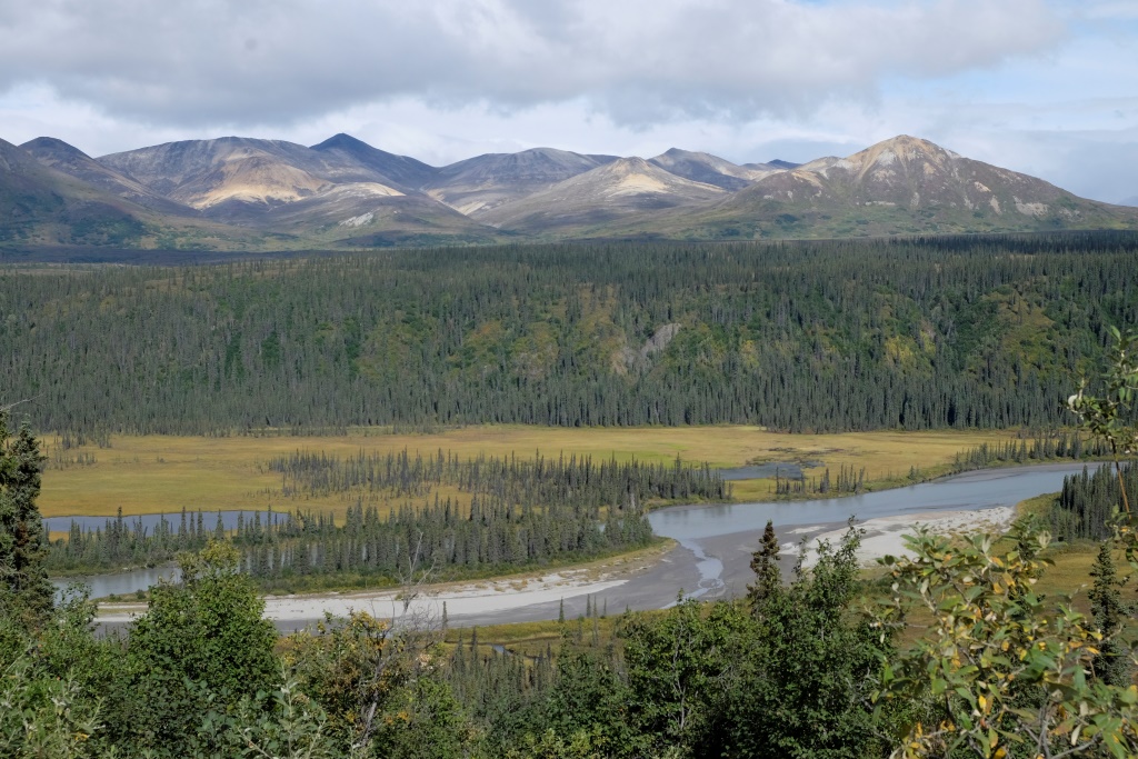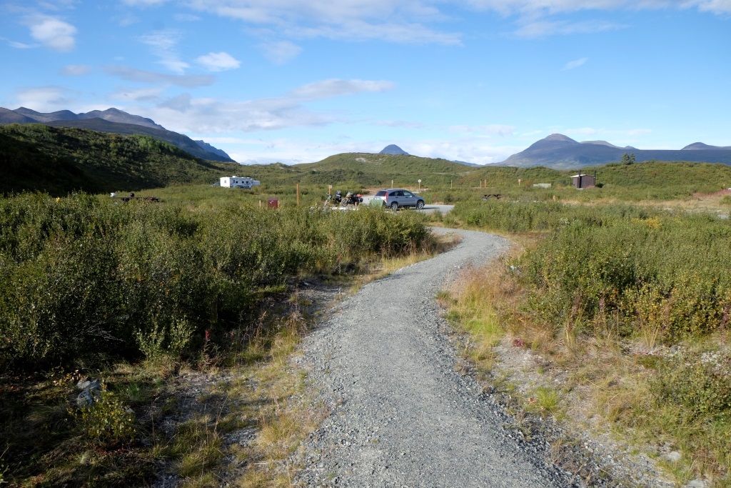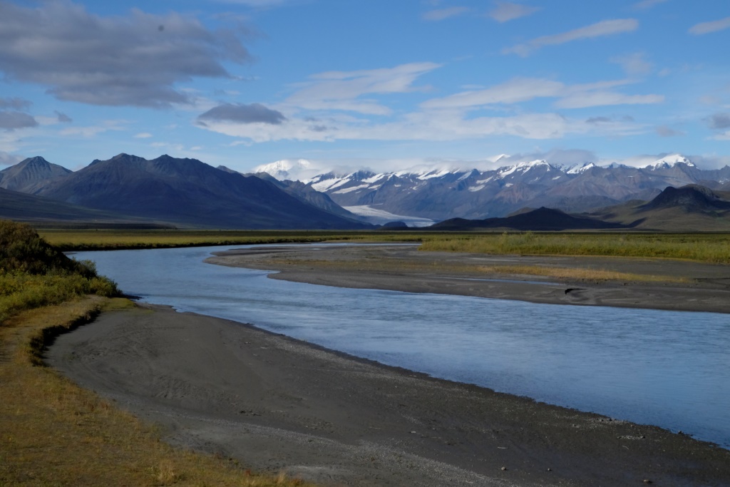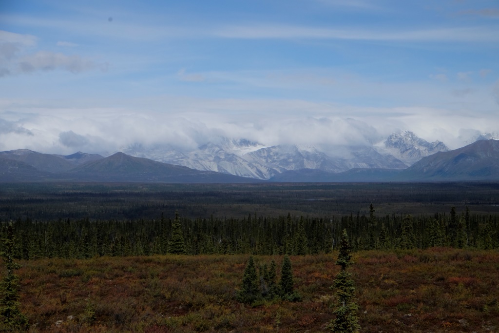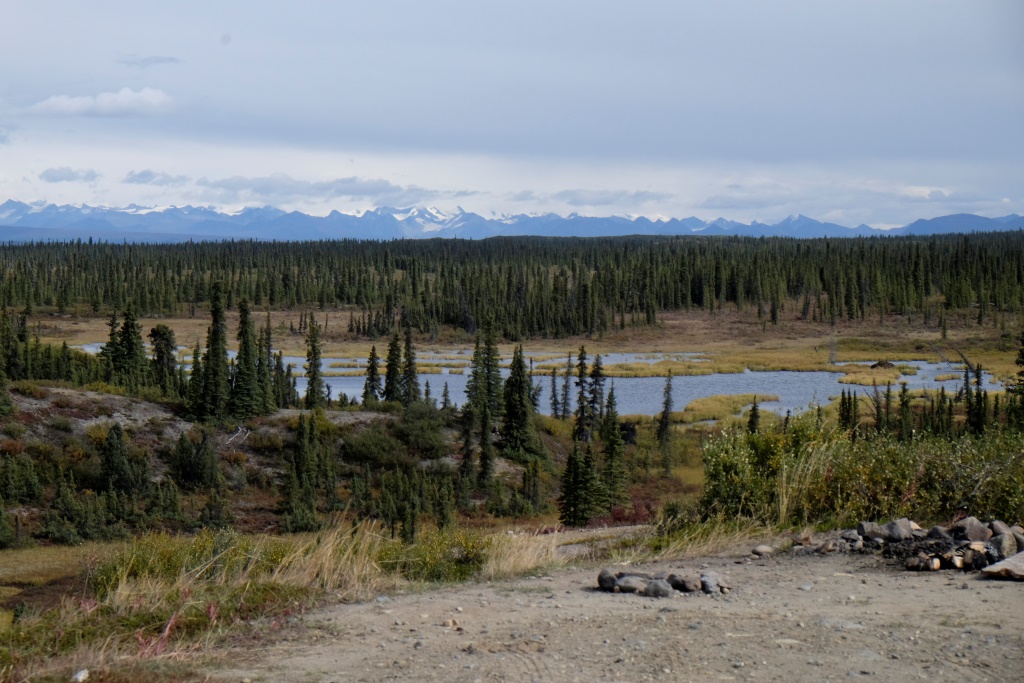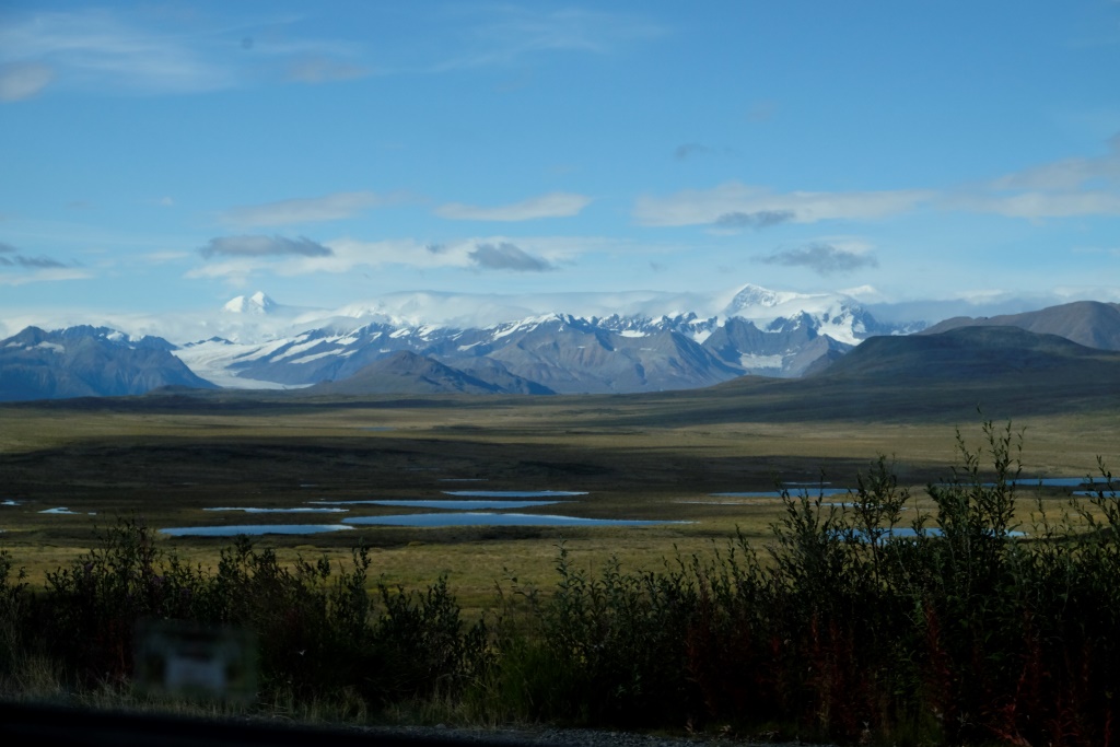 Robežsardze nav melojusi – jau pēc pirmajiem kilometriem mūsu skatam paveras kalni un ielejas, drīz pie apvāršņa iznirst sniega klātās smailes. „Šī ir Aļaska, kas dzīvoja manās iedomās”, Rafaēls paziņo un es viņam pilnībā piekrītu, arī manā galvā Aļaska izskatījās tieši šādi. Es gan pārāk daudz blisināties riņķī nevaru – ceļš ir bedrēm un grambām bagāts, kā novēršu skatu, tā ritenis iekrīt kādā no tām. No dzīvās radības šodien tiekam aplaimoti ar diviem karibu, kas šķērso ceļu netālu no mūsu auto, tad palēkdamies pazūd krūmos, vēl brīdi var vērot viņu baltos dibengalus iznirstam no pundurbērziņiem. Pa ceļam pieturam pāris vietās, lai apvaicātos par naktsmājām, cenas visur ir pasakainas, ir tūrisma sezonas vidus. Izskatās, ka atkal gulēsim teltī, gan jau nebūs tik traki, jo lietus beidzot ir rimies.