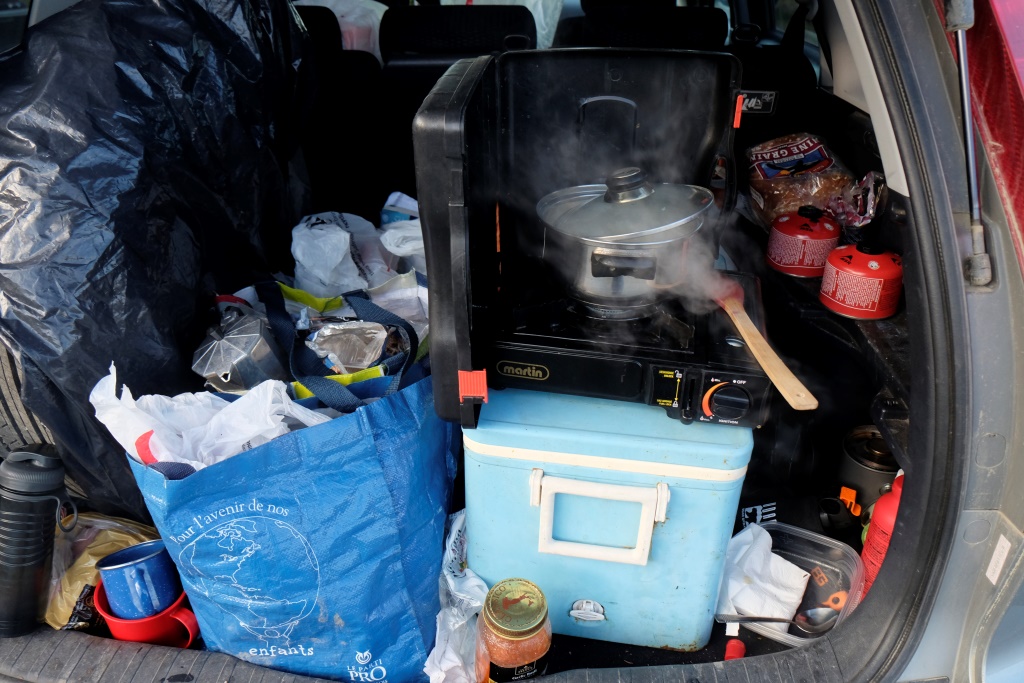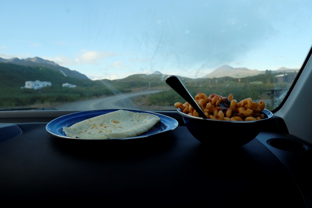 Nākamais izaicinājums ir vakariņu pagatavošana. Novietojam mašīnu pret vēju, uzslienam plītiņas karkasu papildu aizvējam – mums ar samērā labām sekmēm izdodas uzvārīt makaronus. Sagāžam tajā vakardienas mērces paliekas un patveramies mašīnas siltumā, lai mierīgi paēstu. Motociklistiem blakus vietā klājas daudz skarbāk. Smejamies, ka Rafaēla mašīna faktiski ir RV (recreational vehicle, ko mēs parasti saucam par treileriem), jo tā ir Honda CRV. Ar nelielu piespiešanos veicam trauku mazgāšanas rituālu, faktiski tas izpaužas kā trauku iemešana ezerā, aša apviļāšana un izzvejošana. Pēc īsās atrakcijas visi pirksti ir tikpat zili kā mūsu bleķa trauku komplekts.