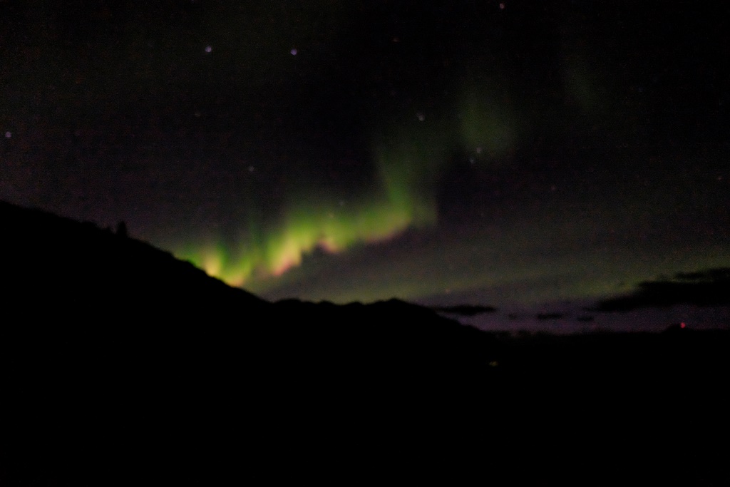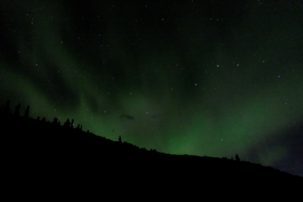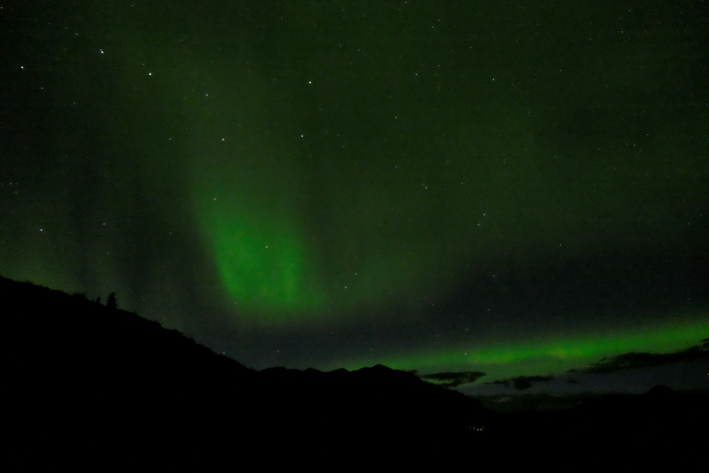 Viens no iemesliem, kāpēc es neeju uz telti – tur ir auksti, bet otrs un galvenais – šovakar mums ir ideāli apstākļi ziemeļblāzmas vērošanai – 360 grādu ekrāns un skaidras debesis. Vai šai gribēsies rādīties, man nav ne jausmas – nekādas prognozes neesmu dzirdējusi. Teorētiski 21. augusts skaitās ziemeļblāzmas sezonas atklāšana netālajā Fairbanks, šodien ir 23. augusts, izredzes nav sliktas. Spriežu, ka esmu nojāņojusi ne vienu vien nakti ar daudz pieticīgākiem iemesliem vai vispār bez tiem, kāpēc gan nevarētu pavadīt vienu nakti, ziemeļblāzmu gaidot. Un galu galā – pat ja to neredzēšu, būšu uzadījusi vienu zeķi un priecājusies par debesu spīdekļiem; pēc mēness pazušanas, zvaigznes kļuvušas par zvaigznēm. Iemalkoju arī ogu sulu un sūtu sirsnīgu paldies Lindai Rihterei – bilde no nākamās dienas, paldies no šodienas!