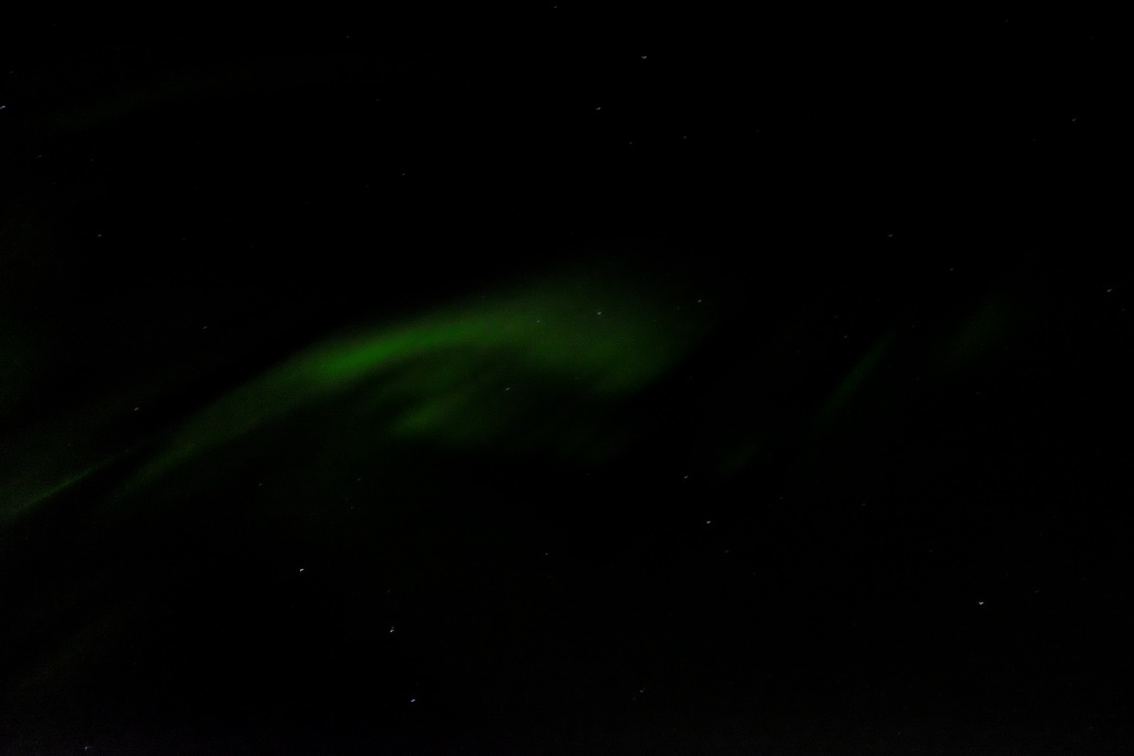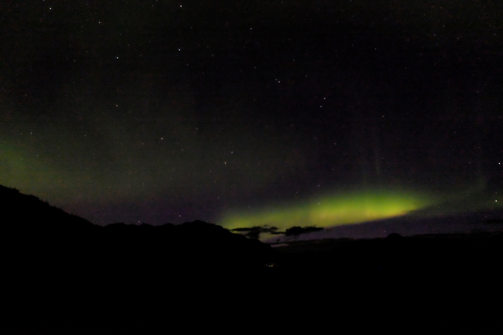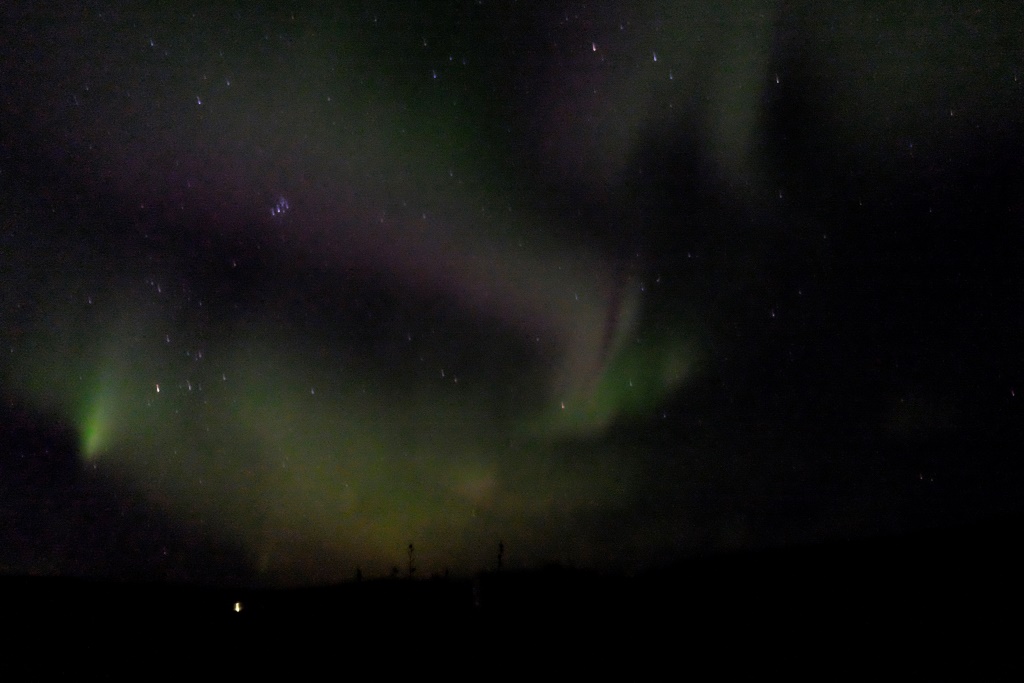 Pēc kādas stundas atkal izrāpjos no mašīnas, lai izstaipītu kājas un, kas tad tur – debesīs zīmējas divas gaišas svītras. Esmu diezgan droša, ka tā skaitās „viegla” ziemeļblāzma, tomēr šovakar esmu noskaņota kam vairāk. Ierāpjos atpakaļ mašīnā un piefiksēju, ka strīpas parādījušās tieši pusnaktī. Ar vienu aci turpinu adīt, ar otru vaktēju debesis. Ik pa laikam parādās jaunas baltas un gaiši zaļas svītras, es diskutēju ar sevi, kad tās būs pietiekami spilgtas, lai modinātu Rafaēlu. Esam vienojušies kopš ceļojuma sākuma – ja viens no mums jebkāda iemesla pēc ir nomodā un parādās ziemeļblāzma, otrs jāmodina bez žēlastības.