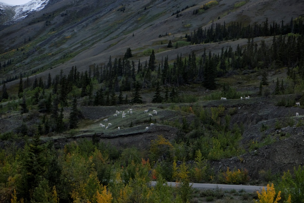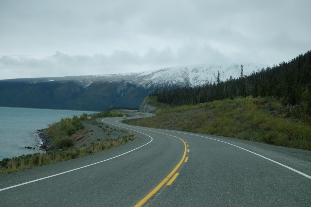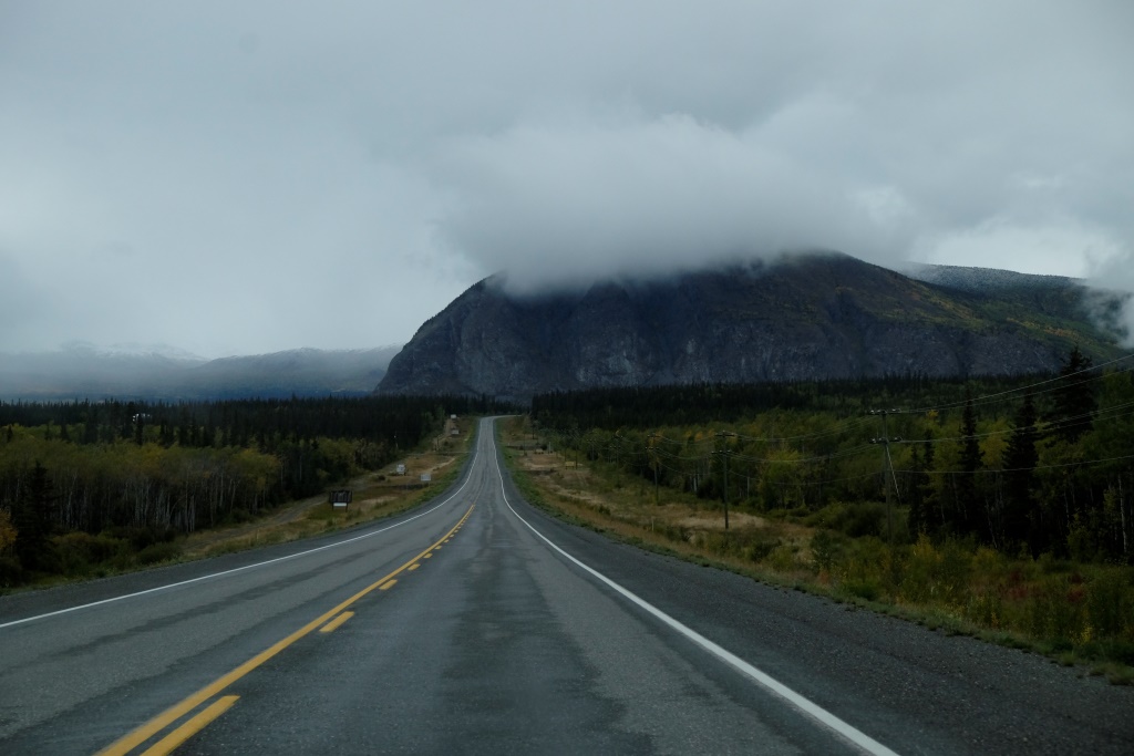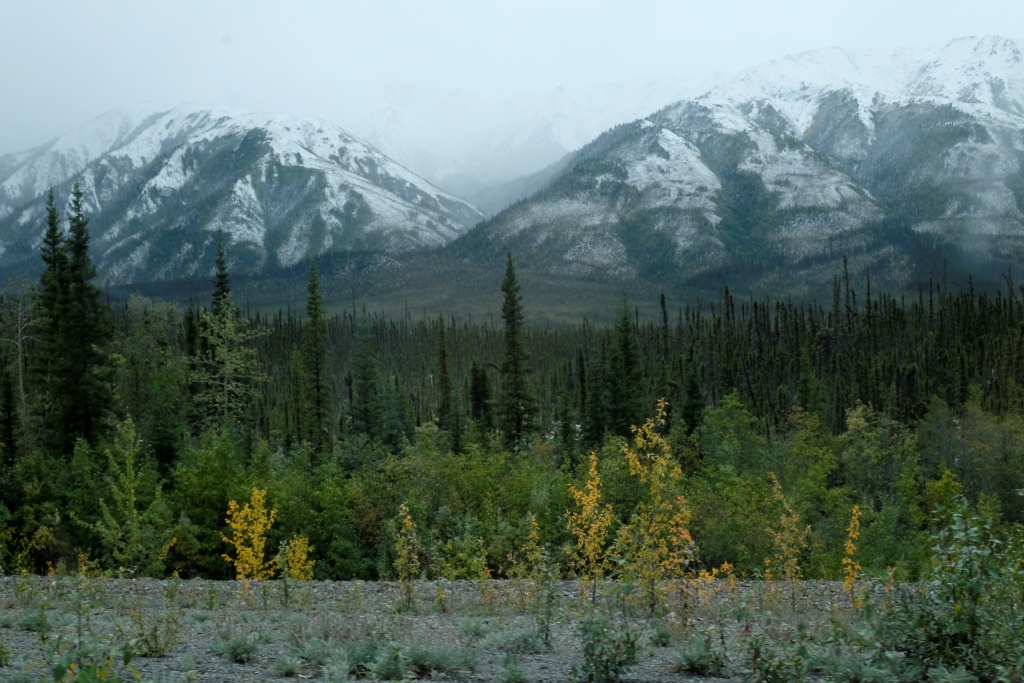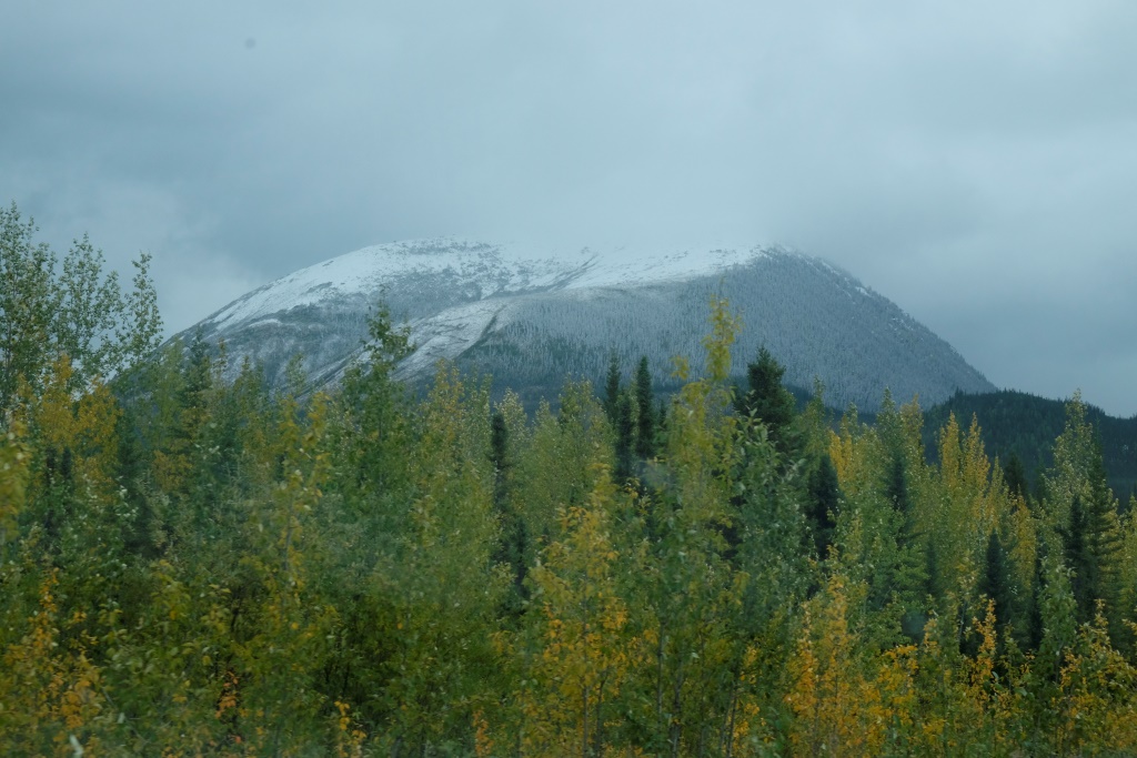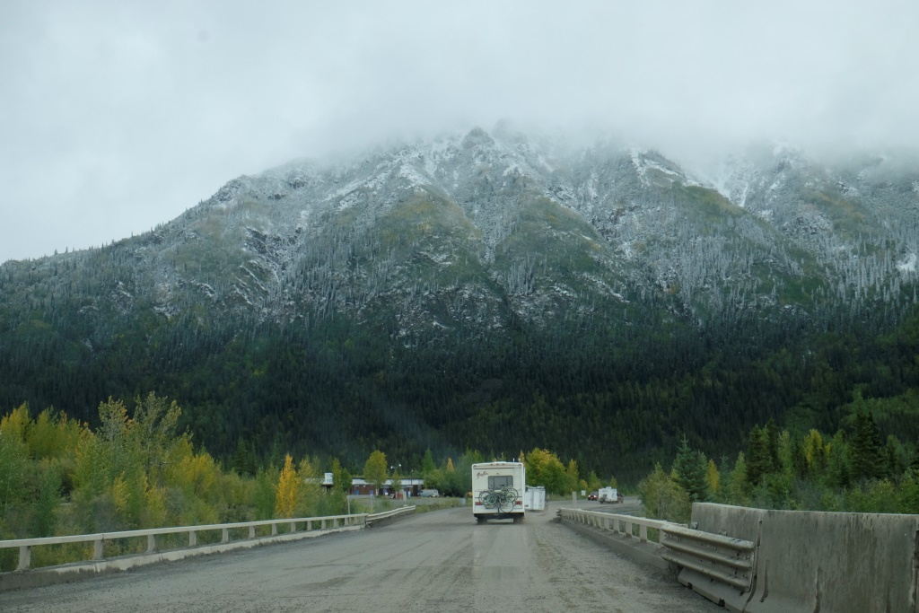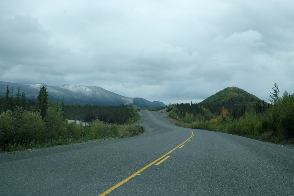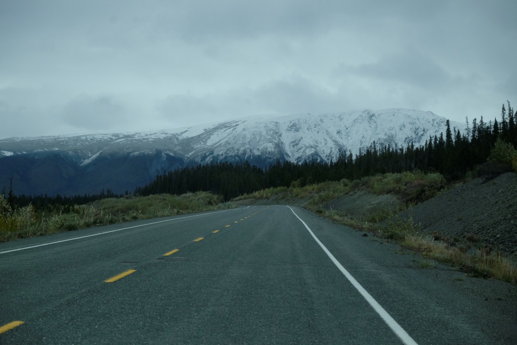 Dienas vidū sasniedzam Kanādas robežu – puisis uzdod vien pāris jautājumus, par mūsu produktu krājumiem viņam vispār nav nekādas intereses. Dažu minūšu laikā tiekam atpakaļ Kanādā – ir labi atkal redzēt ceļazīmes ar kilometru norādēm. Cerība, ka, iebraucot Kanādā, klimats būs nedaudz maigāks, neattaisnojas. Te pat izskatās vēl mežonīgāk – ceļmalas mežā vietām vērojams sniegs un arī zemo kalnu zaļā rota augšgalā ir balta. Lai būtu pavisam jautri, iebraucam sniega mākonī un temperatūra nokrītas līdz 1 grādam. Plusos, pagaidām. Mums joprojām galvā nerīmējas doma, ka augusts = sniegs.