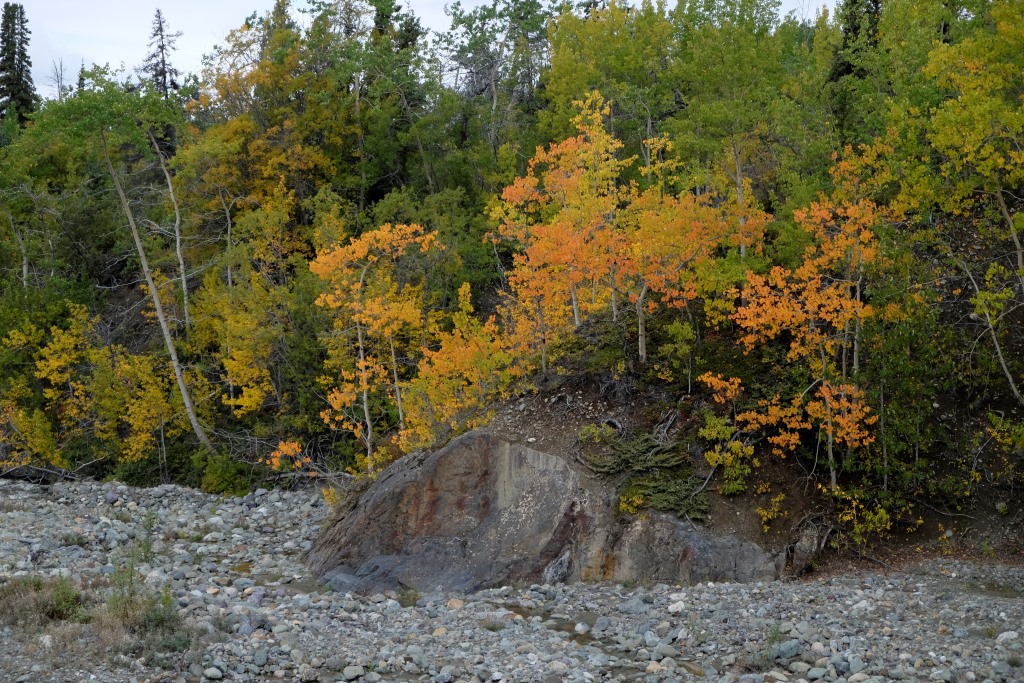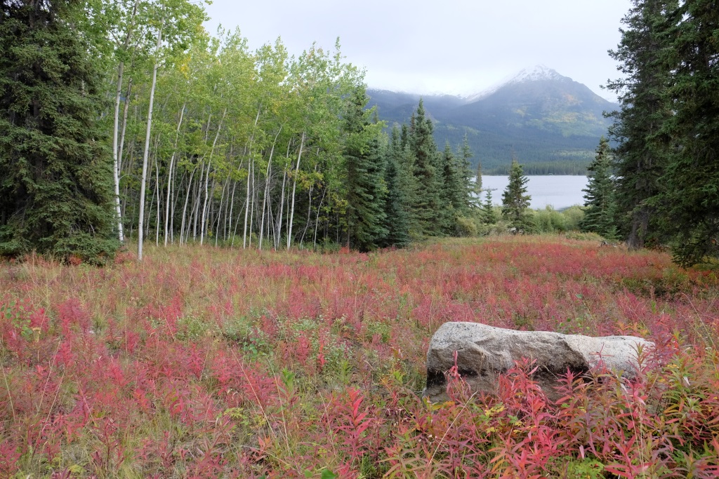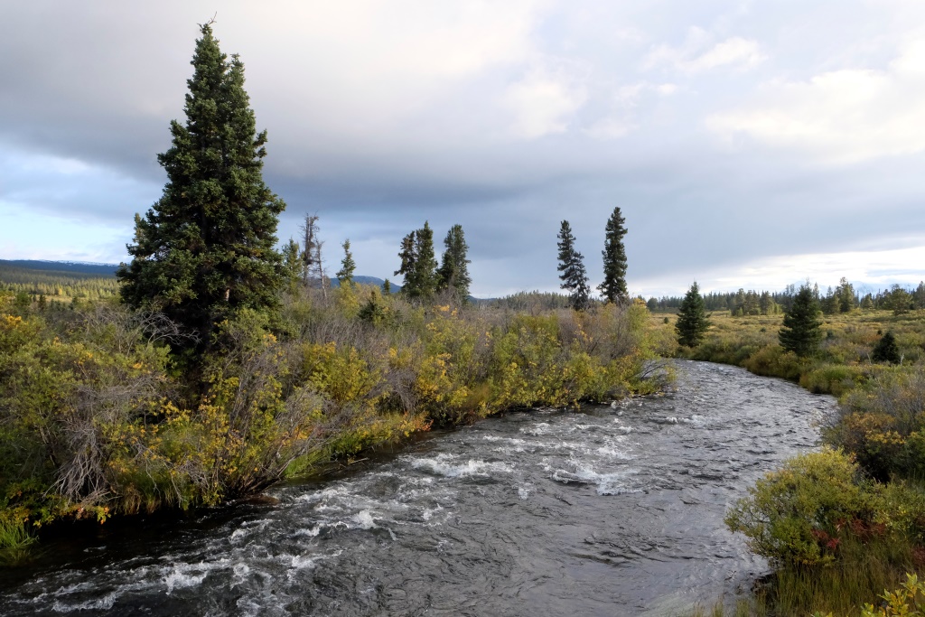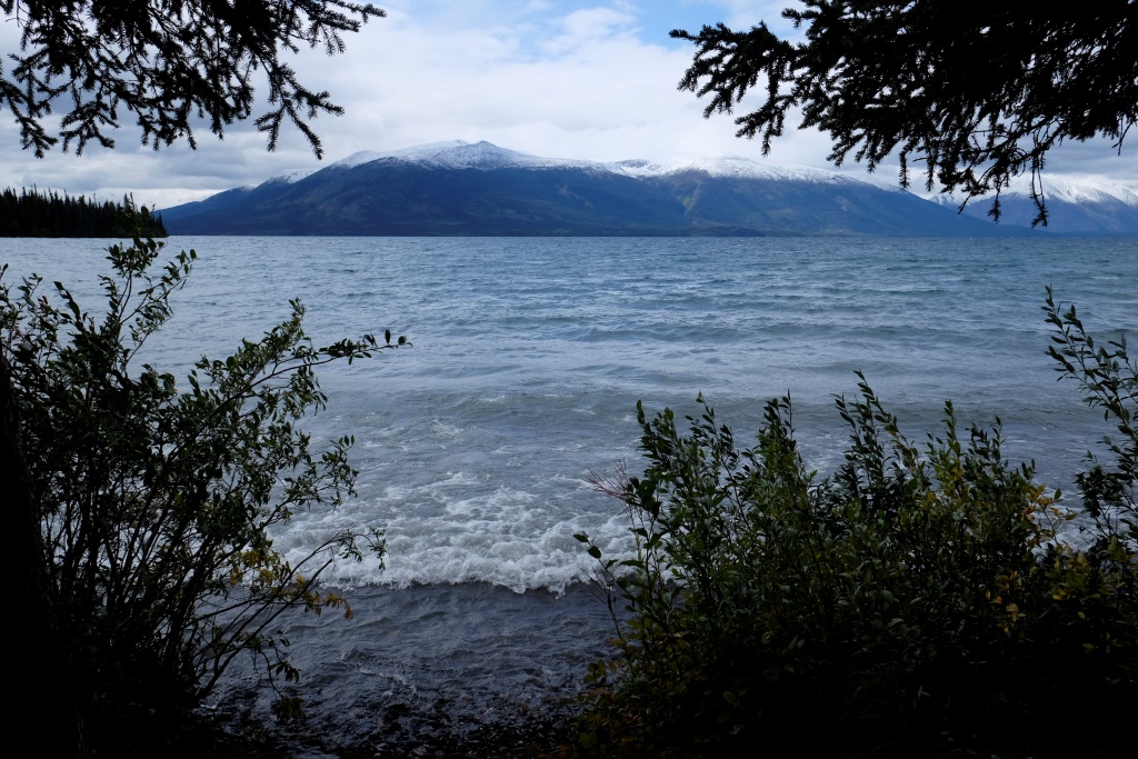 Šodien, par spīti stiprajam vējam, esmu nobriedusi solījuma izpildei – peldēties Jukonas upē. Tā kā Atlin ezers ir Jukonas upes šūpulis, laiks ir nelabs un ūdens auksts, domāju, ka Kosmosam nebūs nekas iebilstams pret šādu peldi. Iegriežam nelielā (un, protams, tukšā) kempingā, atstāju puišus ganāmies ap mašīnu un nozūdu nelielā līcītī. Ūdens patiesībā nav pārāk auksts, nepatīkamākais peldes sadaļā ir asais vējš un akmeņainā ūdens gultne. Tikusi līdz vietai, kur ir gana dziļš, iemetos uz brīdi ūdenī un tad aši tinos prom. Pēc peldes nemaz nav auksti. Jūtos dikti apmierināta ar solījuma izpildi, nebija tik traki. Markuss prasa, vai šī pelde bija kāda lasītāja pasūtījums. Izstāstām viņam par vienošanas ar Kosmosu par vējstikla nesasišanu, mērojot Dempsteru. Markuss saka, ka Rafaēlam arī jādodas iemērkties, šis spirinās pretim. Man ir gluži vienalga, kad un vai Rafaēls izveiks savu peldi, esmu savus rēķinus ar Kosmosu nokārtojusi, kas arī bija jāpierāda.
