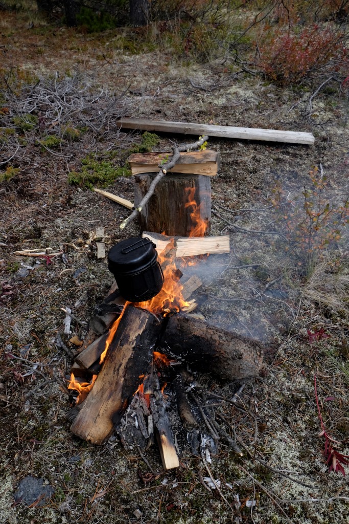 Atraduši mīlīgu vietiņu aizvējā, nolemjam ieturēt tējas pauzi. Puiši ar nažiem veic iekuru sagatavošanu un sāk būvēt ugunskuru. Neatrazdama sev pielietojumu, prasu, vai drīkstu iekurināt uguni ar sērkociņiem, vai arī šie vēlas praktizēt kādu no savām dzirksteļu šķilšanas nodarbēm. Nē, nē, es varot dedzināt. Ieraudzījis manus papīra sērkociņus, Markuss nosaka, ka nez vai kas prātīgs ar tiem sanāks. Pēc pāris minūtēm ugunskurs deg zilās liesmās un Markuss man velta viegli izbrīnītu skatienu. Kad ūdens uzvārījies, Markuss saplūc blakus augošo priežu jaunās skujas un iemet ūdenī – mums ir priežu tēja. Esmu diezgan pārliecināta – ja iniciatīva būtu nākusi no manas puses, Rafaēls viebtos ne pa jokam, bet tagad viņš apmierināti rūc, ka esot dikti laba. Ir jau arī.