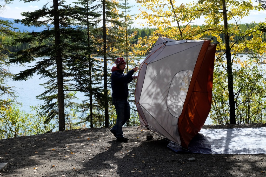 „Tu esi traka”, Rafaēls man paziņo, kad nāku pēc peldes no ezera. Bet šorīt saule tik kārdinoši vizuļoja pa dzidro ūdeni, ka nevarēju atturēties no kārdinājuma. Un, kopš naktīs vairs nesalstu, auksts ūdens vairs nešķiet nemaz tik auksts. Īstenībā tas ir stipri siltāks nekā gaiss. Naktī, ejot uz krūmiem, viss ezers kūpēja kā milzīga pirts baļļa. Pa debesīm lēkāja baltā ziemeļblāzma, bet ļoti vāja, jo pašlaik ir mēness laiks. Izskatās, ka tagad Rafaēls ir pārņēmis no manis salšanas stafeti – kad ielīdu atpakaļ teltī, bija grūti noturēties un nesākt skaļi smieties – ievīstījis starp guļammaisa kapuci un galvu dvieli kā siltumizolāciju un atstādams ārā vien pašu sejas centru, viņš izskatījās pēc milzīga, guļoša teletūbija. Kad Rafaēls cēlās, bija plus trīs grādi, bet šveiciešu pāris, kas ir agrie rīta putni, pamostoties atraduši dzeramo ūdeni sasalušu un kempinga galdu nosarmojušu. Tagad jau ir kādi pieci grādi, bet saulē viss šķiet siltāks.