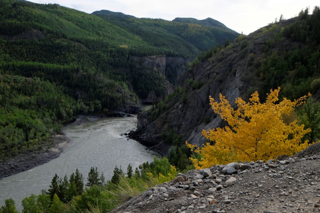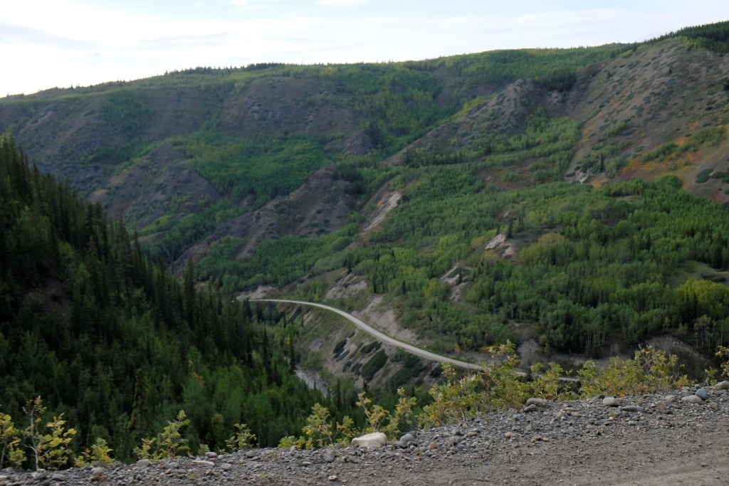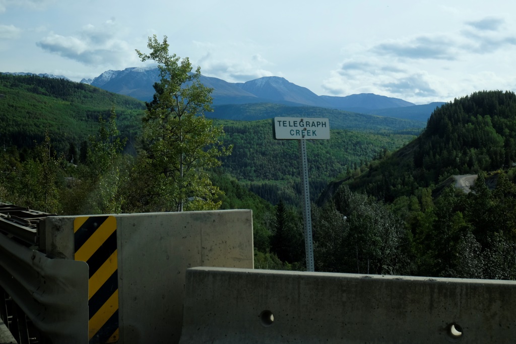 Izbraukuši no kempinga, prātojam, vai sastapsim vakardienas draugu, tomēr nē, šis droši vien devies rīta gaitās citā virzienā. Pēc pāris stundām, apstājušies benzīntankā, satiekam… šveiciešu pāri. Kārtējo reizi nosmejamies par šo jaušību un viņi mums pastāsta, ka kilometrus desmit no šejienes esot pavisam mīlīgs kempings, kas maksājot nieka 10 CAN. Sarunājam vakarā tur satikties, bet paši dodamies iekšā sānu ceļā, lai aizbrauktu uz miestu, ko sauc Telegraph creek, Markuss lielīja šo ceļu kā dikti ainavisku esam.
