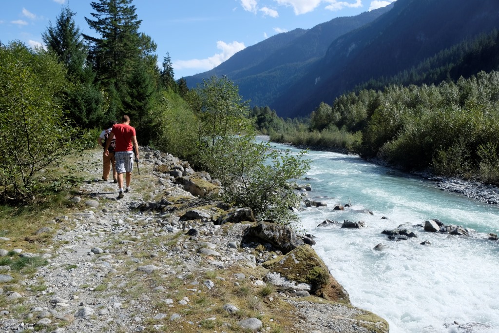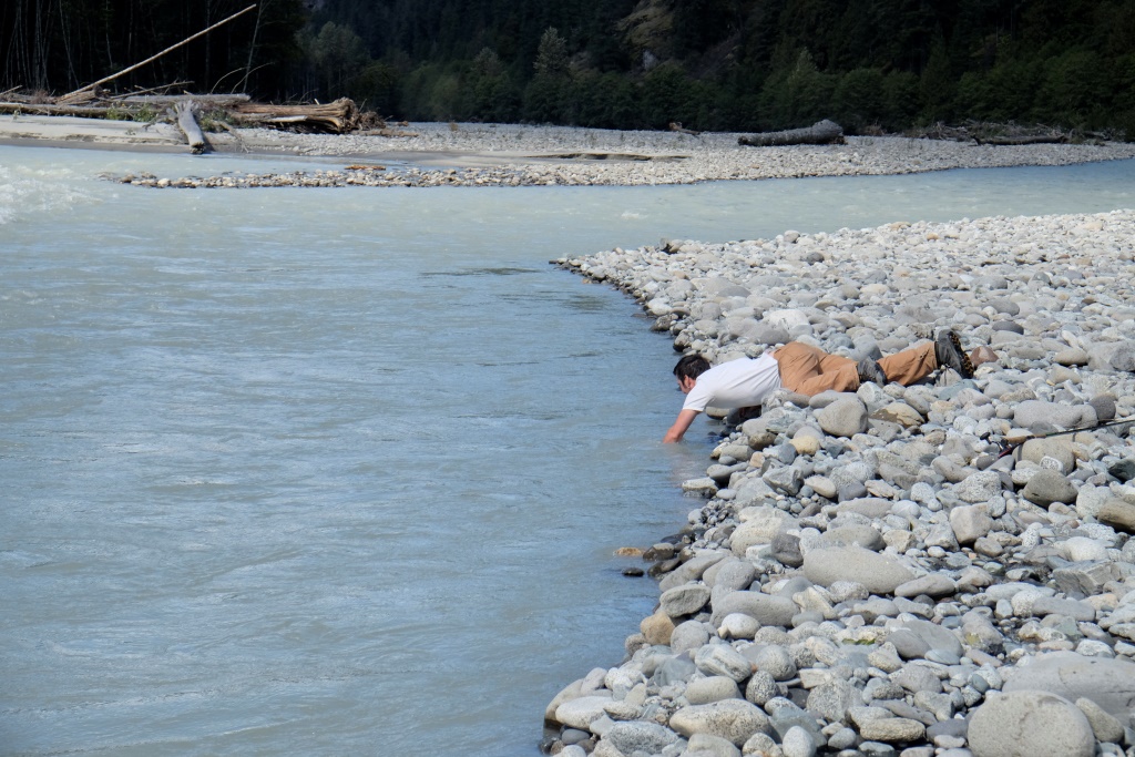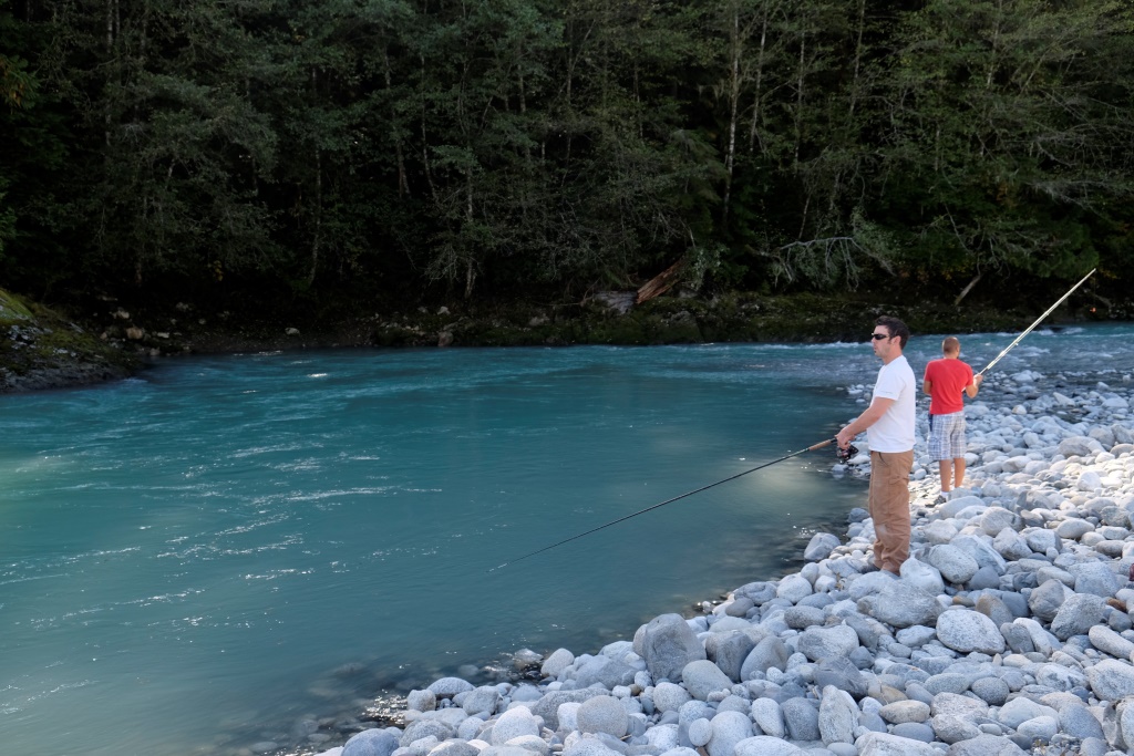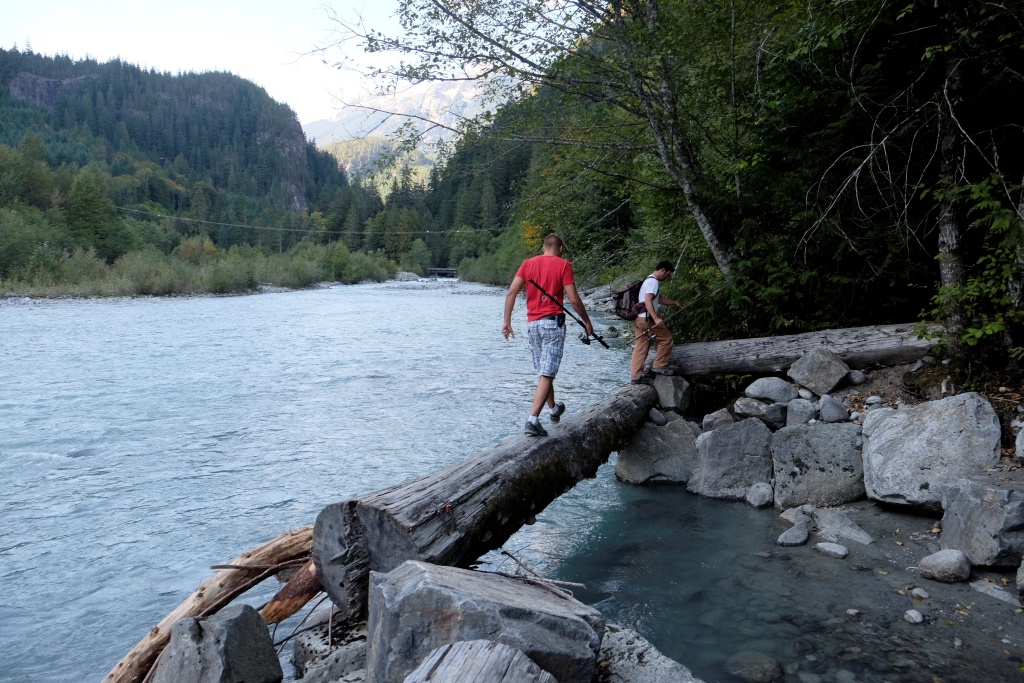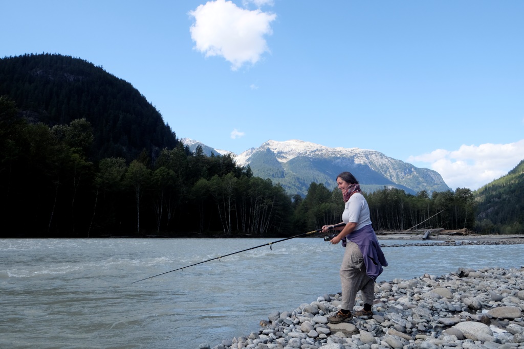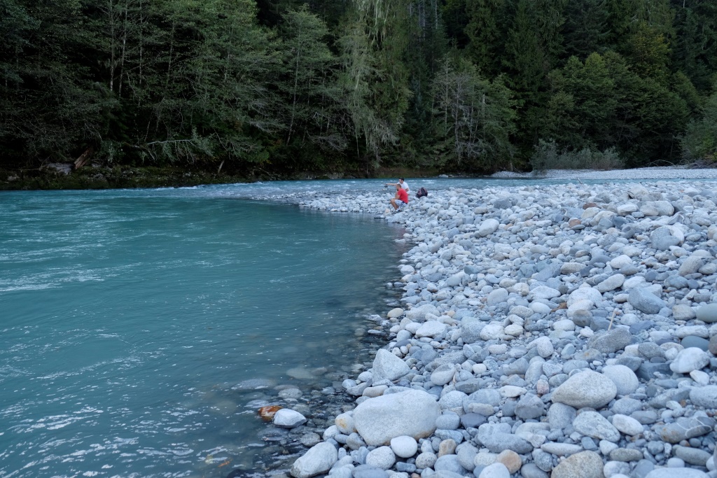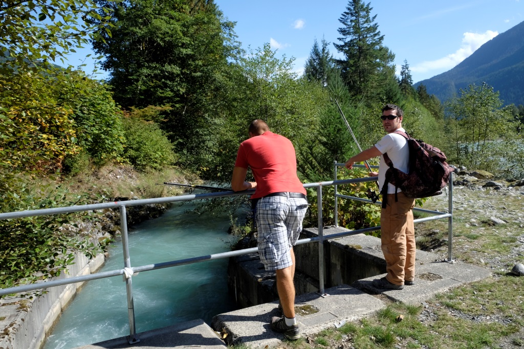 Iesākumā braucam pa šoseju, bet tad pa zemes ceļu nozūdam rudenīgajā mežā. Piestājam un izmēģinām veiksmi kādā smukā vietā ceļmalā – bet zivis neķeras ne uz āķa, ne arī dodas rokā, kad Dainis izmēģina neordinārākas zvejošanas metodes. Tad pārbraucam gabaliņu tālāk uz puišiem zināmām vietām. Zivis te netrūkst, īpaši šaurākās un seklākās vietās var redzēt tumšo muguru mudžēšanu. Iekārtojamies glītā līcītī un vilinām peldētājas. Ik pa laikam Edgars man piešķir savu makšķerkātu, lai arī es varu pavingrot. Vienā brīdī mums abiem ar Daini pieķeras pa zivij, faktiski vienlaikus. Nonākusi krastmalas akmeņos, manējā zivs notrūkst no āķa un, pirms Edgars paspēj to nofočēt, šai izdodas ar slaiku lēcienu tikt atpakaļ upē. Dainis savējo palaiž vaļā, jo tā ir pārāk kusla. Tā nu mēs dodamies mājās – ar noķertiem kalnu skatiem un labi pavadītas dienas sajūtu.