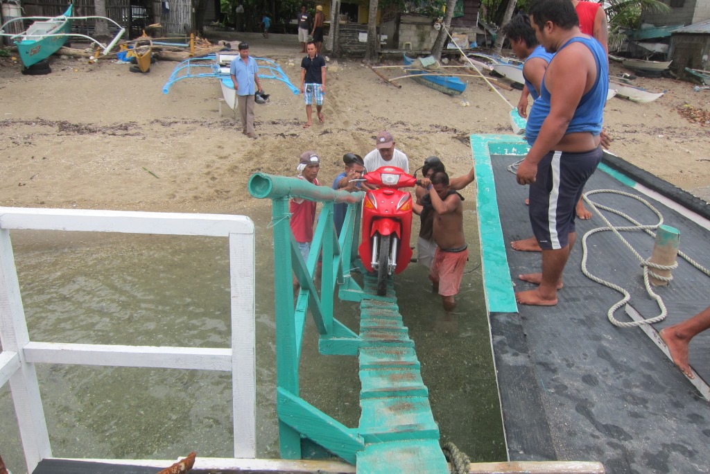 Ap stūri tiešām gaida laiva, tieši tāda, kādu biju iedomājusies. Cikos laiva aties? Tad, kad kapteinis būs paēdis. Izklausās loģiski. Tikmēr uz peldlīdzekļa tiek krauti celtniecības materiāli un stumti motorolleri. Drīz kapteinis ir klāt un varam doties ceļā. “Paēdis kapteinis ir labs kapteinis”, es nodomāju. Prom no krasta laiva tiek dabūta ar gara mieta palīdzību, pēc tam tiek piedarbināts motors un peldam uz kaimiņu salu. Brauciens ir burvīgs, ūdens šļakstās ap laivu, laivā klunkšķ degvielas kannas un pepsikolas pudeles. Pamanu tādus kā mazus putniņus aizspurdzam virs paša ūdens un tad nez kāpēc atkal pazūdam tajā. Ā, lidojošās zivis, man pielec.