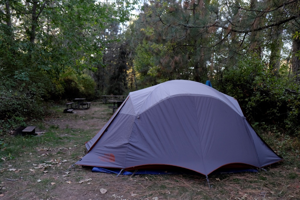 Lai arī šajā pilsētiņā bija pieejama lēta palikšana zem jumta, šoreiz Rafaēls vedināja atkal palikt kempingā, ko es, ar prieku un ne bez izbrīna, akceptēju. Nez, būs šim beidzot arī taupības muša iekodusi. Pieturam vienīgajā meža pudurītī, kas skaitās štata parks, un nolūkojam ar kājām pieejamu palikšanas vietu par 12 USD. Un, pats galvenais, šeit ir dušas. Uzcēluši telti, pēc kārtas ejam “peldēties”, tik laba sajūta pēc vairākām dienām izmazgāt matus. Ārā pagaidām ir silts, mati izžūst viens un divi.