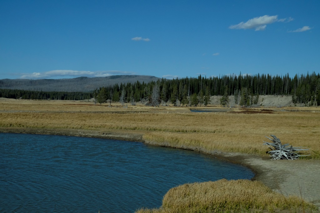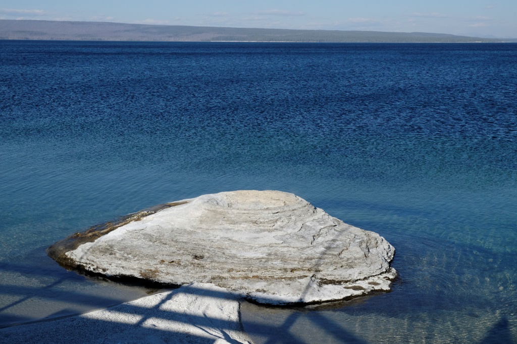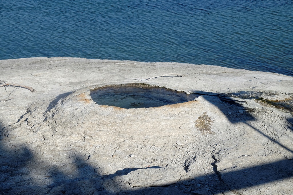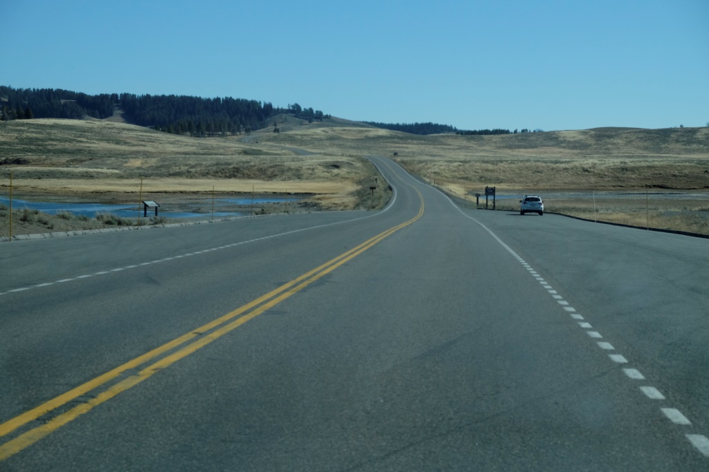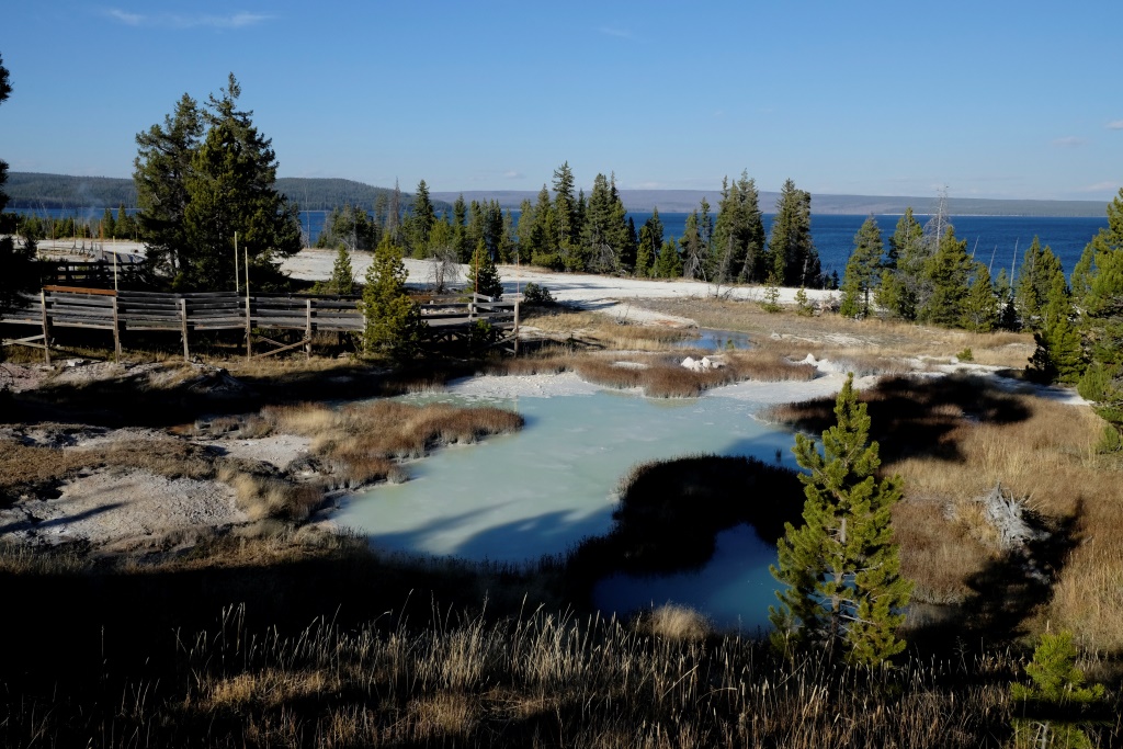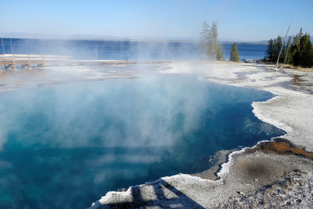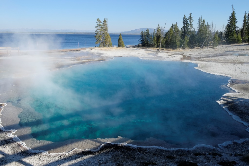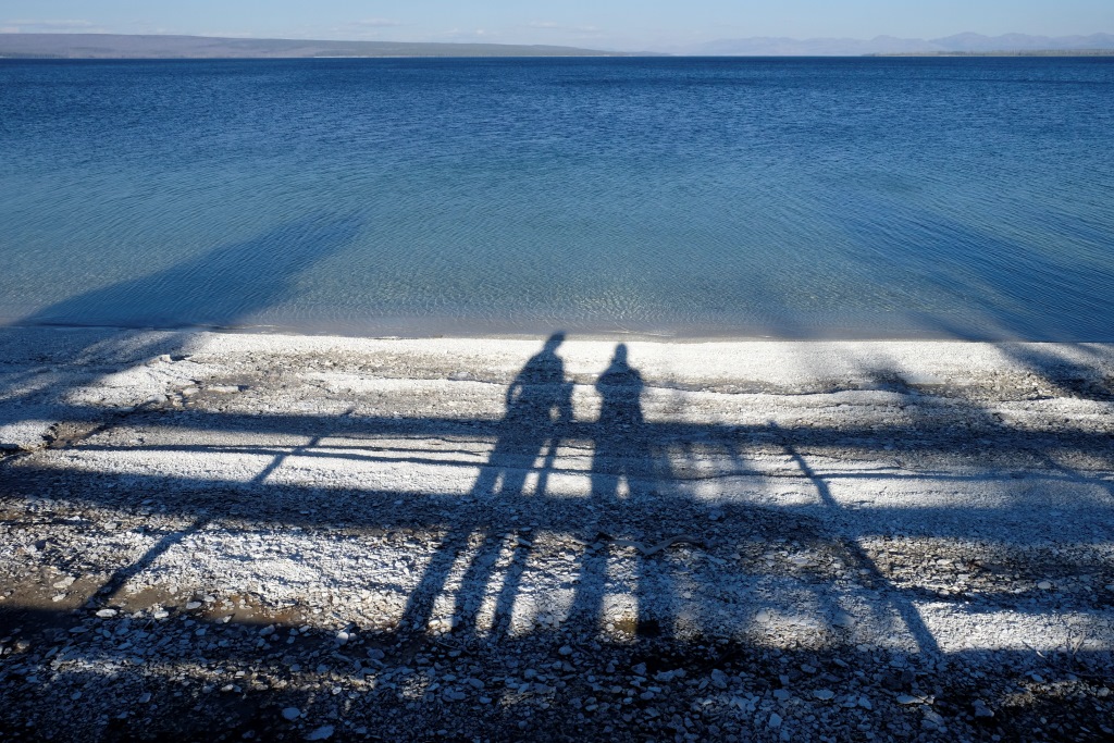 Vakara pusē piestājam pie vienas no geizeru apskates vietām, kas atrodas lielā Yellowstone ezera krastā. Takas sākuma galā Dunkans iepaliek un kaut ko mums māj, ko mēs uztveram kā paziņojumu, lai mēs veicam visu takas garumu, viņš mazliet atpūtīsies un dosies atpakaļ. Labi. Mēs izejam taku, safotografējam apkaimi, nonākam atpakaļ pie auto un gaidām Dunkanu. Pēc 20 minūtēm saprotam, ka tomēr jāiet viņš meklēt. Vienmēr šādās situācijās drusku uztraucamies, astoņdesmit gadi tomēr nav nekāds nieks. Mazums, būs ievēlies kādā geizerī, palicis slikti ar sirdi, apmaldījies. Visticamāk, viņš vienkārši saticis kādu un iegrimis sarunā par dzīves jēgu. Šajā ceļa posmā, mūsu biežāk lietoto frāžu krājumā parādījušās trīs jaunas – “Where is Duncan?”, ko lietojam mēs ar Rafaēlu, jo Dunkans regulāri pamanās kaut kur nozust. “You are doing a great job!” ir Dunkana jaunievedums, ko viņš velta cilvēkiem gan nopietni, gan zobojoties. Mūsu savstarpējā saziņā tas, protams, notiek ķircināšanas nolūkos. Trešā ir “how much for ….?” – ja Dunkanam iepatīkas kāda cita cilvēka manta, viņš parasti pa jokam apvaicājas, cik maksātu to iegādāties. Tā viņš mūsu ceļojuma sākumā tika pie cepures ar uzrakstu “Beer police”, jo veikala darbinieks, kas to nēsājis, arī neesot kautrējies nosaukt cenu, ko parasti cilvēki tomēr nedara.