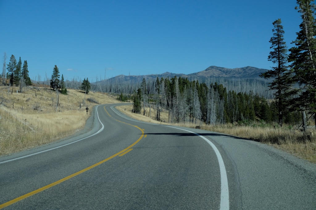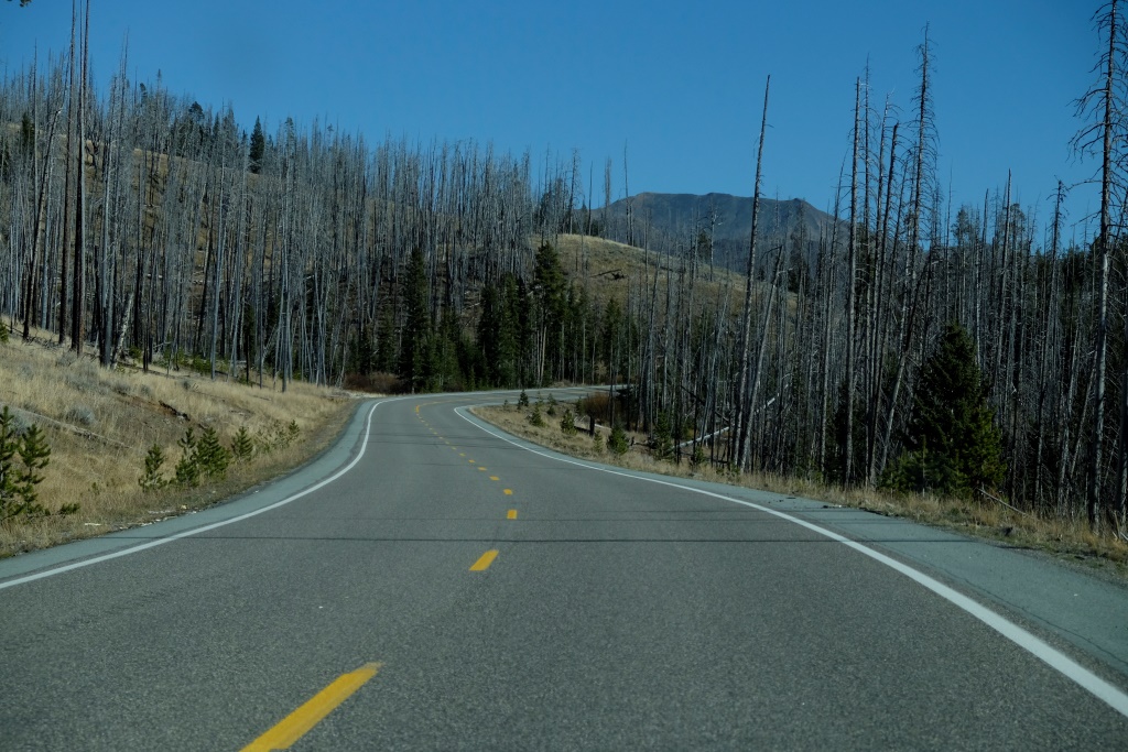 Apskates tūrē sekojam padomiem, ko Dunkanam devis kāds no nejauši satiktajiem sarunu biedriem, kas 25 gadus strādājis šajā parkā par gidu. Pusdienlaikā pabraucam ārpus centrālā ceļu loka, lai apskatītu kalnu pāreju. Apkaime ir mazliet spocīga, jo šeit plosījies plašs meža ugunsgrēks. Jaunie, zaļie kociņi vēl ir pavisam nemanāmi, bet visapkārt slejas pelēkie koku stumbri.