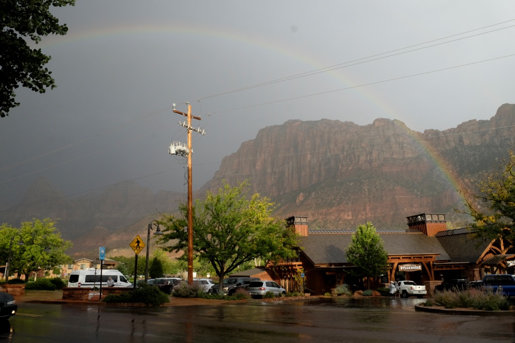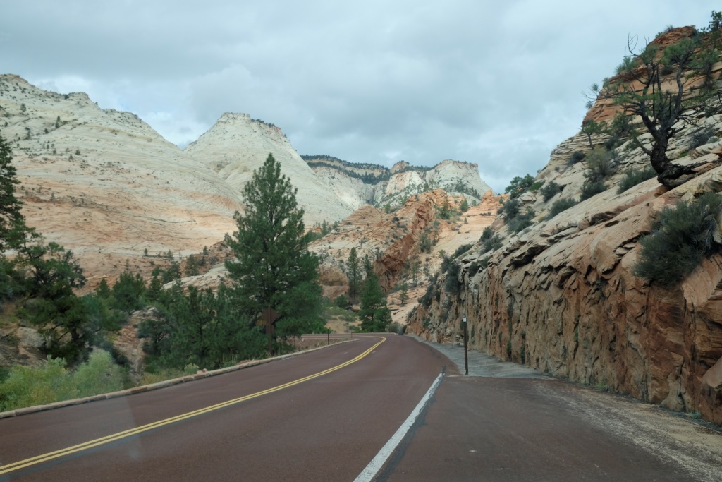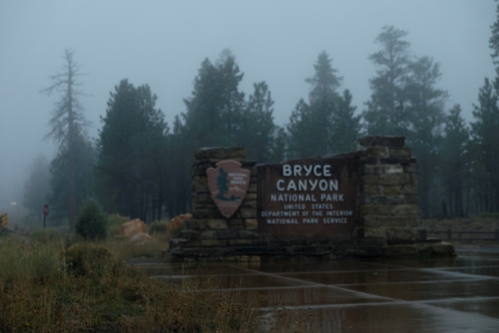 Jo tuvāk braucam, jo stiprāk līst un migla top aizvien biezāka. Pieklājības pēc iebraucam parkā, jo mums ir gada abonoments ASV nacionālajiem parkiem (kas jau n reizes atmaksājies), lai pārliecinātos, ka neko vairāk par miglu šodien neredzēsim. Braucam vien tālāk uz Zion, cerot, ka tur būs mazliet citāda aina.
