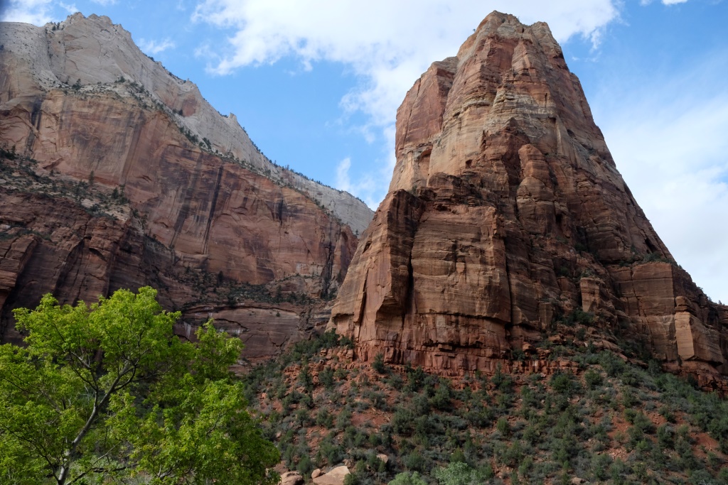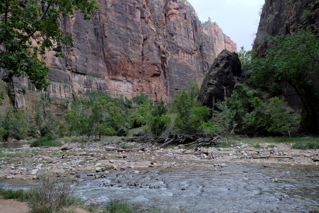 Kad māja gatava un vēderi pilni, sēžamies shuttle autobusā un dodamies cauri visam parkam, līdz esam klāt gala pieturā, no kuras sākas pastaigu taka gar upi. Paejamies pa to, līdz nonākam vietā, kur sākas viens no slavenakajiem šī parka pārgājienu maršrutiem – “Narrows”. Lai tiktu līdz tam jābrien pa upi, kas nav diez ko silta. Viens no riskiem ir pēkšņu plūdu draudi un šodien to iespējamība ir visai augsta. Iztiekam ar iespaidīgo klinšu aplūkošanu un jau griežamies riņķī, lai dotos atceļā, kad mana auss uztver pazīstamas skaņas. Latviešu valoda! Protams, dodos pie tautiešiem mazliet patērzēt – arī viņi vakar bijuši Bryce, tikai paspējuši pa dienu to aplūkot labākos laika apstākļos. Uz atvadām nofočējamies – šī satikšanās man šķiet kā jauks papildu apliecinājums, ka šī ir īstā jaušību diena.