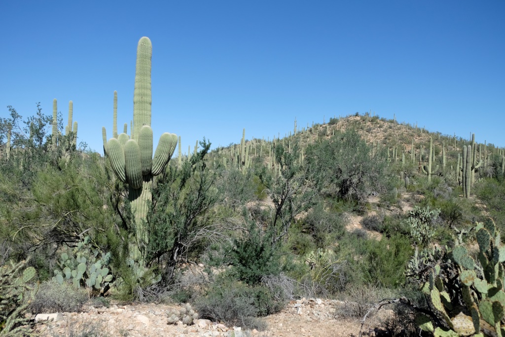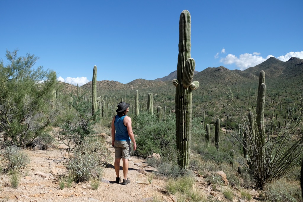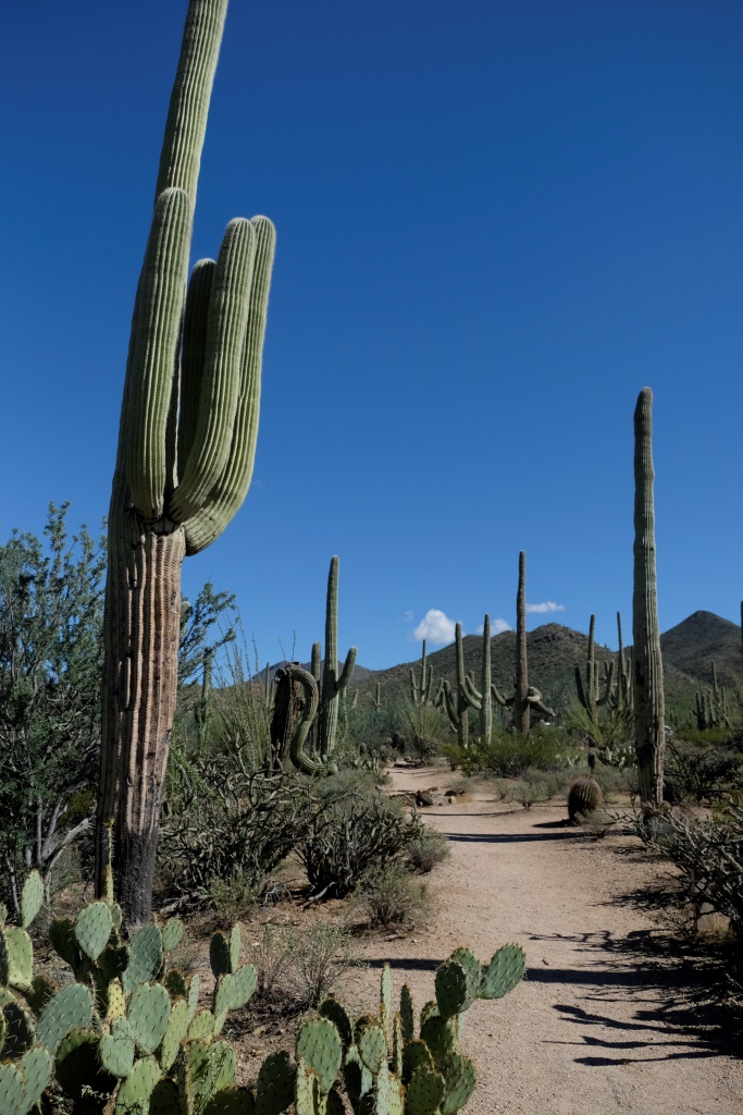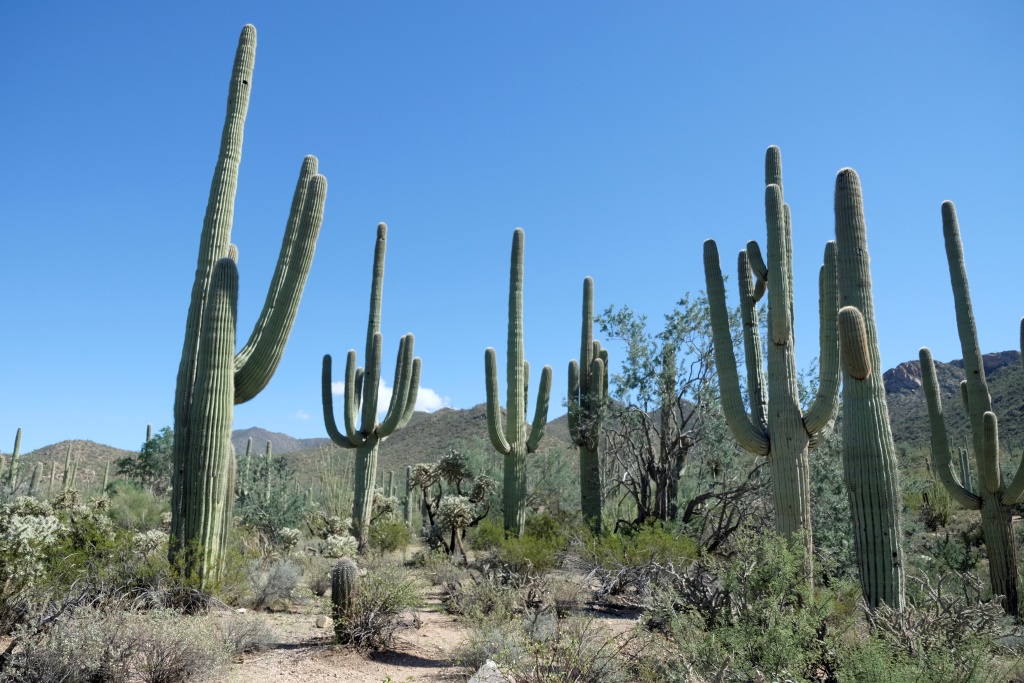 Par Saguaro nacionālā parka tuvošanos liecina kaktusi, kas no maziem krūmeļiem lēnām pārtop milzīgos kokos. Nacionālais parks nosaukts pašu kaktusu – saguaro vārdā. Šie kaktusi var sasniegt 18 metru garumu, bet sānu dzinumus sāk radīt vien 70 gadu vecumā. Pirms apciemot lielos augus, noskatāmies informācijas centrā filmu par šo parku, tajā indiāņi stāsta par saguaro nozīmi viņu kultūrā. Indiāņi tic, ka mirušie pārdzimst saguaro, tāpēc izturas pret kaktusiem ar lielu cieņu, tāpat arī tuksnesi.