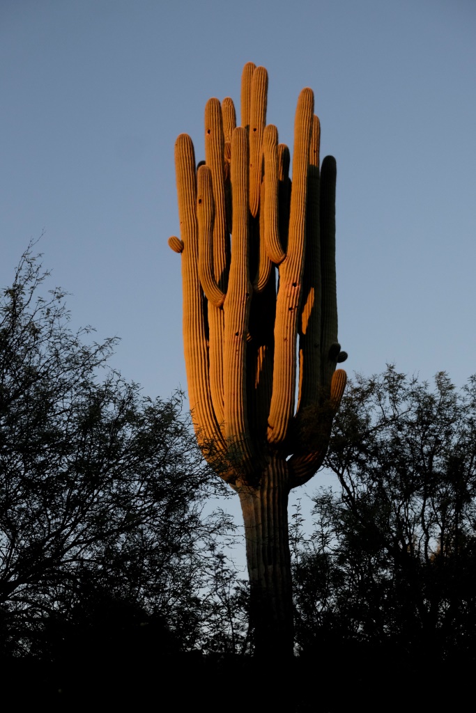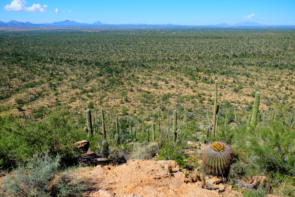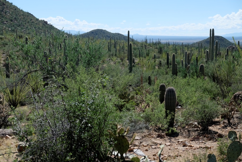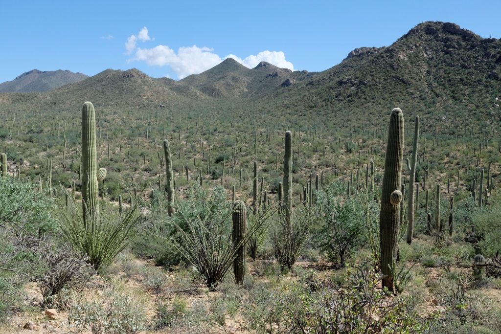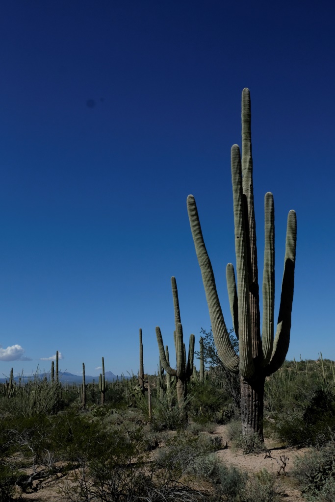 Par Saguaro nacionālā parka tuvošanos liecina kaktusi, kas no maziem krūmeļiem lēnām pārtop milzīgos kokos. Nacionālais parks nosaukts pašu kaktusu – saguaro vārdā. Šie kaktusi var sasniegt 18 metru garumu, bet sānu dzinumus sāk radīt vien 70 gadu vecumā. Pirms apciemot lielos augus, noskatāmies informācijas centrā filmu par šo parku, tajā indiāņi stāsta par saguaro nozīmi viņu kultūrā. Indiāņi tic, ka mirušie pārdzimst saguaro, tāpēc izturas pret kaktusiem ar lielu cieņu, tāpat arī tuksnesi.
