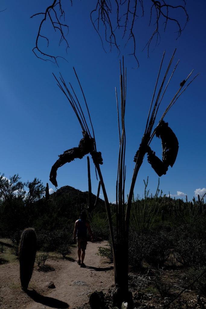 Ejot pa šī parka takām uzmanība jāsadala starp kaktusu apbrīnošanu un zemi zem kājām – tur rosās skudras, ķirzakas un citi kustoņi. Nevienu čūskuli vai biedējošu zirnekli gan nesastopam, bet plakāti mudina no tiem piesargāties. Esmu atkal izvilkusi no reti lietojamo mantu tašas savu pretbišu indi un nēsāju to visur līdzi. Šeit mītot Āfrikas bites, kas esot diezgan nešpetnas dabas, pagaidām gan nevienu nemana.