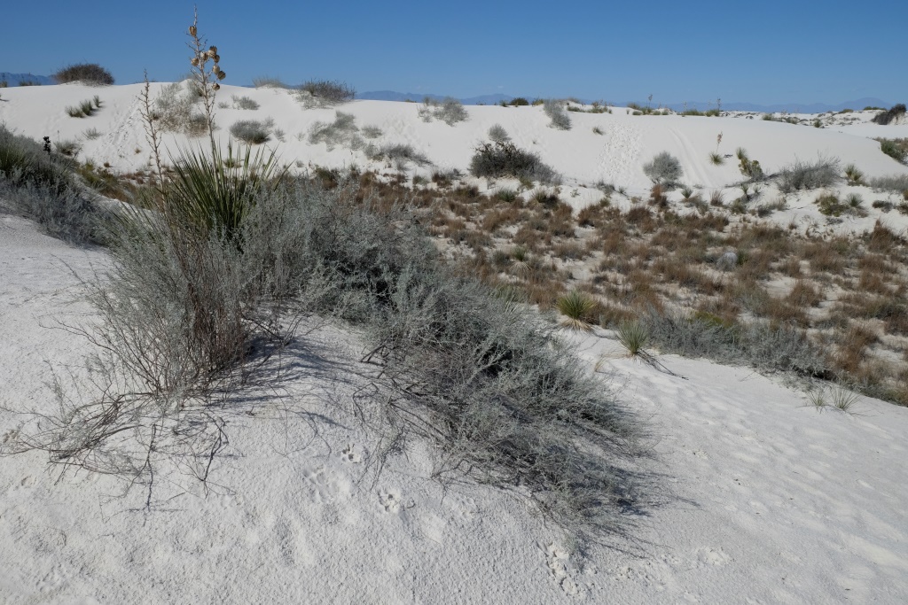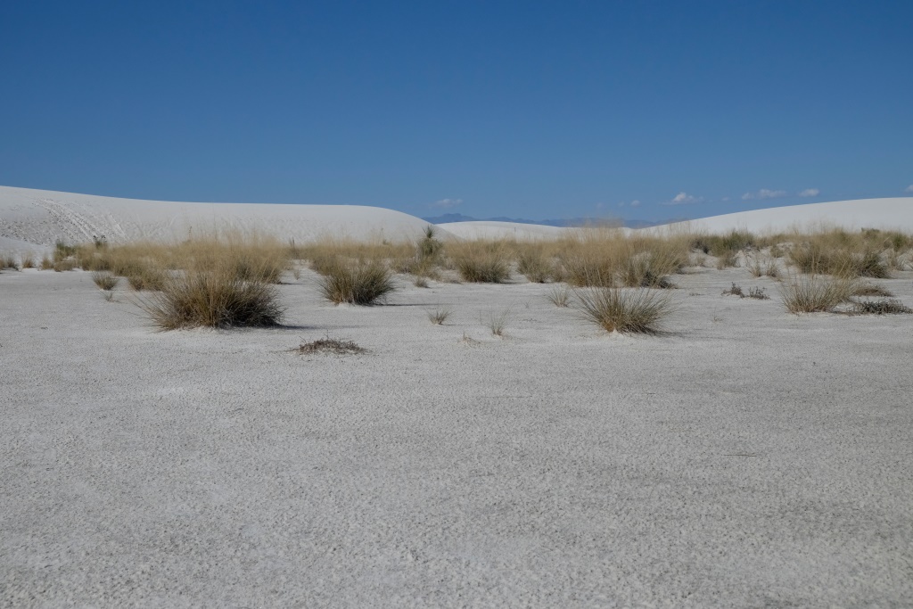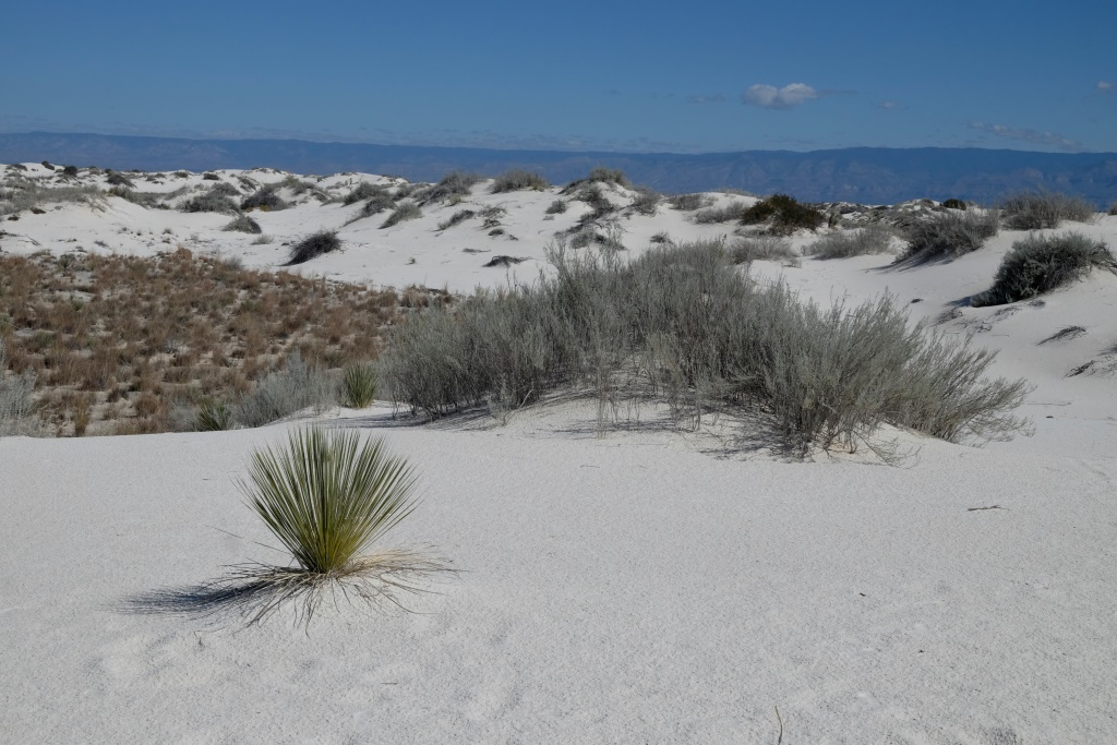 Piebāzuši pilnu galvu ar militāriem faktiem, dodamies to izvēdināt uz netālo “White Sands National Monument” – balto smilšu tuksnesi. Smiltis ir neparasti smalkas un baltas, jo sastāv no sīkām ģipša daļiņām, šis ir pasaulē lielākais šāda veida tuksnesis. Tas veidojas iesākumā ģipsim izšķīstot ūdenī un kopā ar upes ūdeņiem aizplūstot uz netālo Lucero ezeru. Kad ezers izžūst, ģipsis nogulsnējas tā dibenā kristālu veidā, kurus dusmīgie klajuma vēji salauž sīkākās daļiņās un aizpūš tālāk uz tuksnesi, kas visu laiku nedaudz pārvietojas. Lai tajā izdzīvotu, augiem un dzīvniekiem nākas pielāgoties. Piemēram, ķirzakas, kas iesākumā bijušas tumšā tonī, tagad ir teju baltas. Tas ir lielisks piemērs mūsdienu evolūcijai – tumšākās sugas pārstāves bija vieglāk nomedīt, attiecīgi izdzīvoja gaišākās, nododot savus gēnus pēcnācējiem. Arī augi pielieto dažādus trikus – juka izaudzē īpaši garu stumbru, lai pasargātu ziedus no iepūšanas smiltīs, cits augs, kura nosaukumu neatceros, veido sev īpašu postamentu jeb apaļu, vertikālu saliņu. Sakņu sistēmas piesaistītā ūdens rezultātā ģipsis sacietē, ļaujot augam attīstīties šajā mainīgajā vidē, kā arī dodot patvērumu no saules raibajai tuksneša radībai.